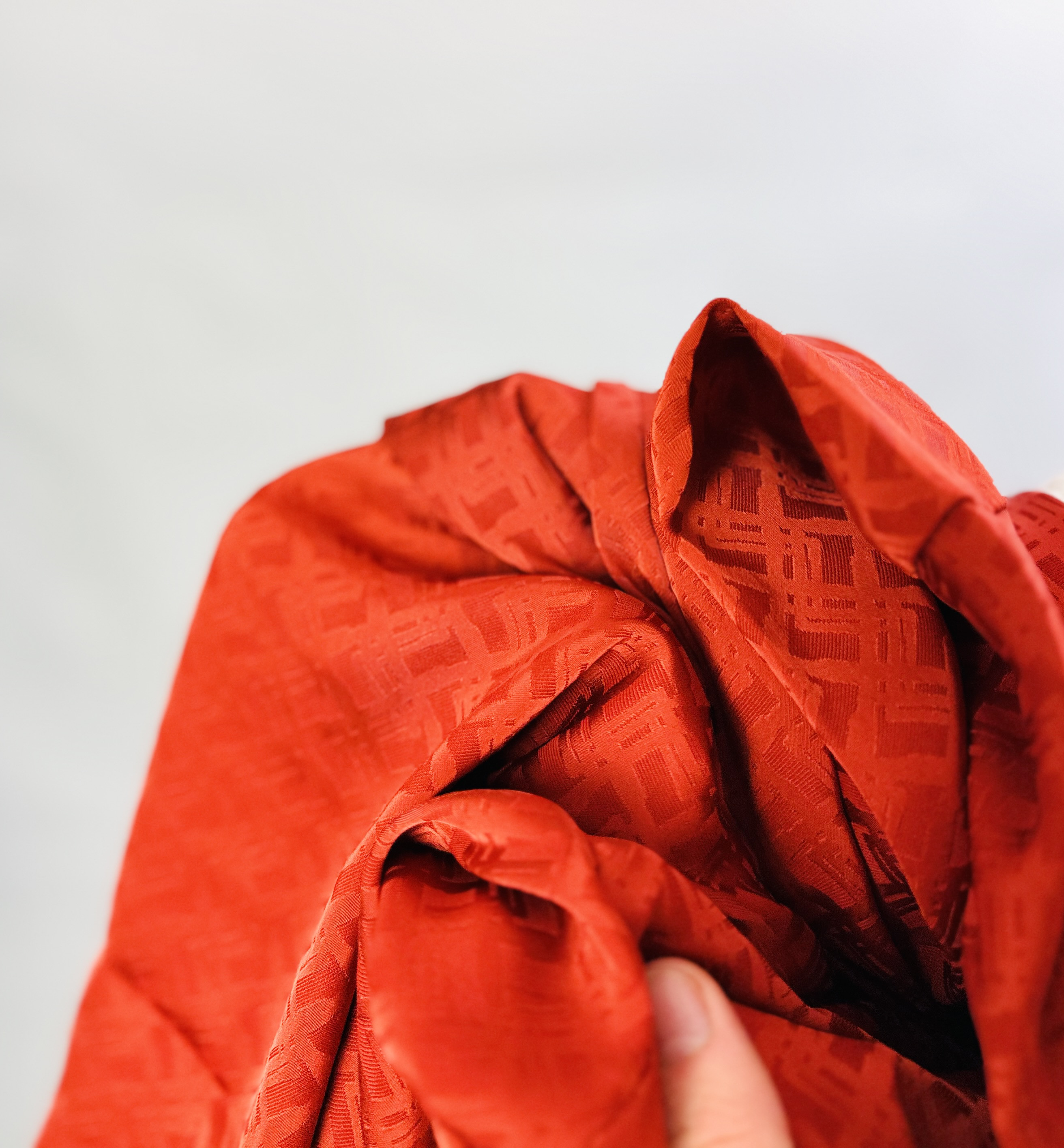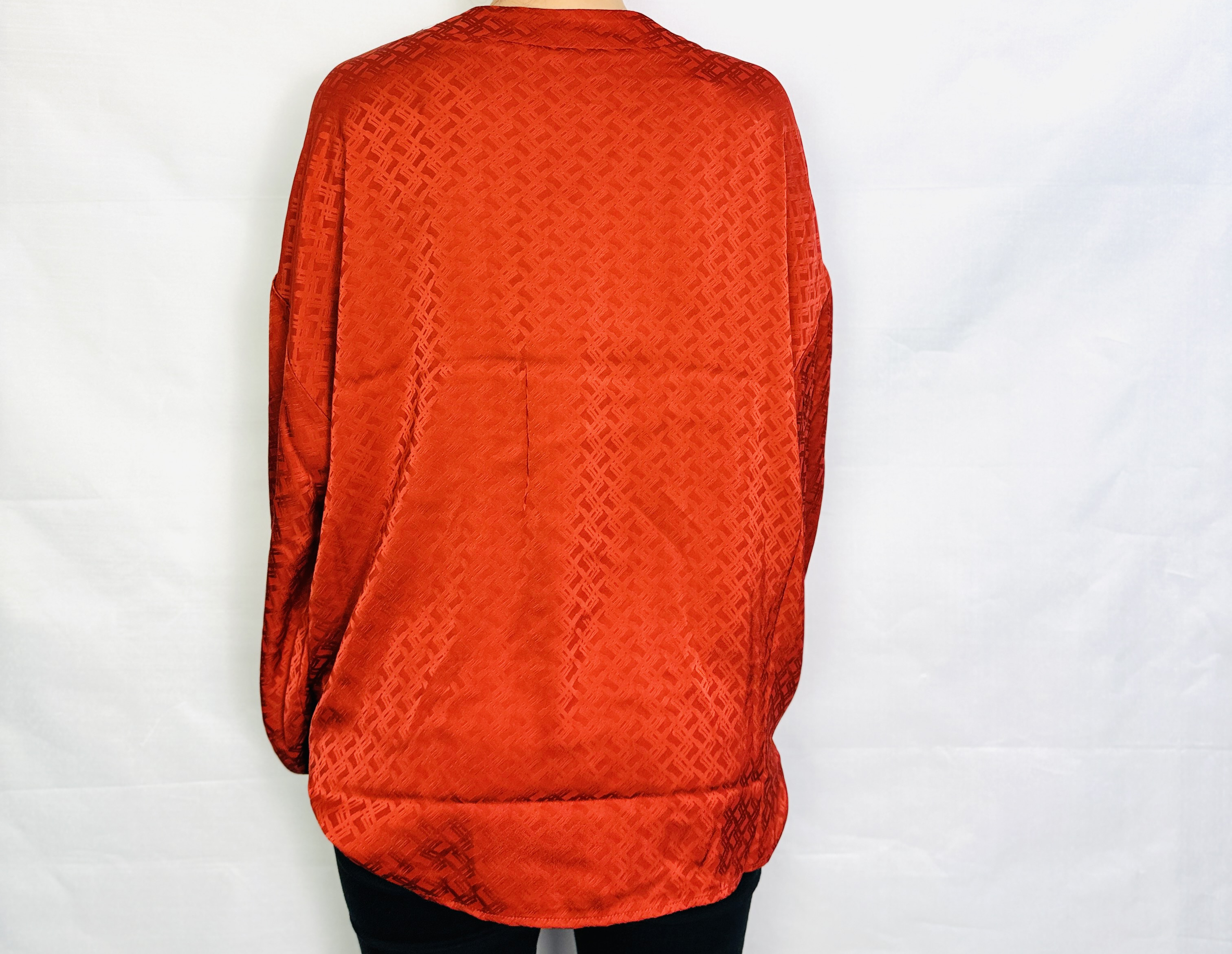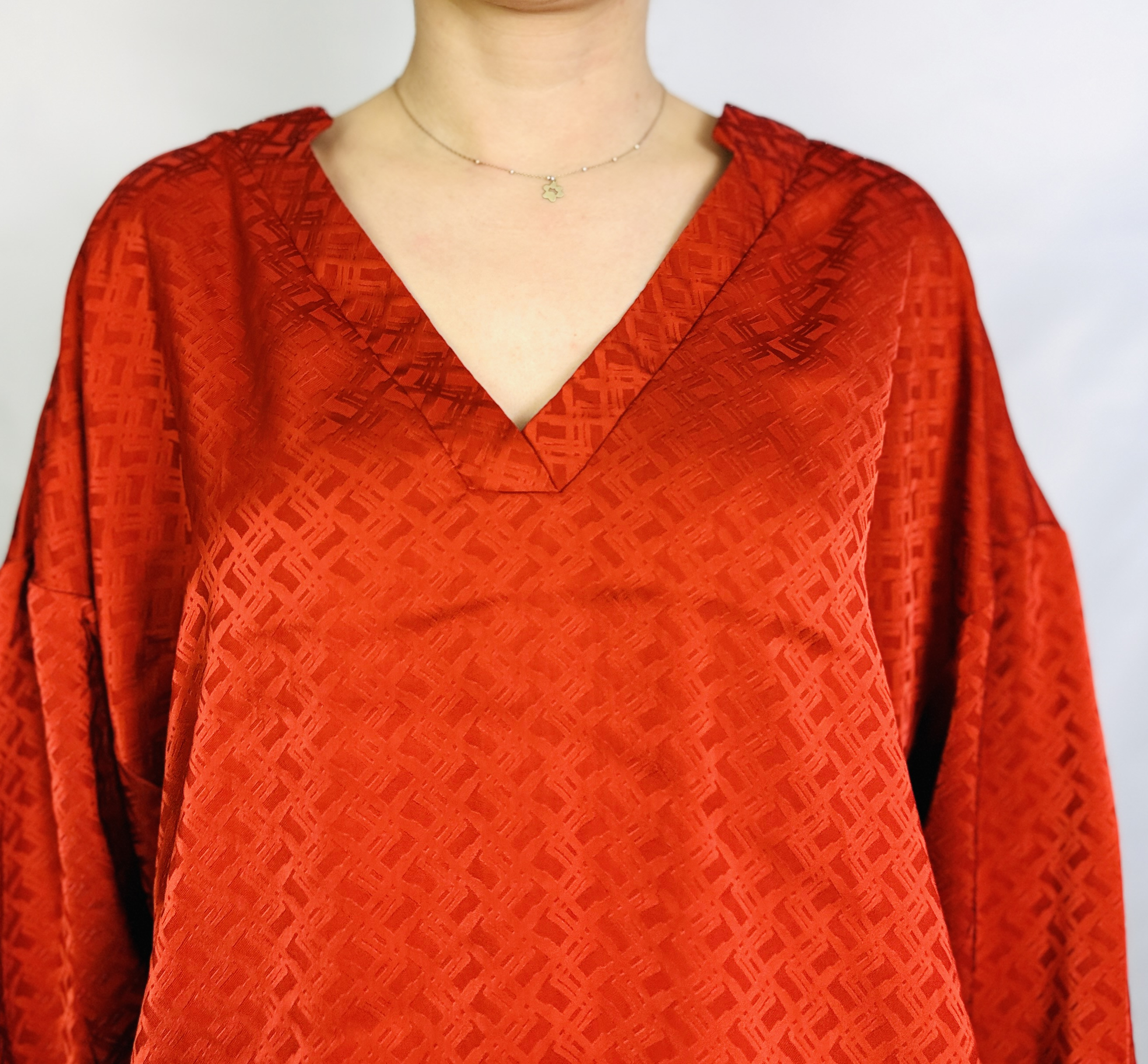 Powierzchnia materiału zdobi drobny, geometryczny wzór o subtelnej fakturze, który nadaje połyskowi głębi i niejednorodności. Tkanina wygląda na gładką, delikatnie połyskującą i miękko lejącą się, co sprawia, że marszczenia oraz naturalne fałdy układają się płynnie i kobieco. Ten lekko lejący charakter materiału dodaje modelowi płynności ruchu i subtelnej lekkości, dzięki czemu bluzka nie tworzy sztywnych linii, a raczej podkreśla naturalne kontury sylwetki.