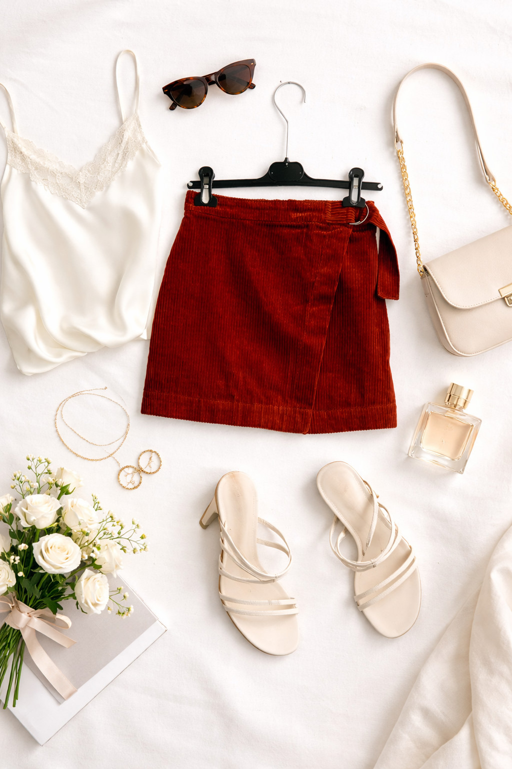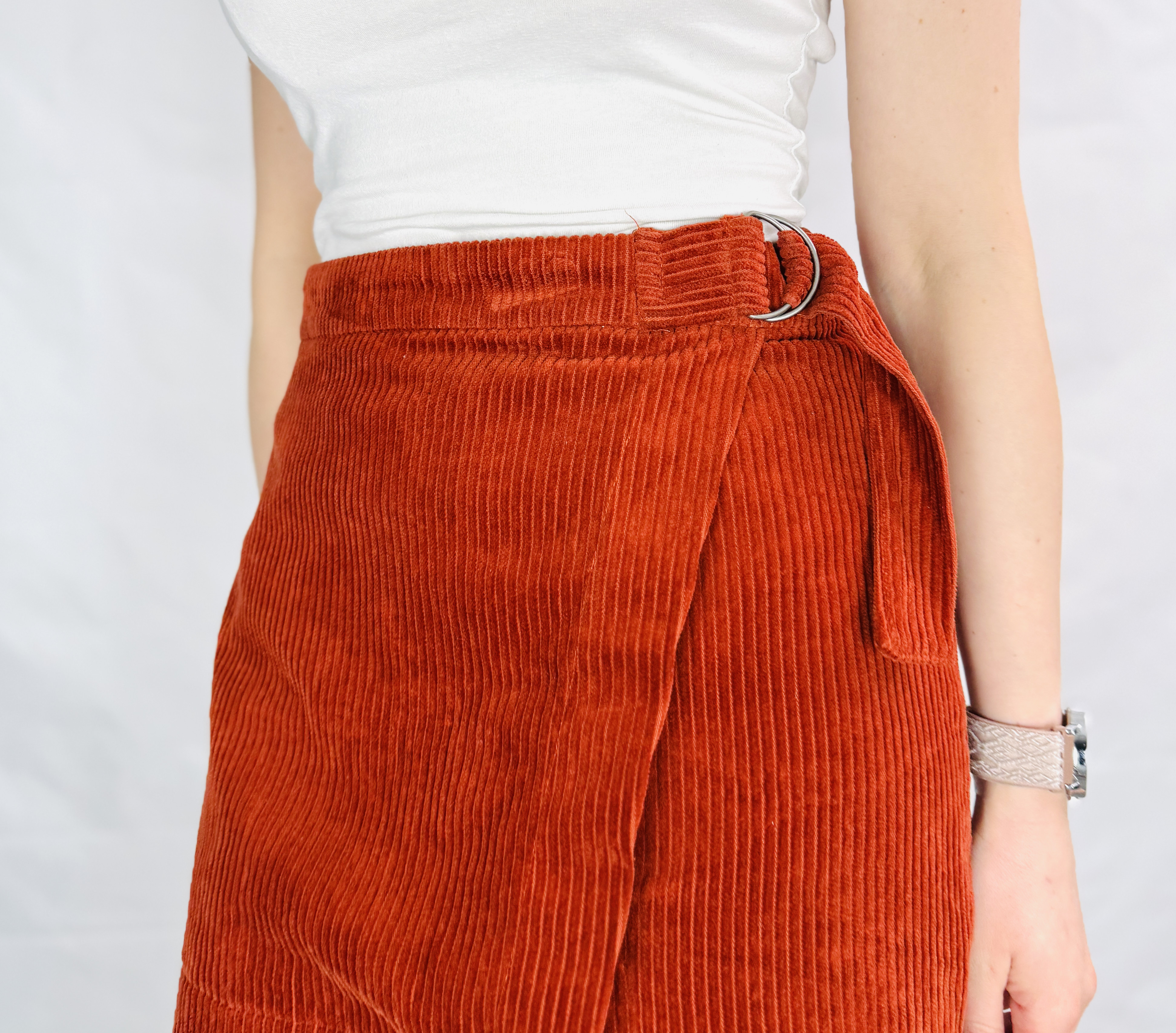 To spódnica o ciepłym, kobiecym charakterze — intensywna miedziana tonacja w połączeniu z klasyczną, pionową prążkowaną fakturą sztruksu tworzy stylowy, przytulny efekt, który brzmi zarówno retro, jak i świeżo. Prostota formy przełamana jest subtelnym zabiegiem kopertowego przodu i ozdobnym przewinięciem w pasie, co nadaje projektowi nieoczywistej lekkości i wyrafinowania. Całość emanuje pewną swobodą z gustownym akcentem, idealną gdy chcemy podkreślić kobiecość bez nadmiaru ozdób.