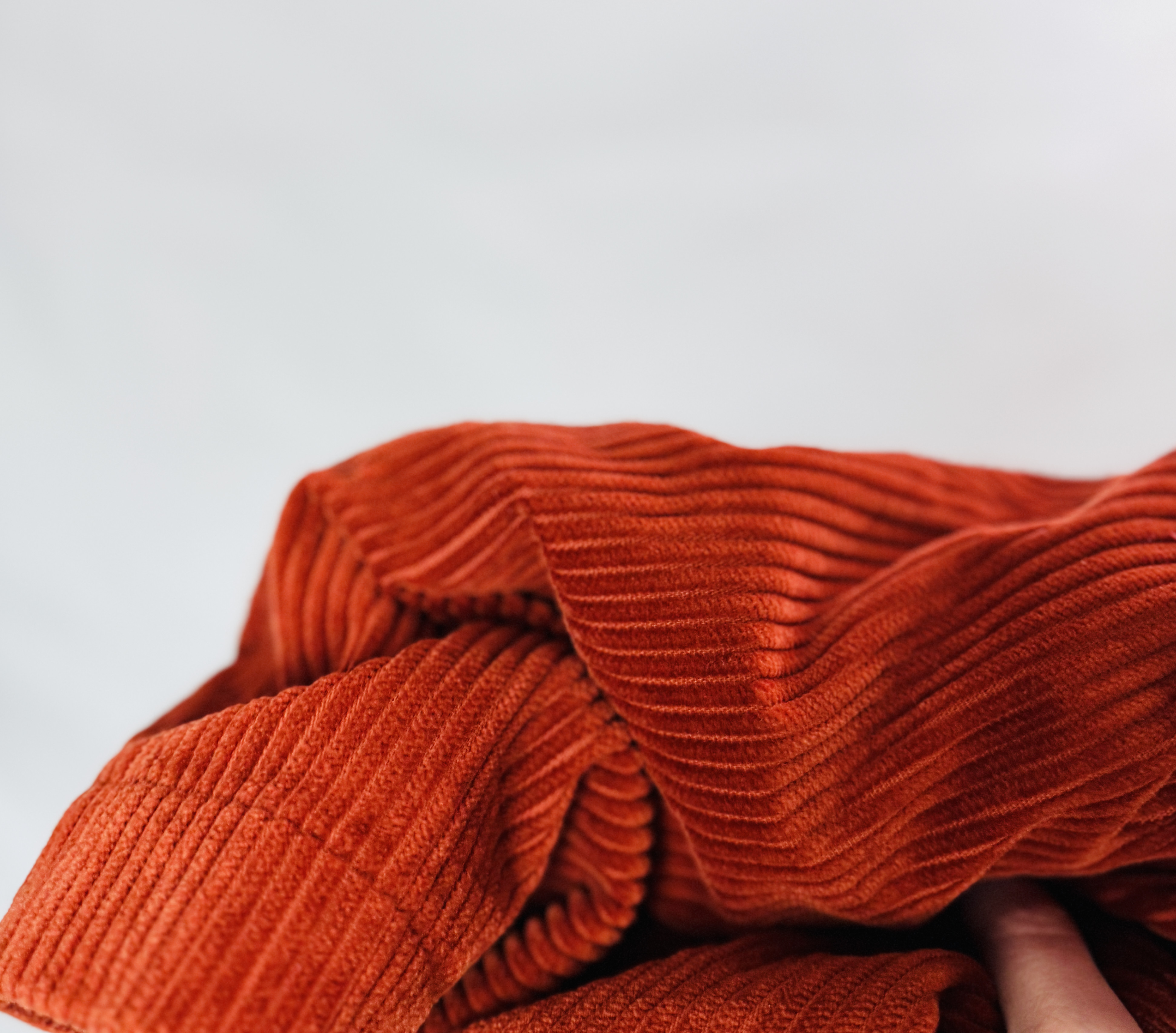 Materiał prezentuje się jako nieco grubszy i otulający, o wyraźnie prążkowanej, sztruksowej fakturze; powierzchnia ma delikatny, miękki połysk i matowe cienie między żeberkami, co nadaje spódnicy głębi i jakościowego charakteru. Tkanina trzyma formę, dzięki czemu przód zachowuje czytelne nachodzenie, a dolna krawędź pozostaje równa i estetyczna. Struktura materiału dodaje projektowi przytulnej, jesienno zimowej aury, jednocześnie podkreślając porządek kroju i akcentując geometryczny rytm prążków.