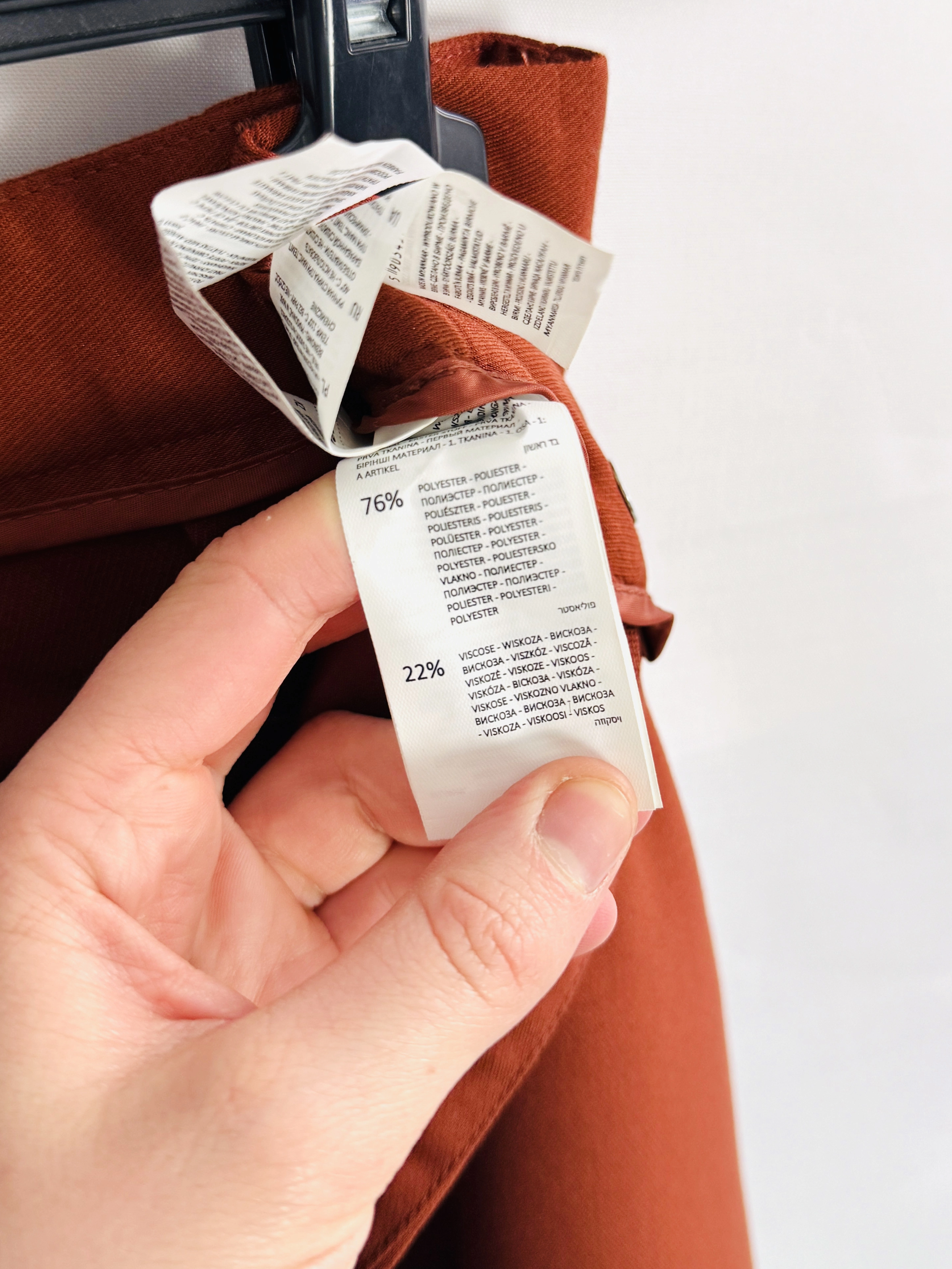Spodnie mają klasyczny pas z szlufkami, co pozwala na noszenie ich z różnorodnymi dodatkami, choć sam pasek nie jest elementem stylizacji. Ten fason sprzyja wysmukleniu sylwetki, podkreślając nogi i nadając proporcje zbliżone do klepsydry. Miedziany kolor dodaje całości ciepła i wyrazistości, które świetnie komponują się z neutralnymi i stonowanymi barwami.