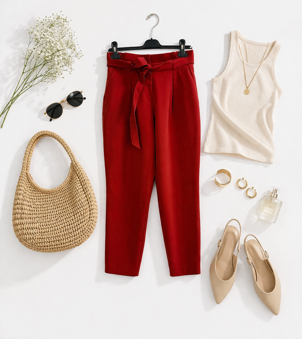 Wysoki stan spodni podkreśla talię, co sprzyja wysmukleniu sylwetki i zbalansowaniu proporcji, szczególnie u kobiet o figurze klepsydry i prostokąta. Wiązanie w talii dodaje całości delikatnej lekkości i kobiecego uroku, nie zaburzając przy tym eleganckiego charakteru spodni. To fason, który subtelnie modeluje biodra, nie dodając im zbędnej objętości, a jednocześnie eksponuje kobiece kształty z klasą i umiarem.