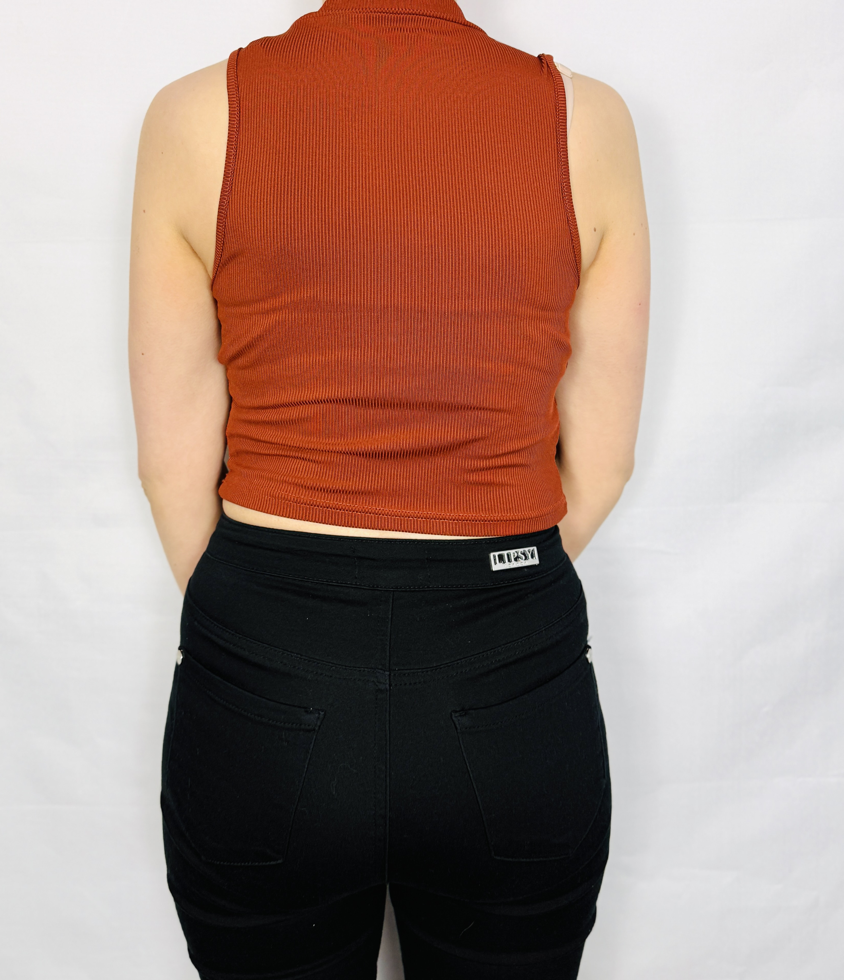Fason jest wyraźnie dopasowany, gładko przylega do sylwetki i podkreśla linię tułowia, dzięki czemu tworzy schludny i kobiecy kontur. Dekolt ma charakter półgolfu — delikatnie otula szyję, dodając całości uporządkowanego, eleganckiego wykończenia, a szerokie wycięcia na ramiona subtelnie eksponują linię barków. Długość sięga tuż do linii talii, co nadaje topowi świeżości i pozwala na różne zestawienia z wysokim stanem spodni lub spódnicą.