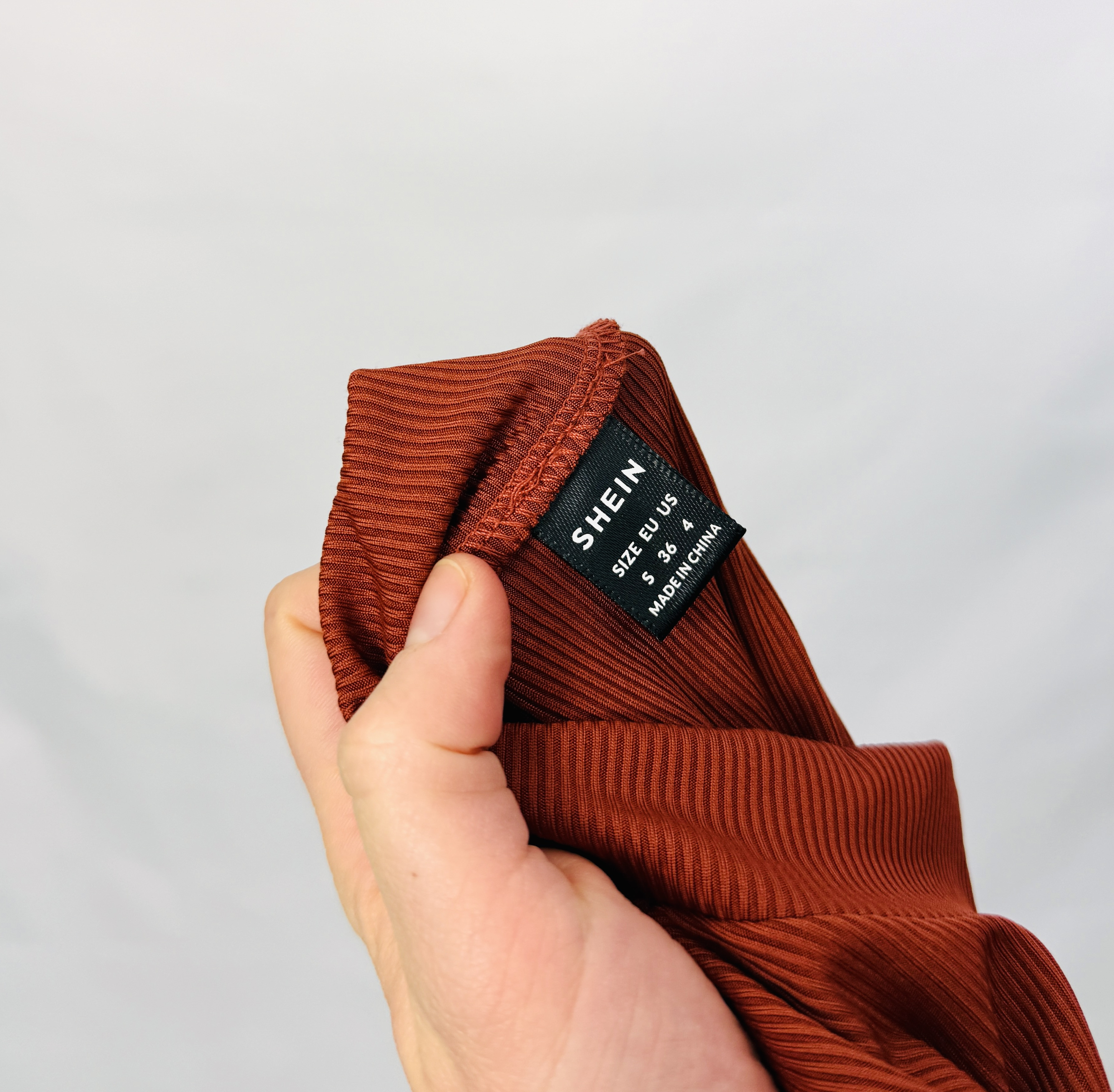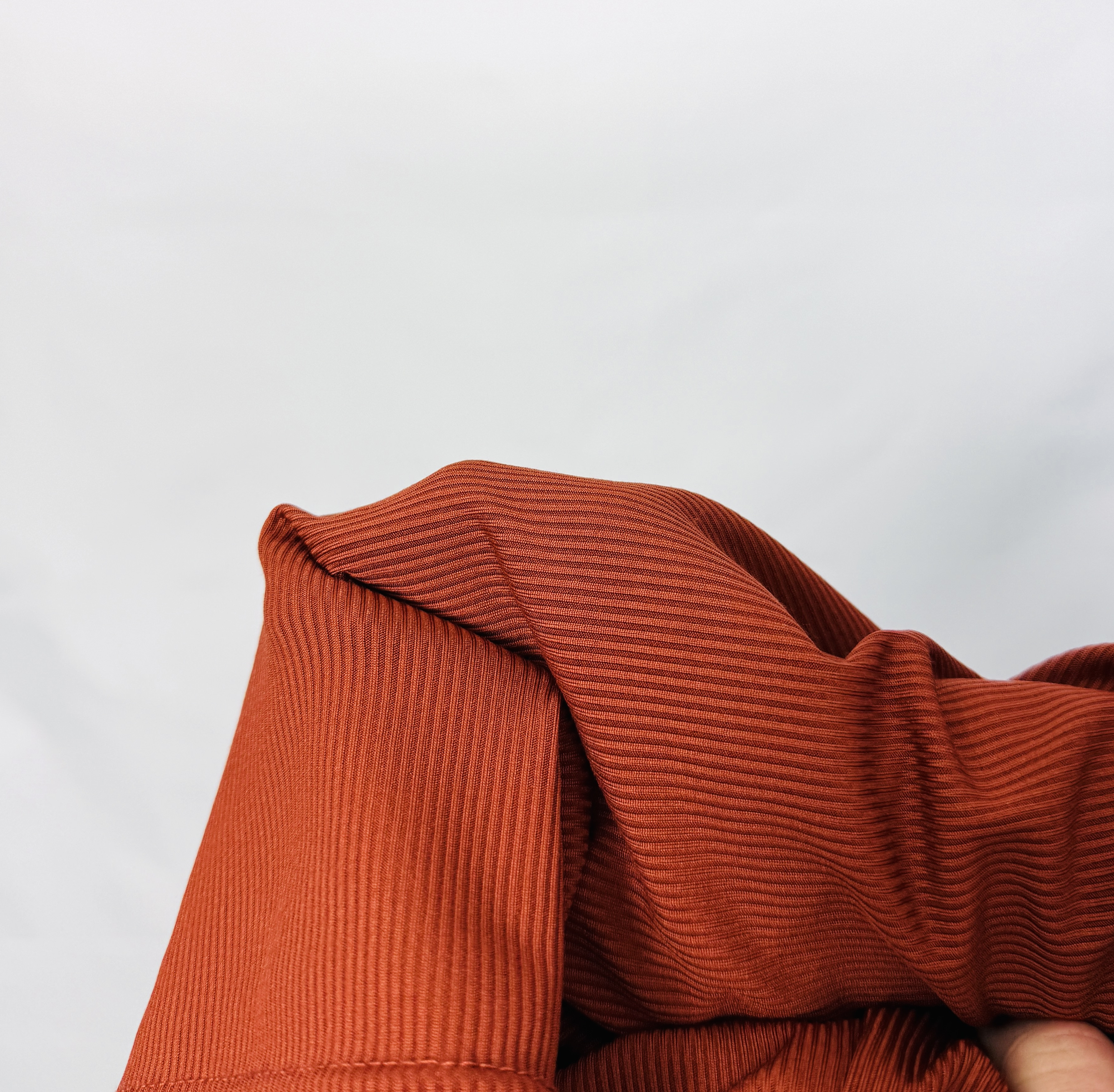 Materiał prezentuje się jako gładka, prążkowana dzianina o wyraźnej elastyczności; pionowe prążkowanie wysmukla sylwetkę, a faktura dodatkowo modeluje powierzchnię, tworząc schludny, dopasowany efekt. Powierzchnia ma delikatny połysk i sprężystość, dzięki czemu top łatwo dopasowuje się do kształtów, podkreślając atuty bez nadmiernego opinania. Ten typ wykończenia daje wrażenie jakości i komfortu — jest zarazem wygodny i efektowny.