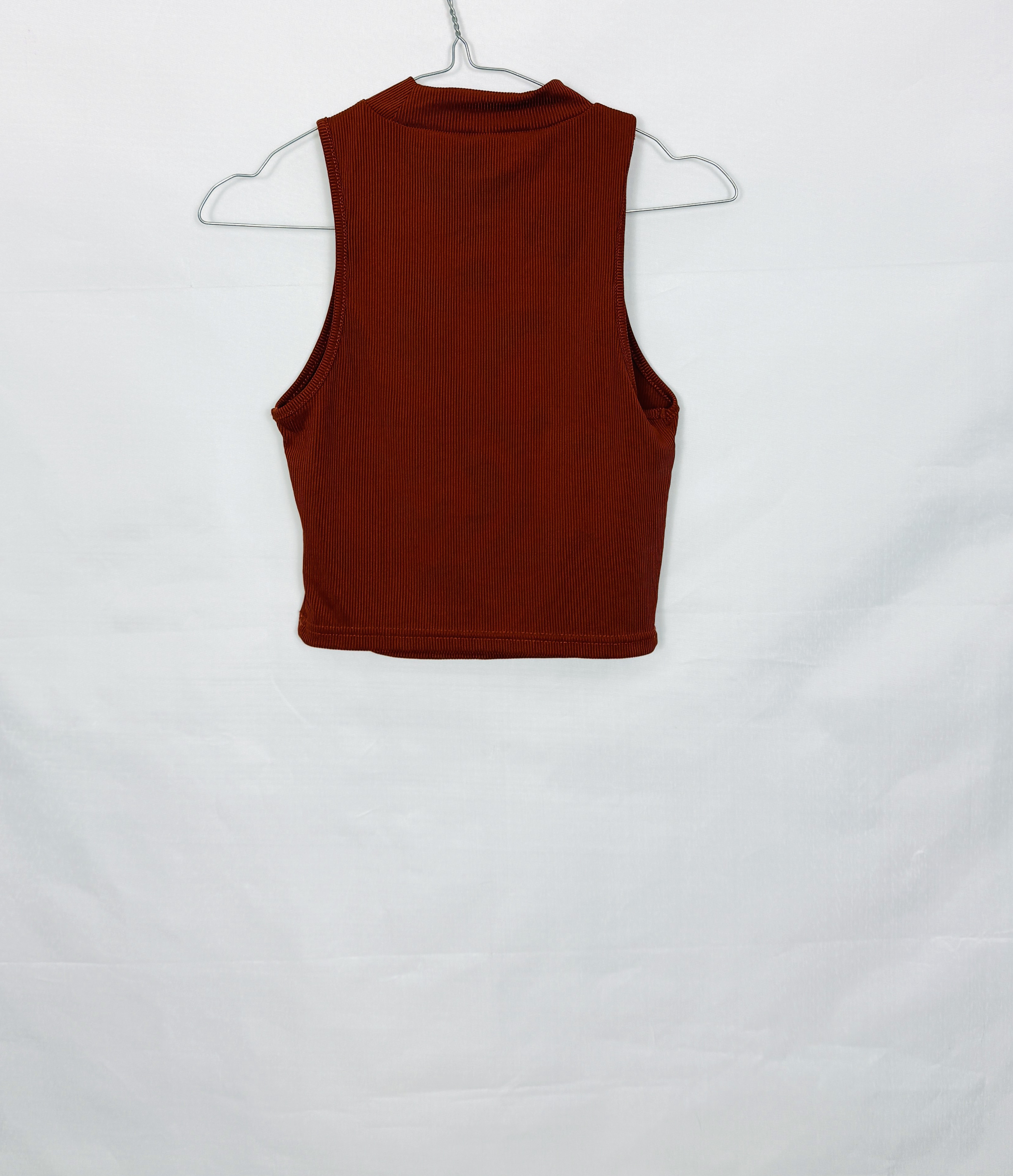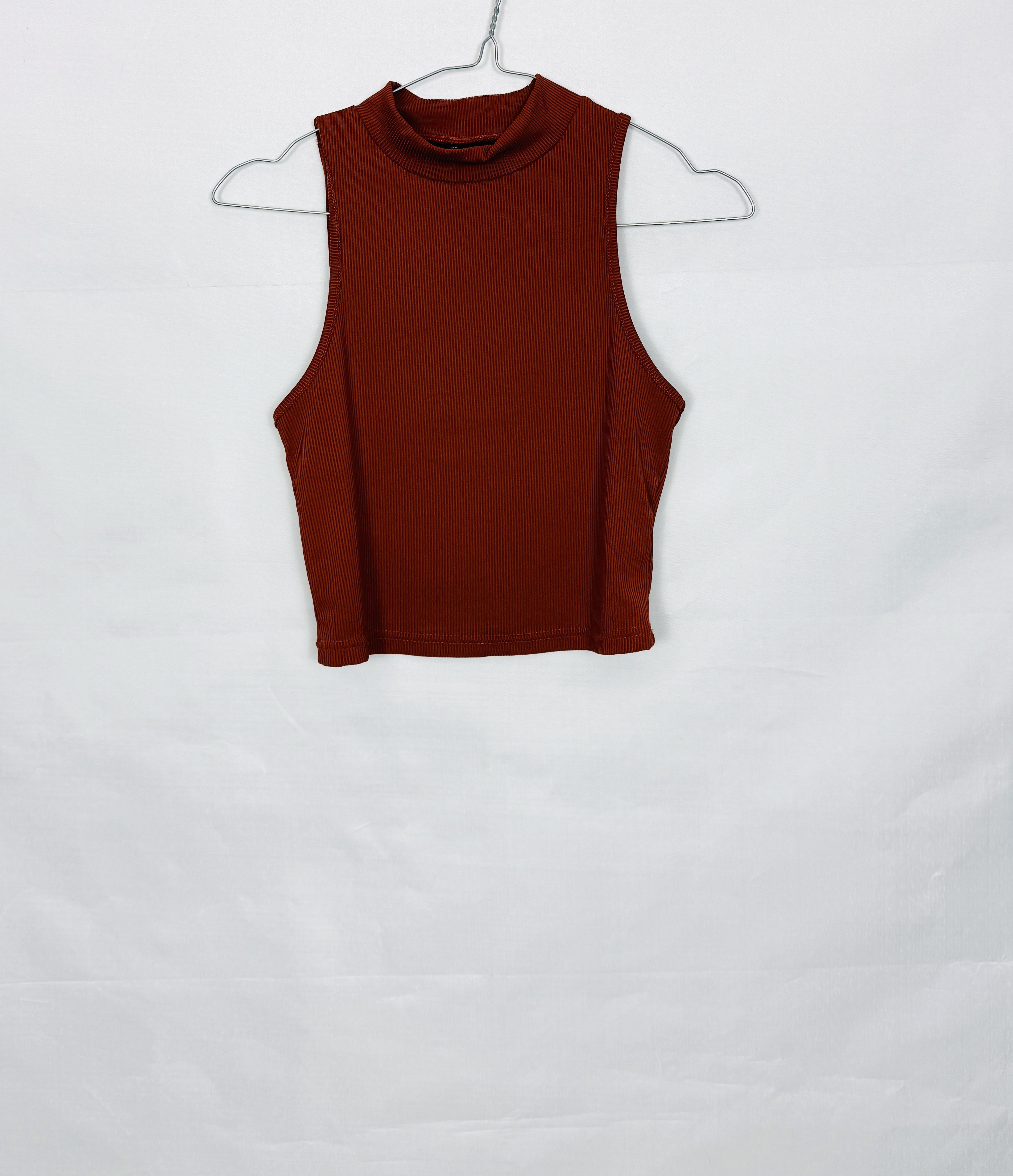 To kobiecy, nowoczesny top o spokojnym, zmysłowym charakterze — miedziany odcień nadaje mu ciepłej, eleganckiej nuty, która wygląda zarówno wieczorowo, jak i na luzie. Prosta forma połączona z subtelnym połyskiem barwy sprawia, że ubranie emanuje dyskretnym szykiem; to model dla osób, które cenią minimalistyczną formę z nutą wyrafinowania.