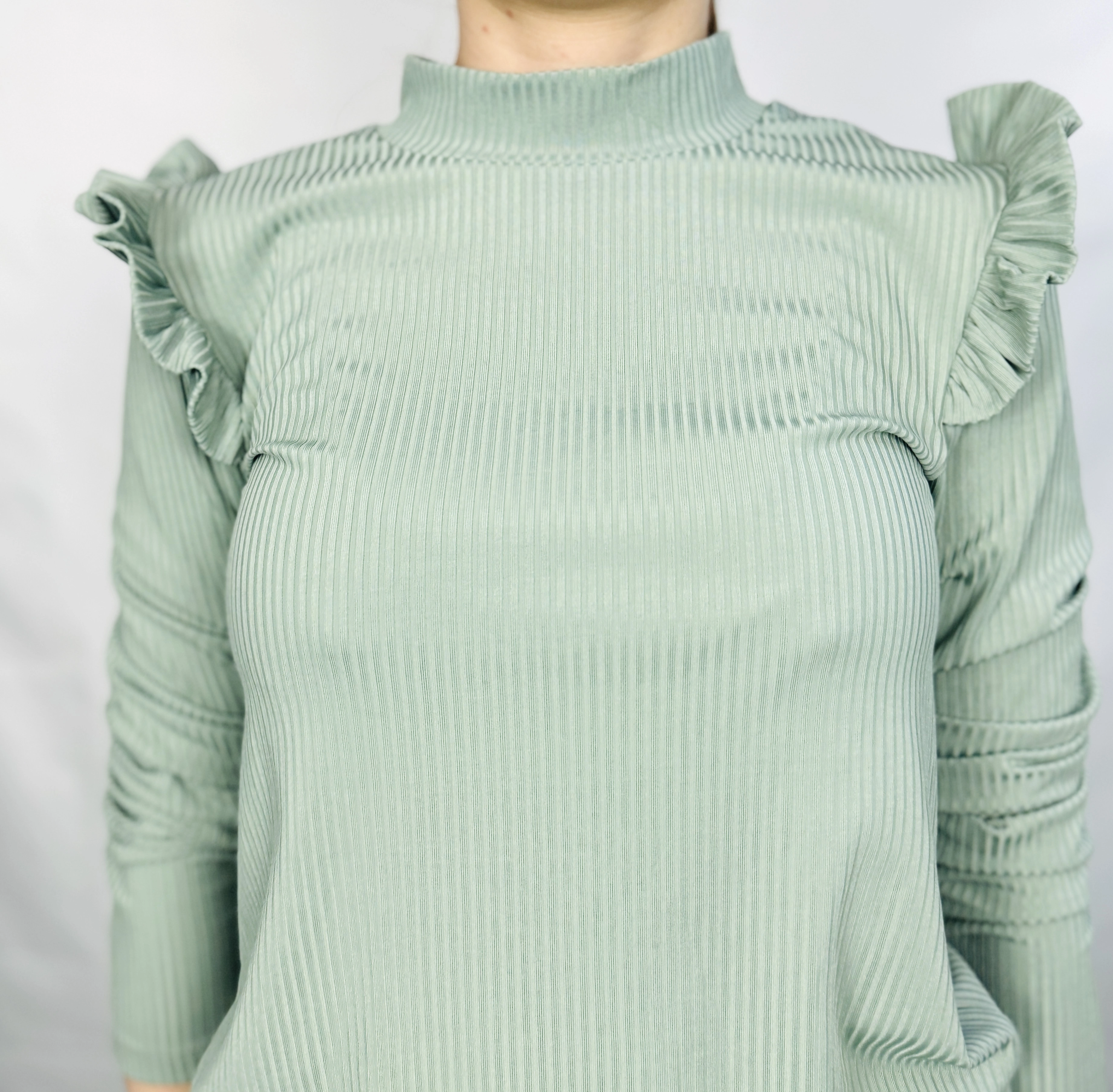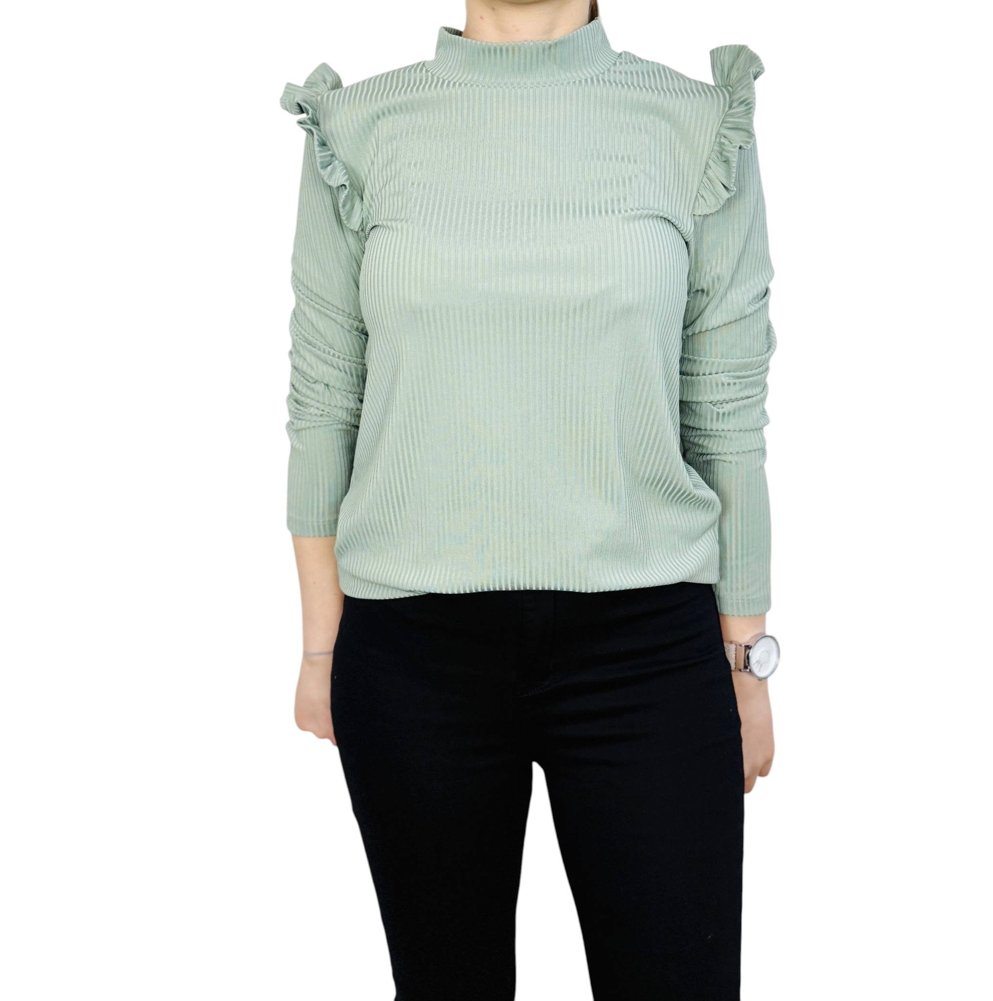 To subtelna i kobieca bluzka, która łączy nowoczesną prostotę z delikatnym romantycznym akcentem. Miętowy odcień nadaje jej świeżości i lekkości, a prążkowana struktura tkaniny wprowadza dyskretną teksturę, dzięki której całość zyskuje elegancki, uporządkowany wyraz. Model ma w sobie naturalny wdzięk — jest wystarczająco stonowany, by sprawdzić się w codziennych stylizacjach, a jednocześnie na tyle ozdobny, by stać się ciekawym punktem garderoby podczas bardziej formalnych okazji.