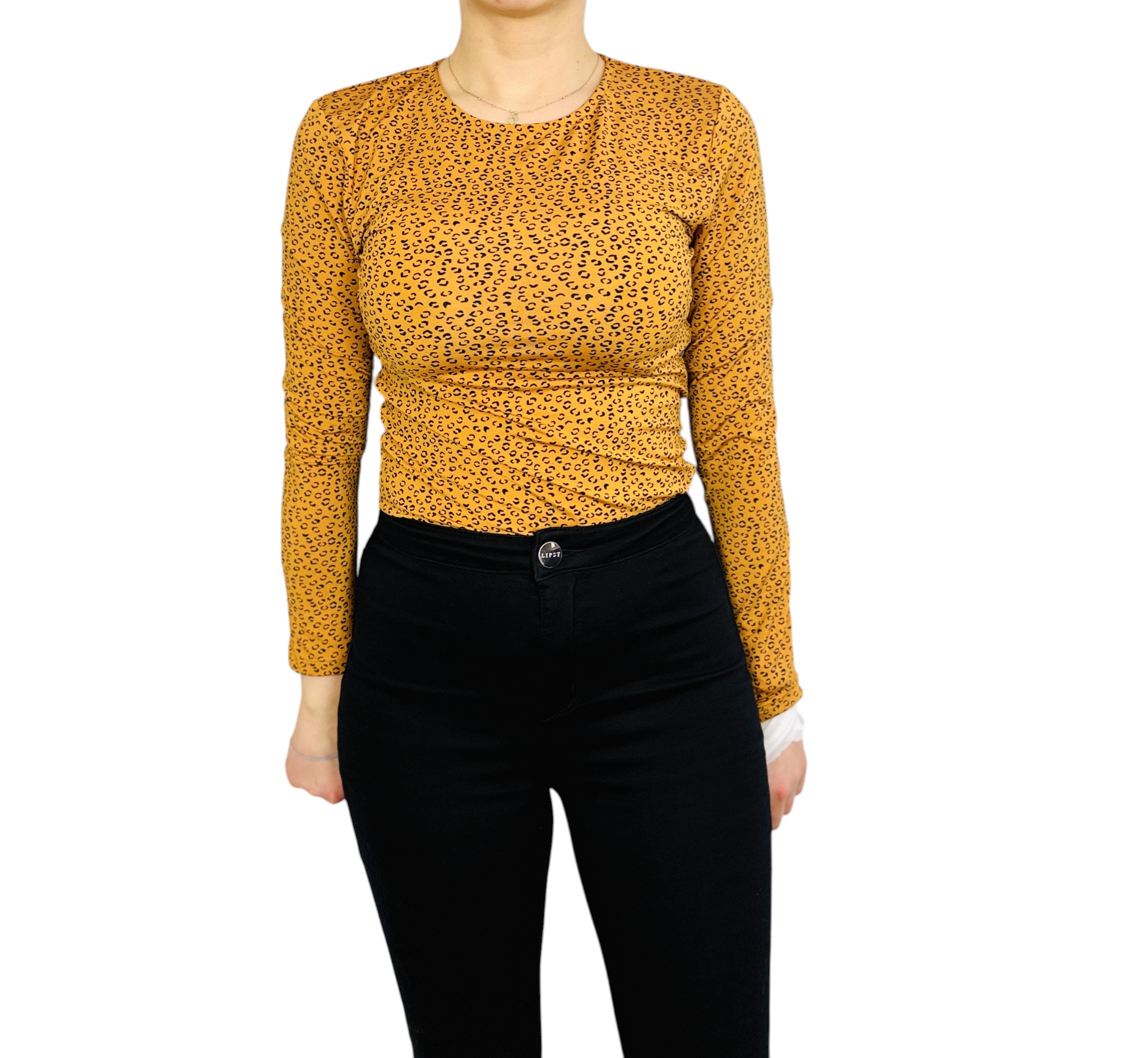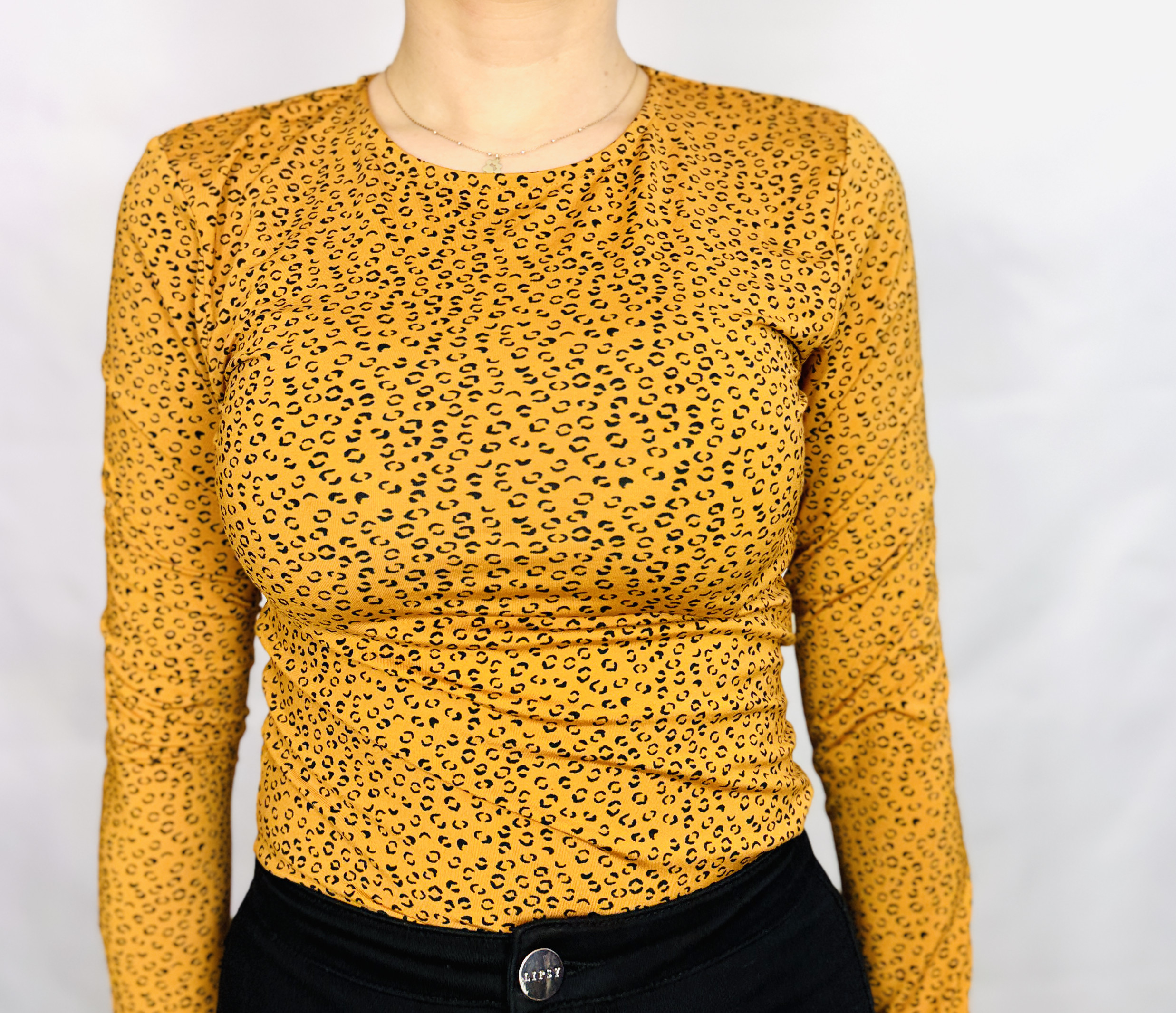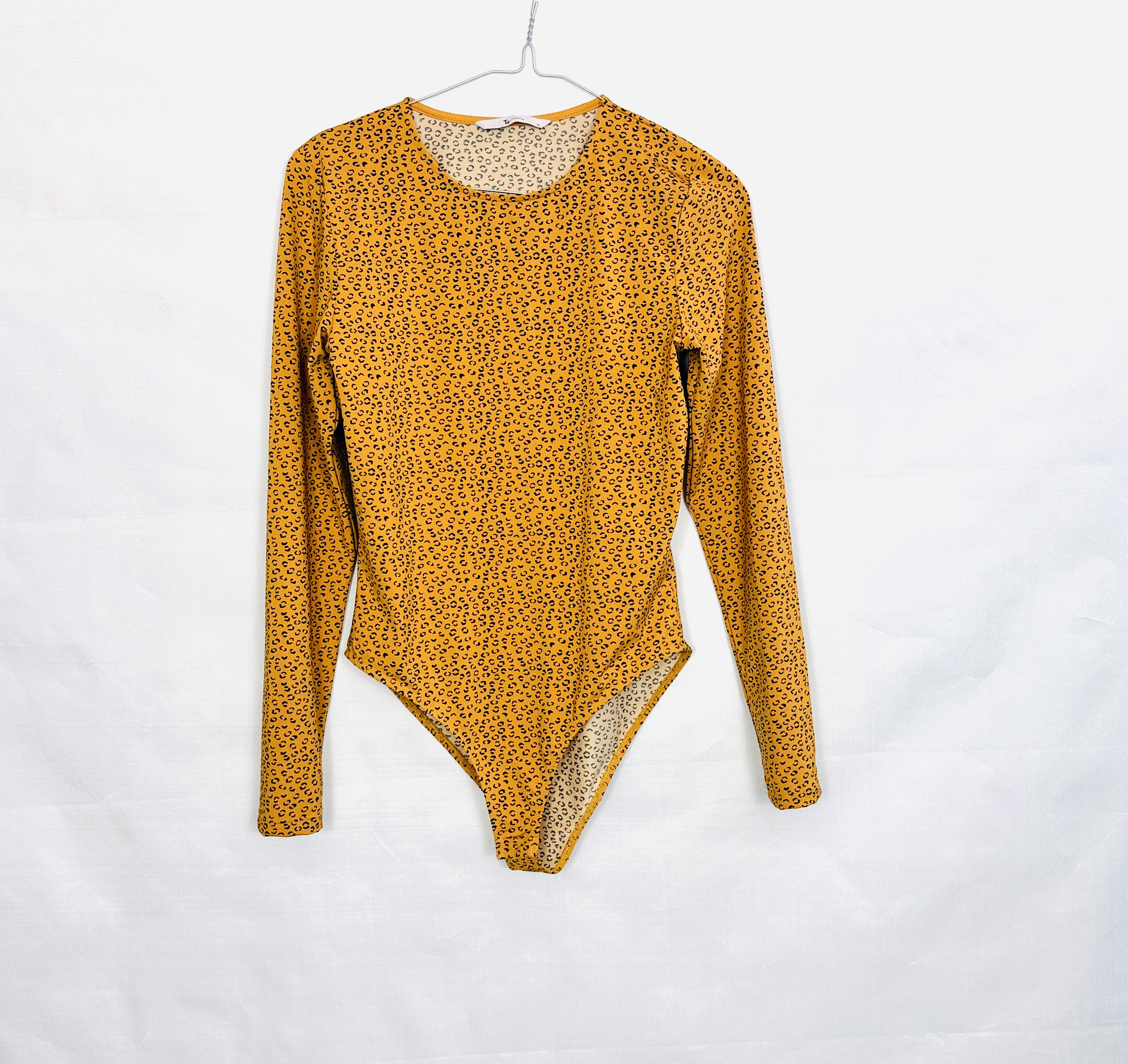 To body emanuje energią i subtelną zadziornością — ciepły, musztardowy odcień w połączeniu z drobnym, regularnym motywem przypominającym panterkę tworzy modny, młodzieńczy charakter, który jednocześnie pozostaje elegancki. Projekt ma w sobie zdecydowany, lecz przyjemny kontrast: wyrazisty kolor łagodzi delikatna skala wzoru, dzięki czemu całość nabiera lekko retro, a jednocześnie nowoczesnego wydźwięku. To propozycja dla osób, które lubią podkreślać kobiece kształty przy użyciu kolorów i subtelnej grafiki, zachowując przy tym uniwersalność stylu.
