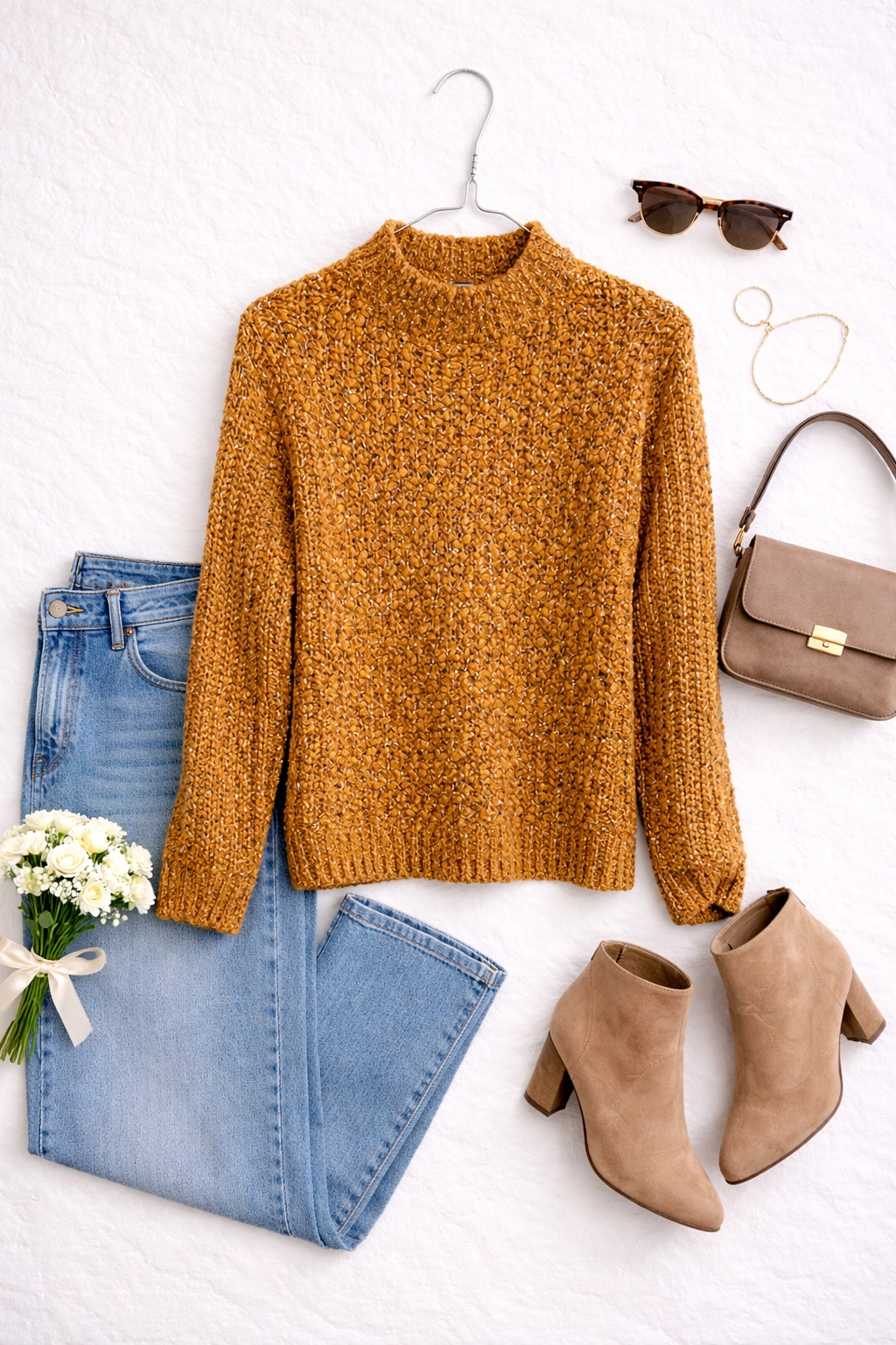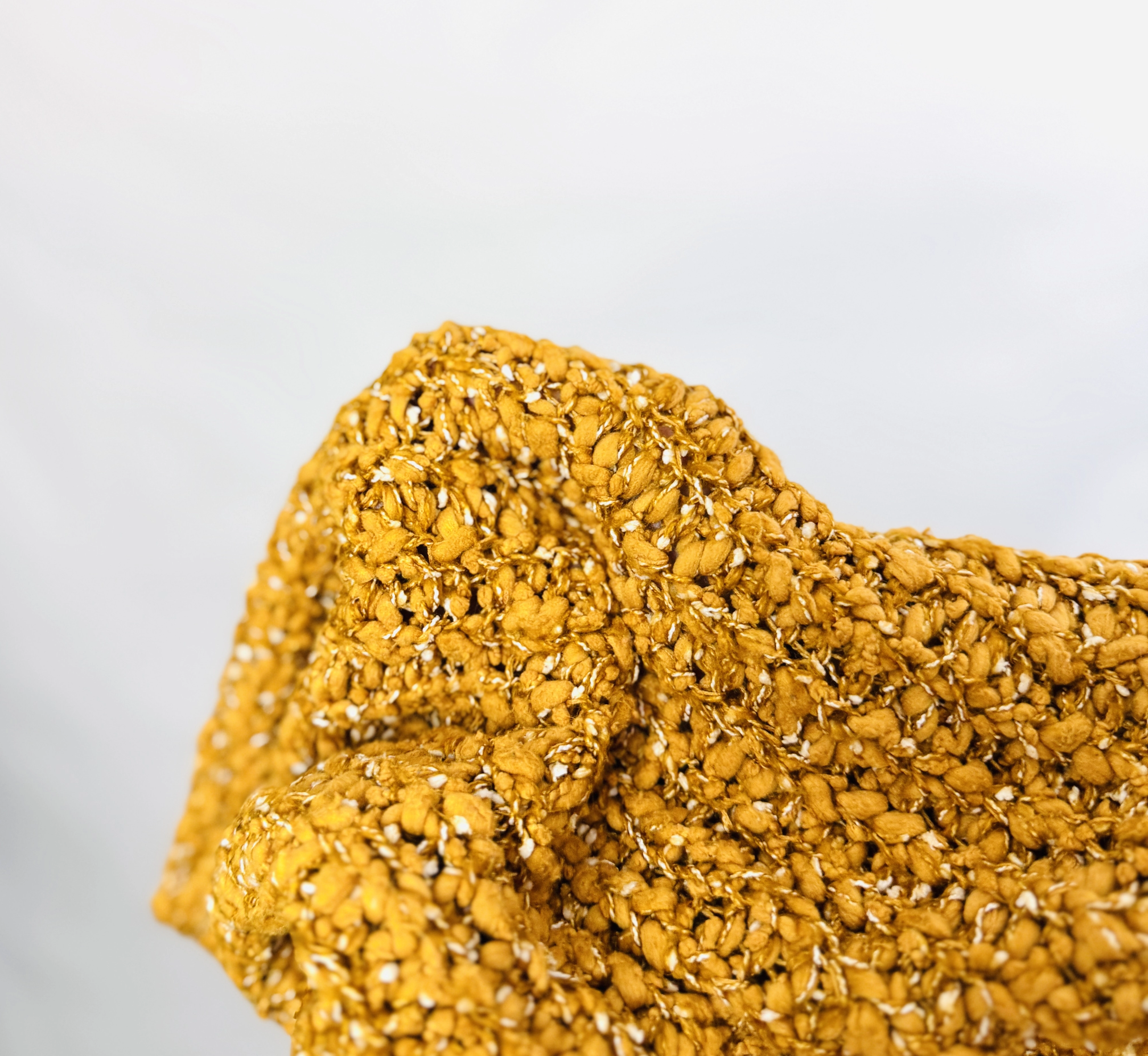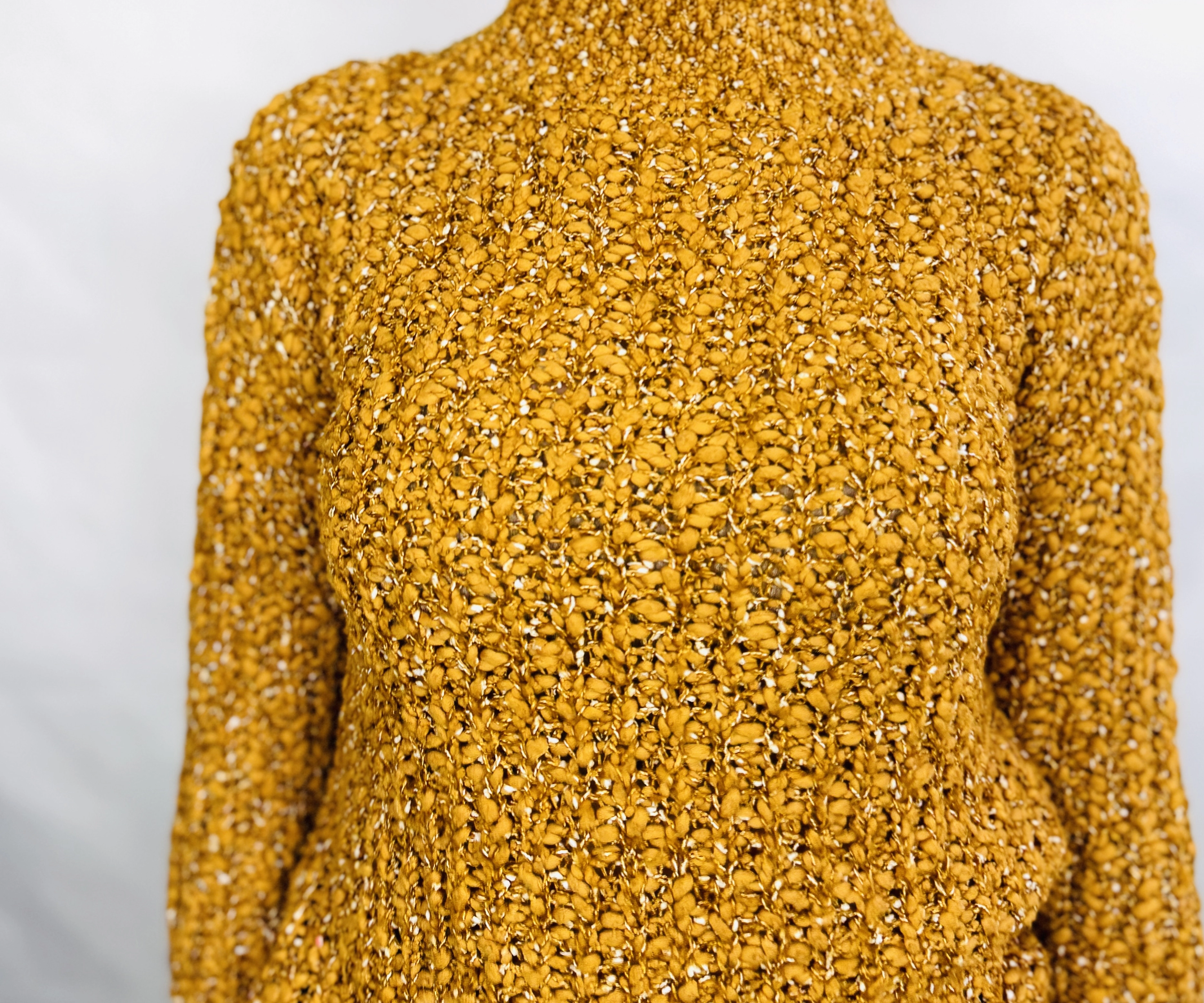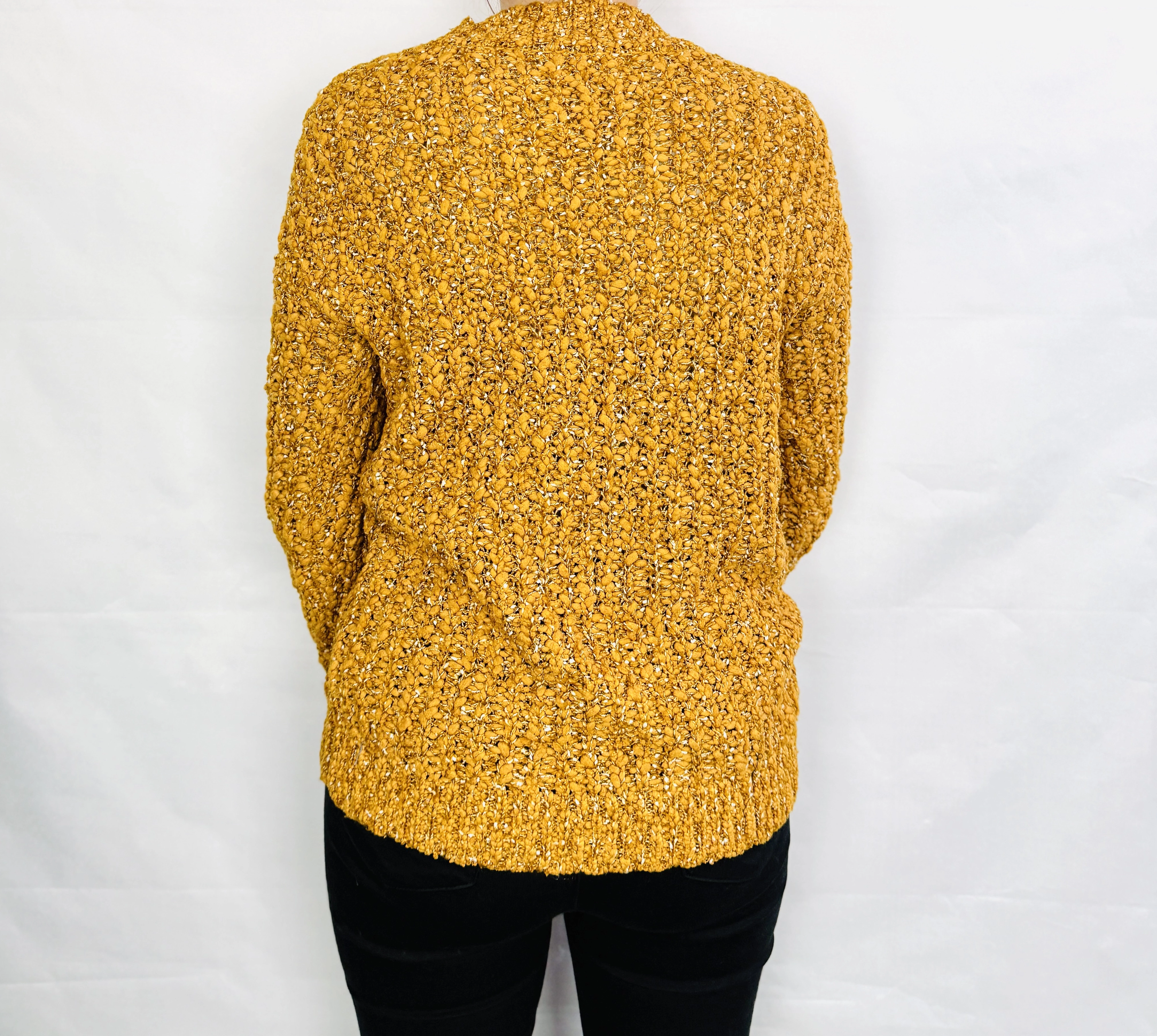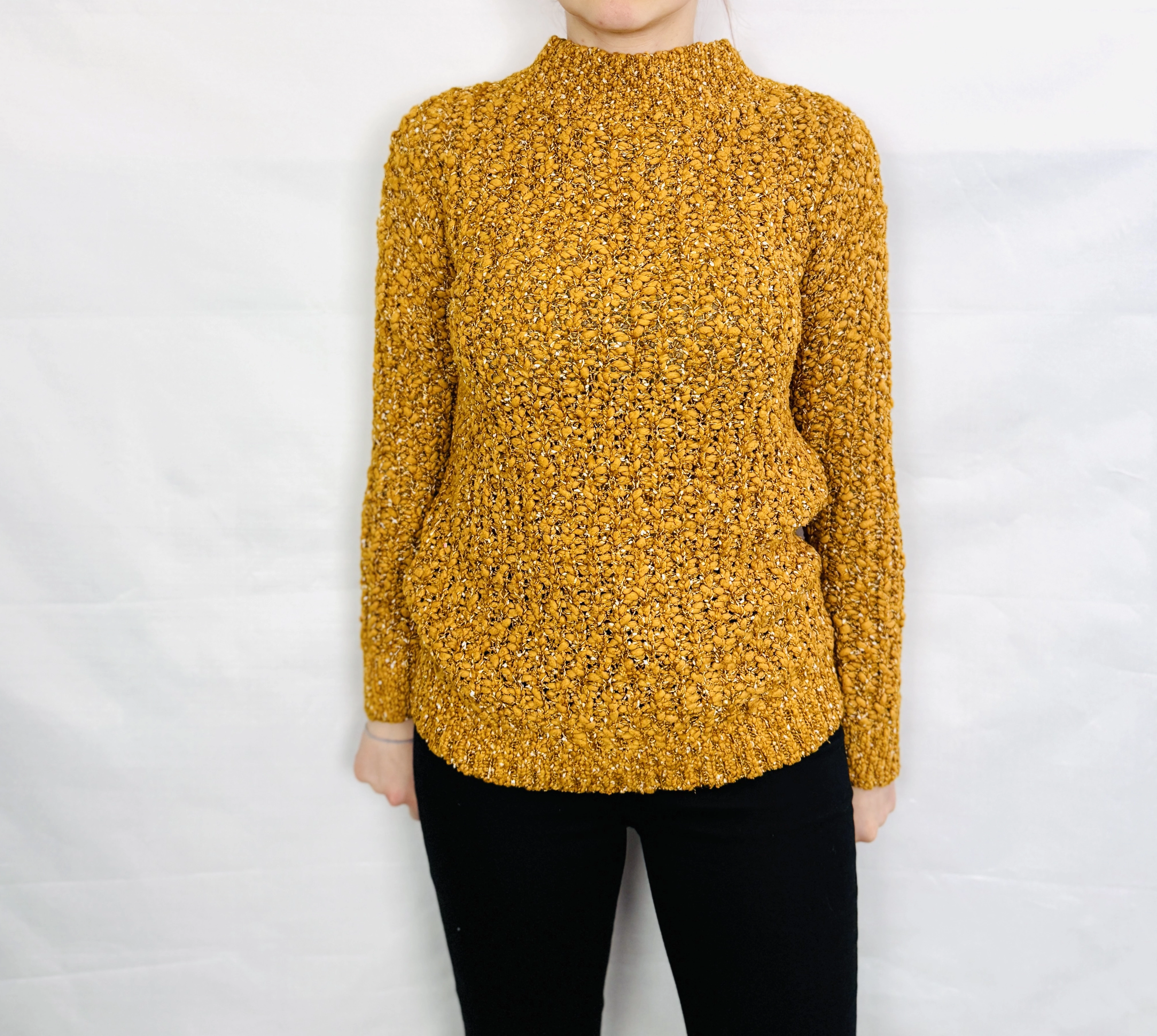 To sweter o przytulnym, kobiecym charakterze, który łączy prostotę z wyrazistą fakturą. Ciepły odcień żółci nadaje mu radosnego, a zarazem eleganckiego wyrazu, dzięki czemu sweter świetnie sprawdzi się w chłodniejsze dni, gdy chcesz wyglądać zadbanie i jednocześnie czuć komfort. Jego bogata, pętelkowa struktura przywodzi na myśl ręcznie robiony charakter i wnosi do stylizacji przyjemną, miękką nutę.