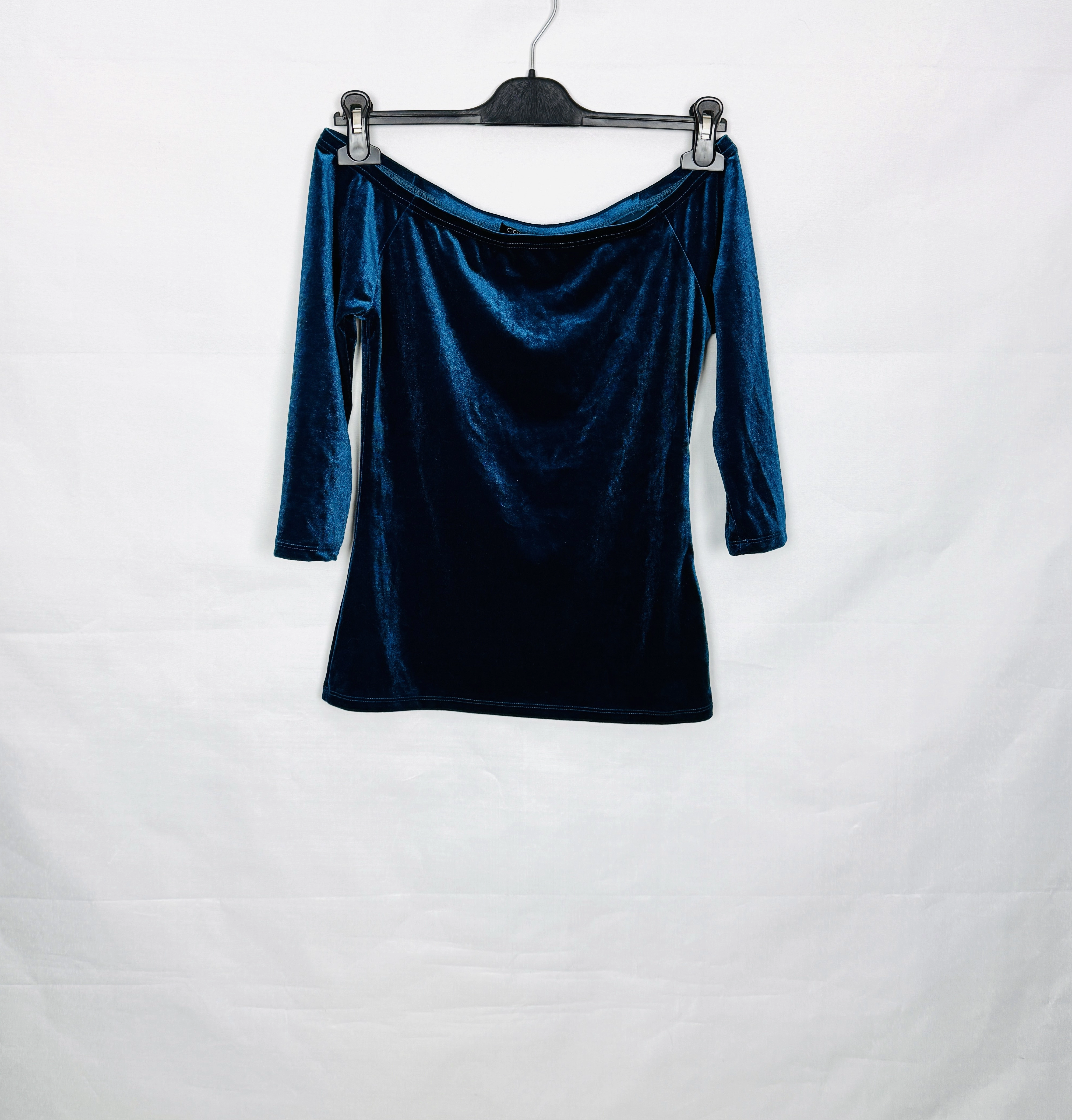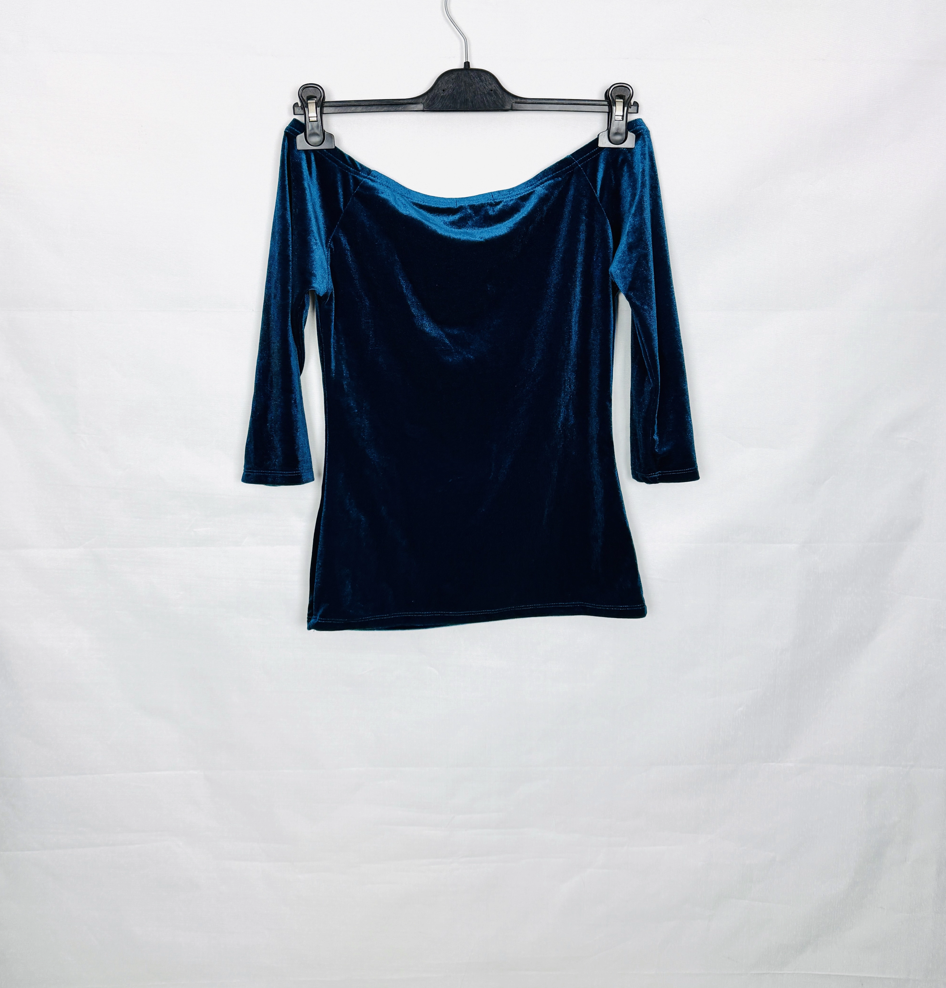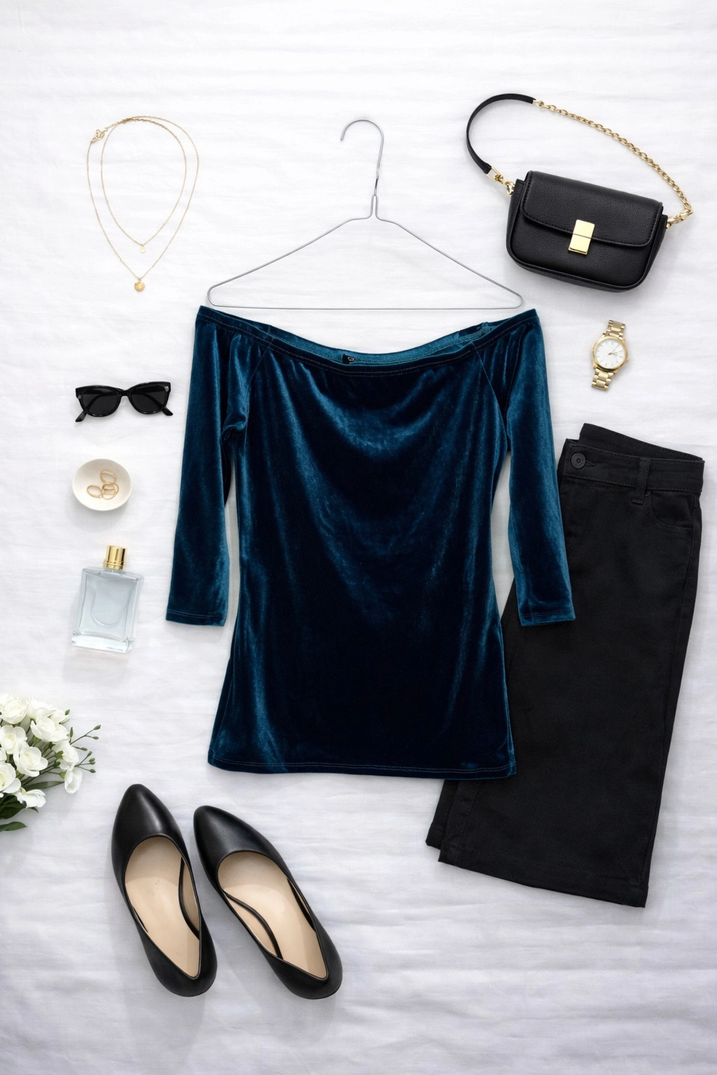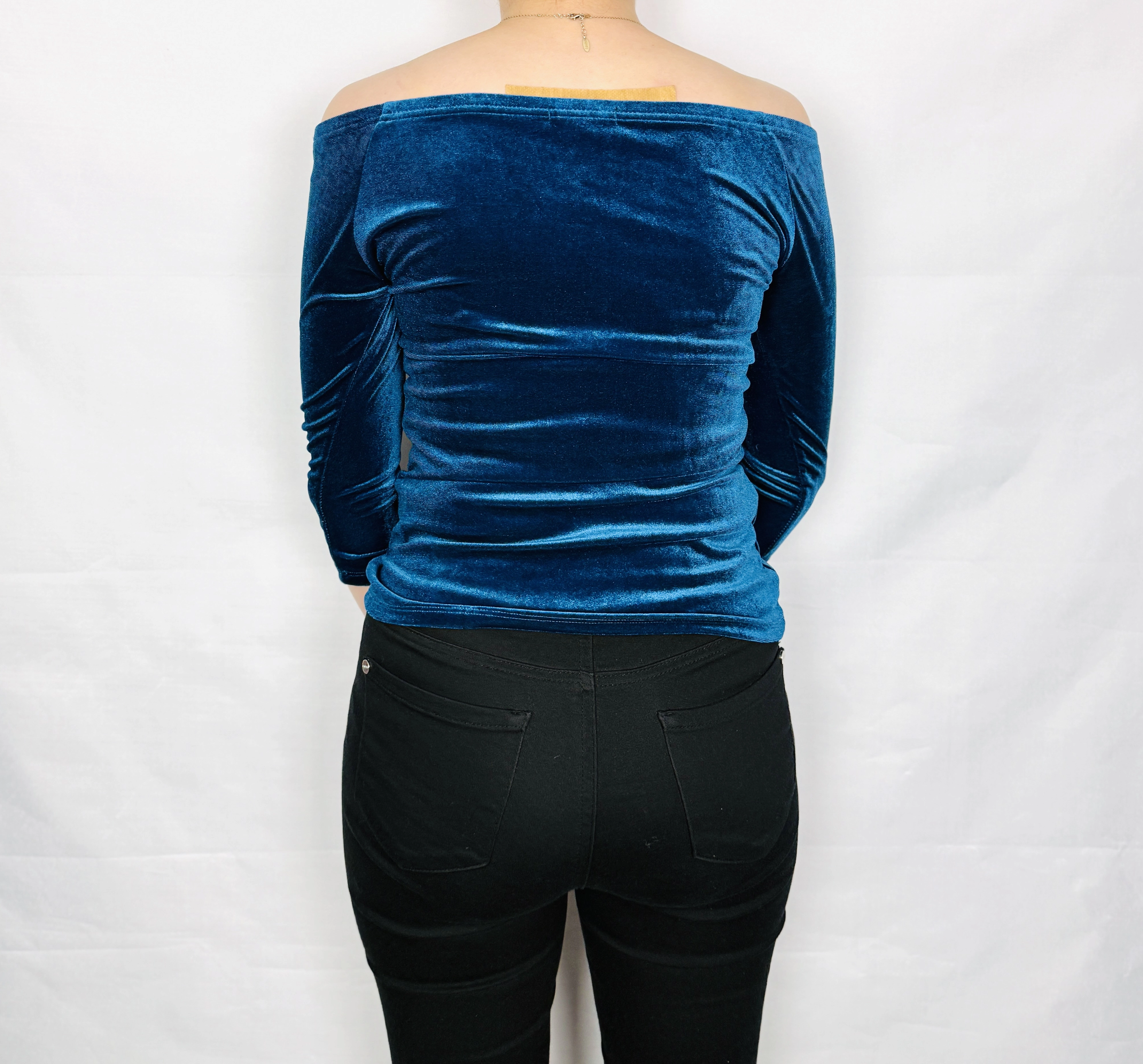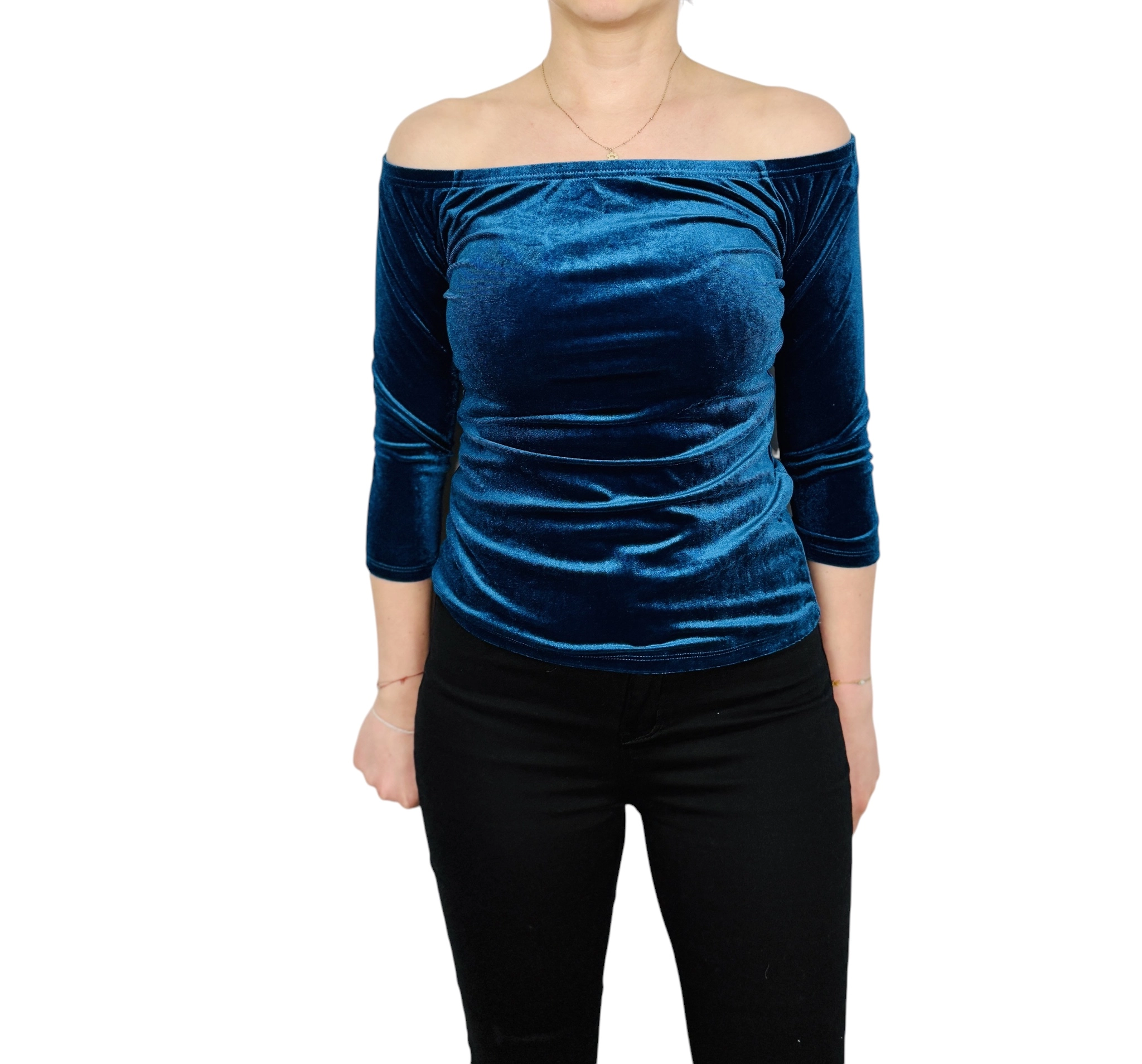Pod względem wpływu na sylwetkę, bluzka rewelacyjnie modeluje proporcje, skupiając uwagę na górnych partiach ciała. Odsłonięte ramiona optycznie poszerzają tę linię, co pozwala na nastrojowe zrównoważenie szerszych bioder, czyniąc ten krój idealnym dla kobiet o sylwetce typu gruszka. Dopasowany tors podkreśla talię i linię biustu, nadając postaci kształt klepsydry. Nastrojowy blask aksamitu dodaje figurze trójwymiarowości, a nasycony niebieski kolor działa wysmuklająco, dbając o to, by cała postać prezentowała się proporcjonalnie, zgrabnie i niezwykle elegancko. To ubiór, który celebruje kobiecą grację w sposób zdecydowany i nastrojowy.