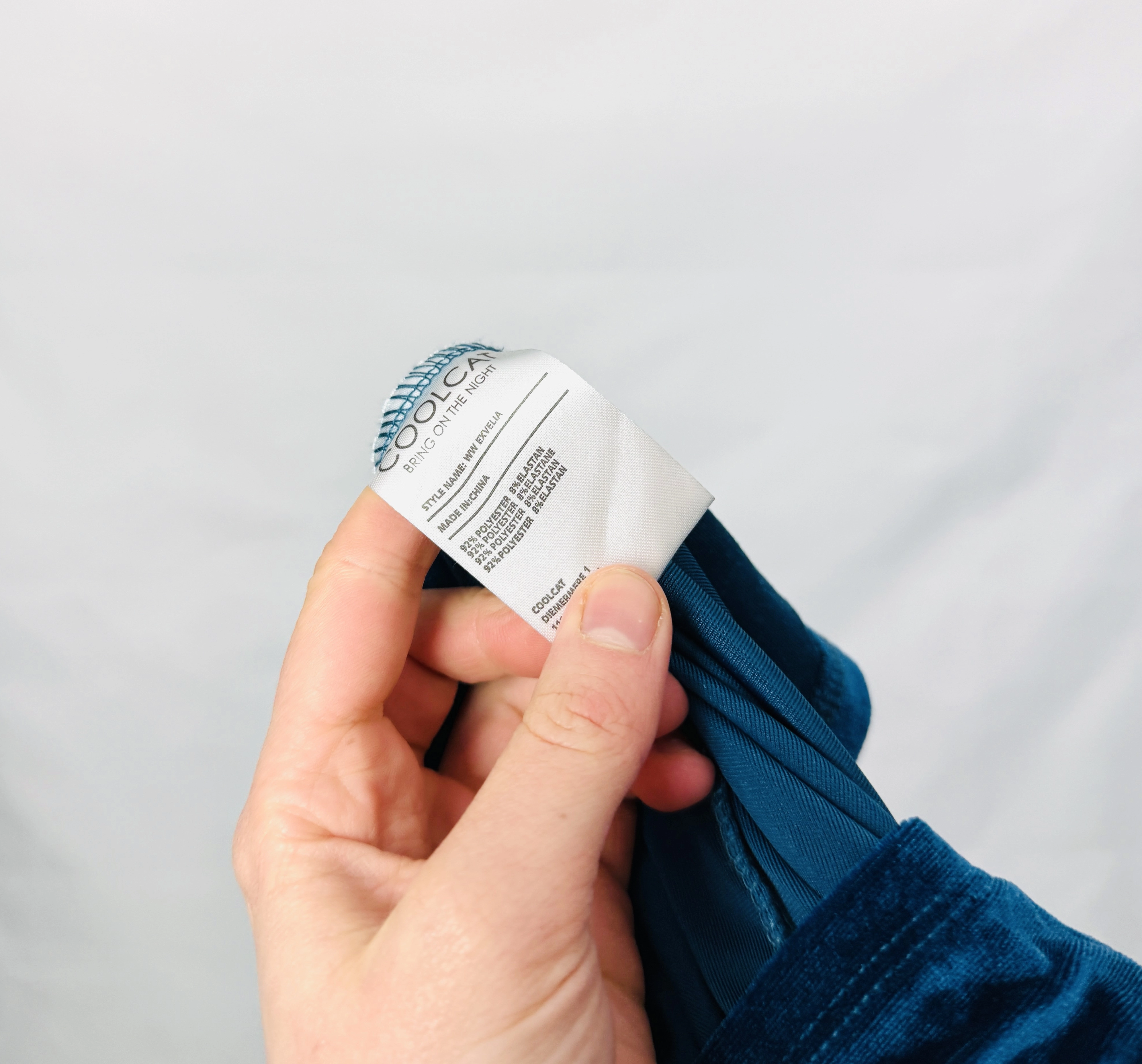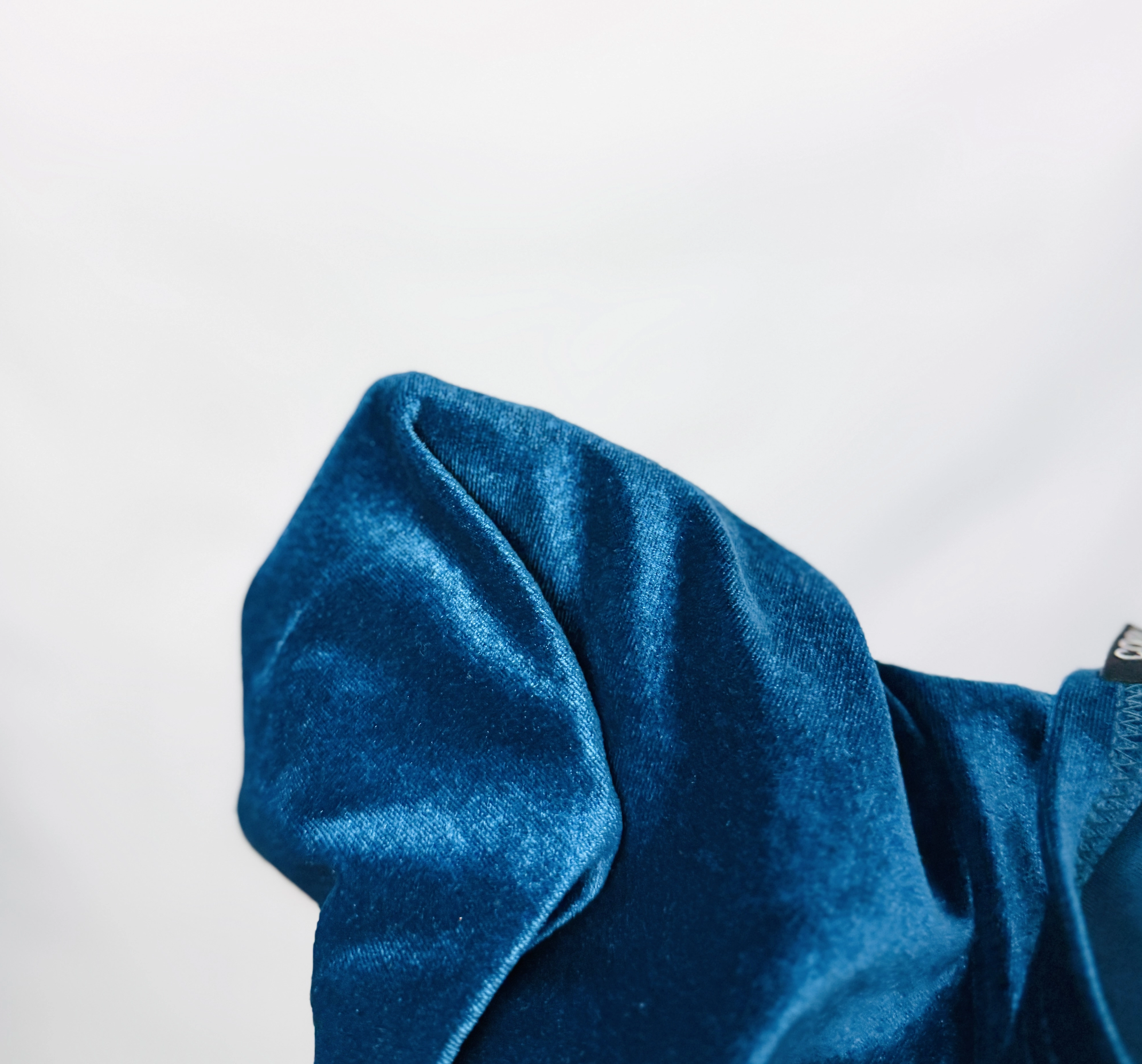 Materiał, z którego wykonano ten wyjątkowy model, to nastrojowy aksamit o niezwykle miękkiej i otulającej strukturze. Tkanina charakteryzuje się delikatnym, szlachetnym połyskiem, który nastrojowo pracuje przy każdym ruchu, tworząc na powierzchni materiału jaśniejsze i ciemniejsze tony. Dzianina jest gładsza w dotyku i wyraźnie elastyczna, co gwarantuje idealne dopasowanie do sylwetki przy zachowaniu pełnego komfortu noszenia. Gęsty splot sprawia, że materiał wydaje się nieznacznie grubszy, co dodaje ubraniu ekskluzywnego charakteru i nastrojowej głębi. To tkanina, która nie potrzebuje dodatkowych ozdób, by lśnić i zachwycać nienaganną estetyką.