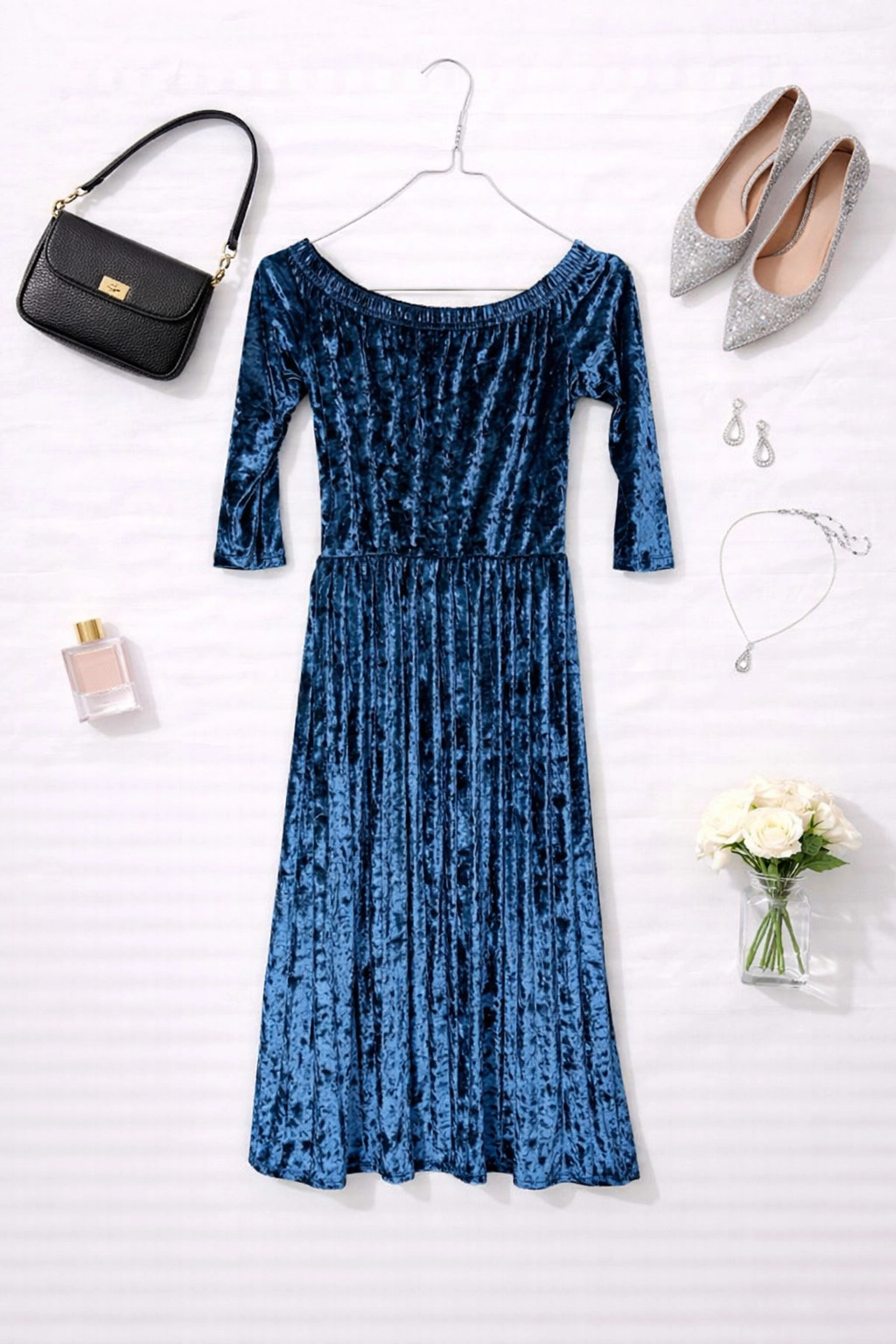 Ta aksamitna sukienka w odcieniu chłodnego niebieskiego zachwyca elegancją i subtelnym połyskiem, który pięknie odbija światło i nadaje całości wyjątkowego charakteru. Miękka, lekko mieniąca się powierzchnia sprawia, że model wygląda niezwykle szlachetnie i przyciąga spojrzenia. To propozycja idealna na wyjątkowe okazje, kiedy liczy się efektowność połączona z kobiecą delikatnością.