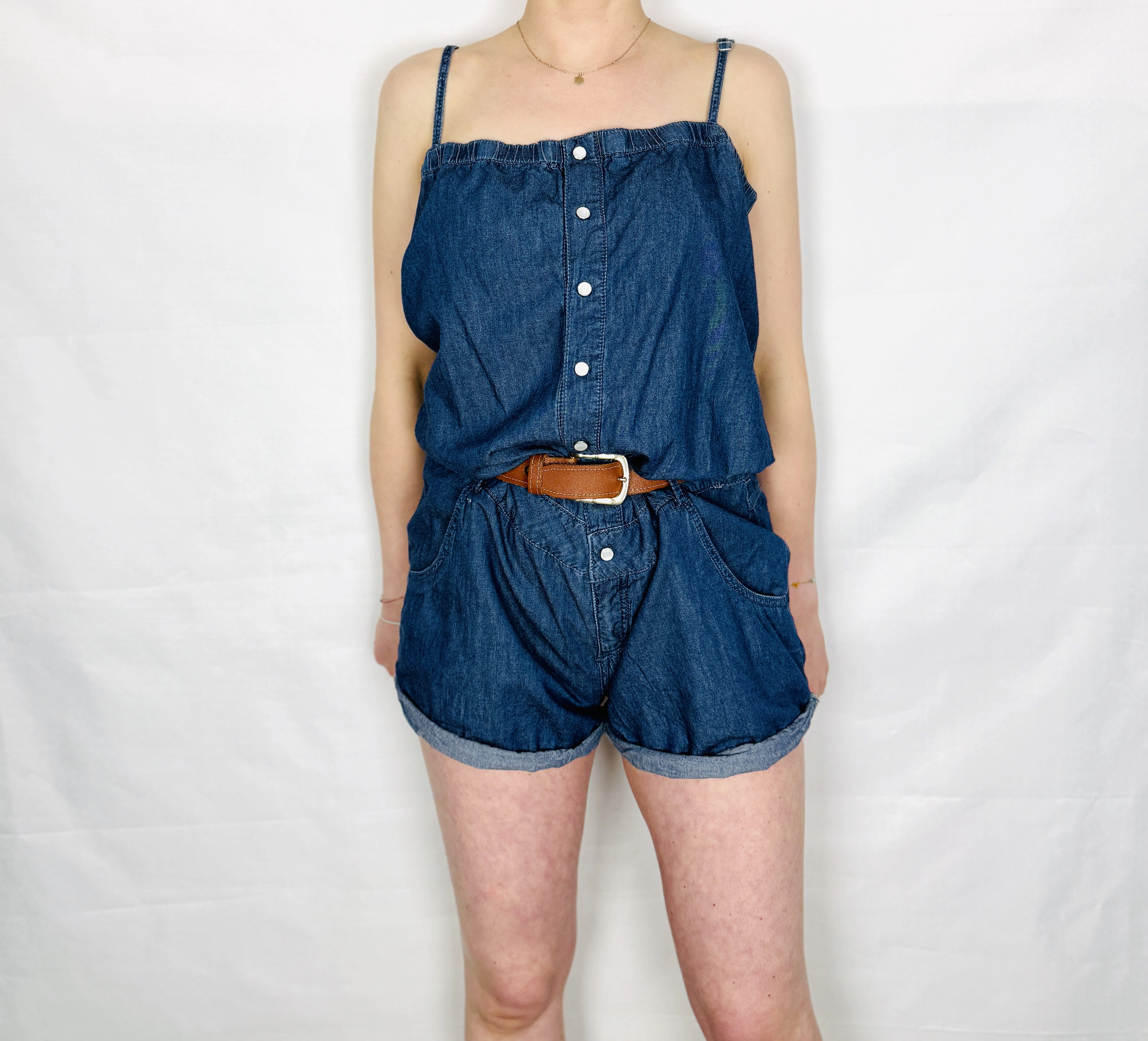 Linia talii jest zaznaczona, co pozwala zachować proporcje sylwetki i nadaje jej bardziej kobiecy kształt. Dół w formie krótkich spodenek jest lekko luźniejszy, z podwiniętymi nogawkami, co dodaje swobody i podkreśla letni charakter modelu. Widoczne kieszenie wzmacniają praktyczny i niewymuszony styl.