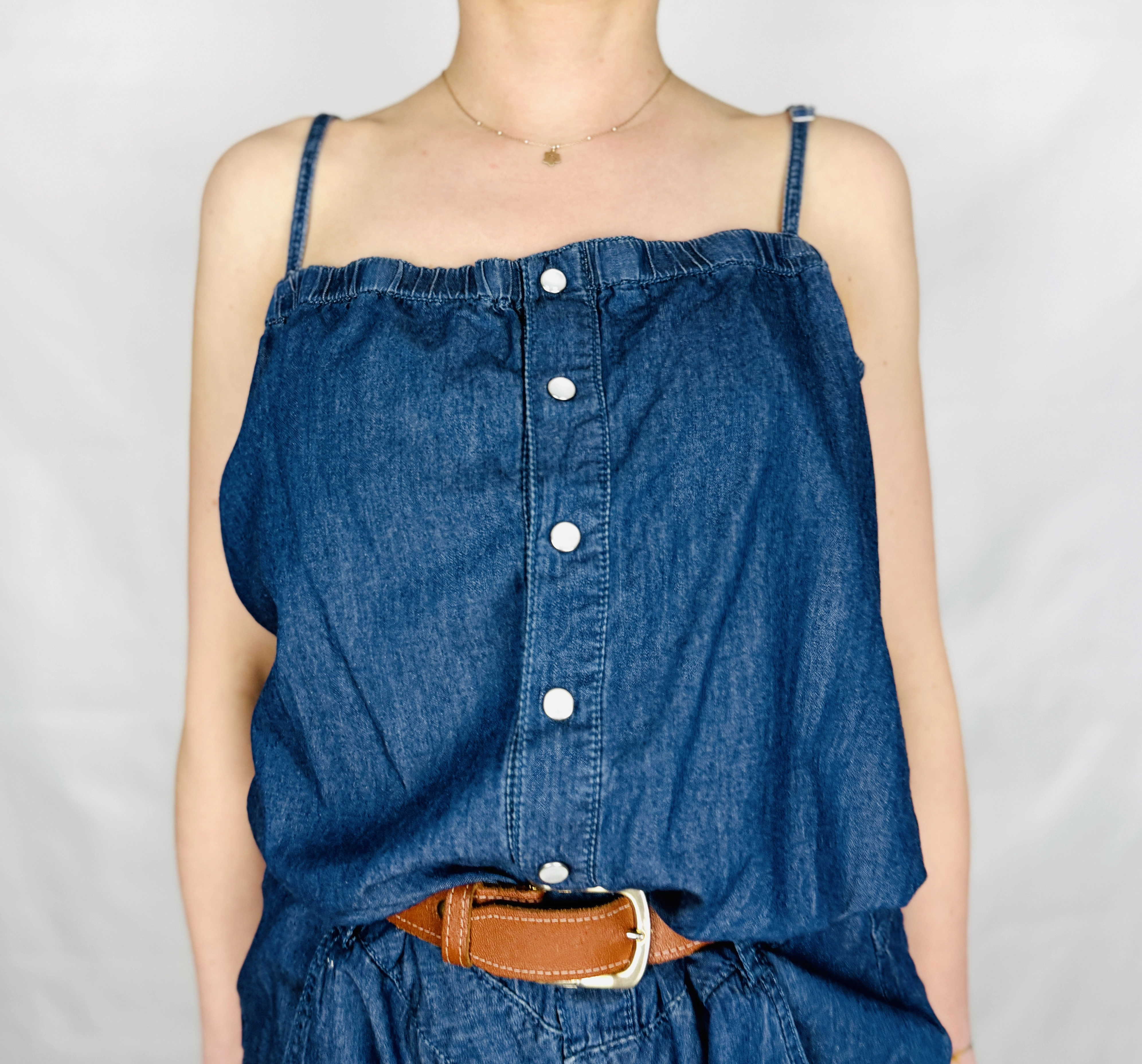 Góra kombinezonu ma prosty, lekko luźny krój z cienkimi ramiączkami, które subtelnie podkreślają ramiona i nadają całości lekkości. Dekolt jest delikatnie zaokrąglony, z miękkim wykończeniem, które dobrze układa się na sylwetce. Zapięcie na guziki biegnące przez środek dodaje charakteru i podkreśla casualowy styl całości.