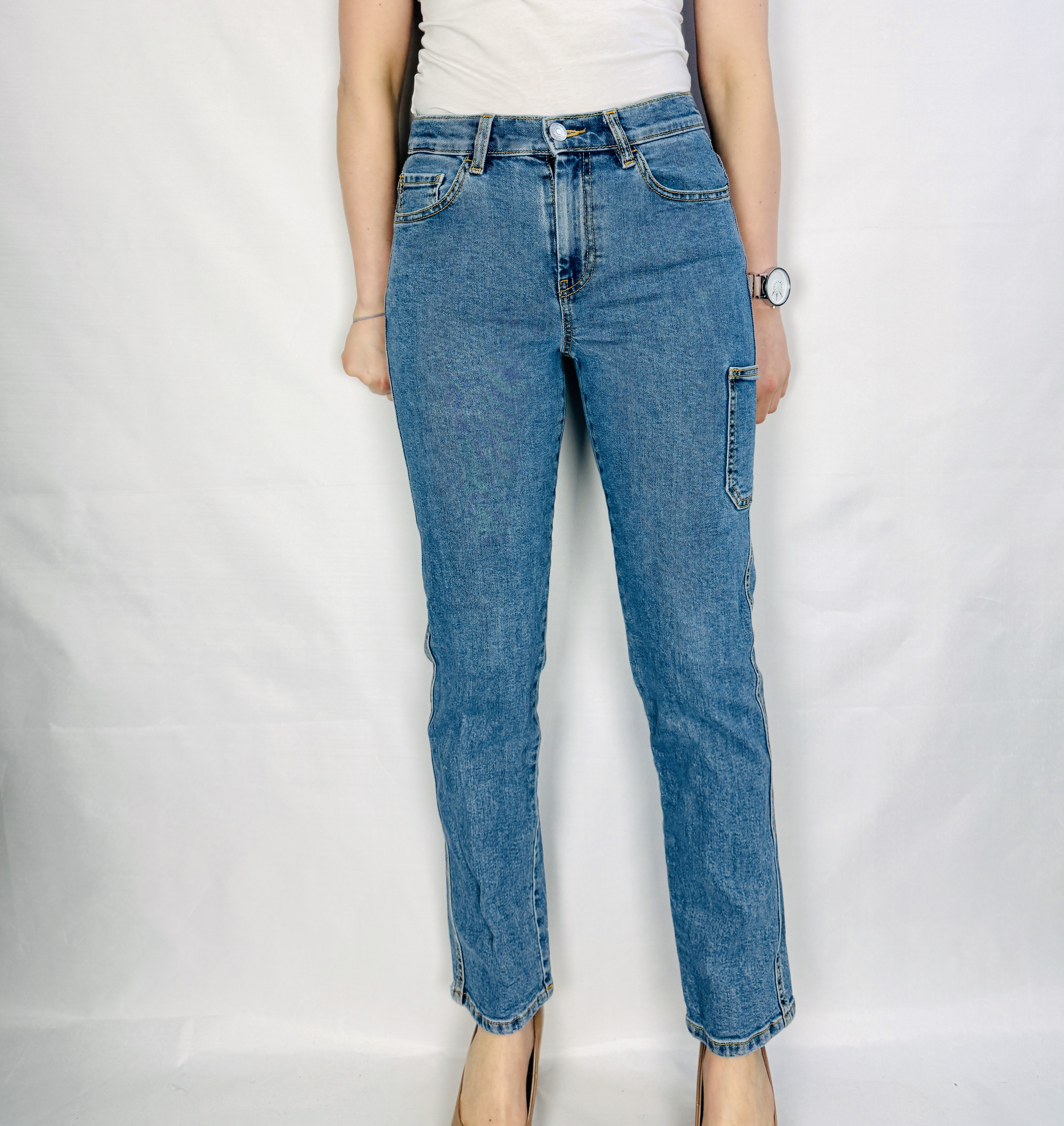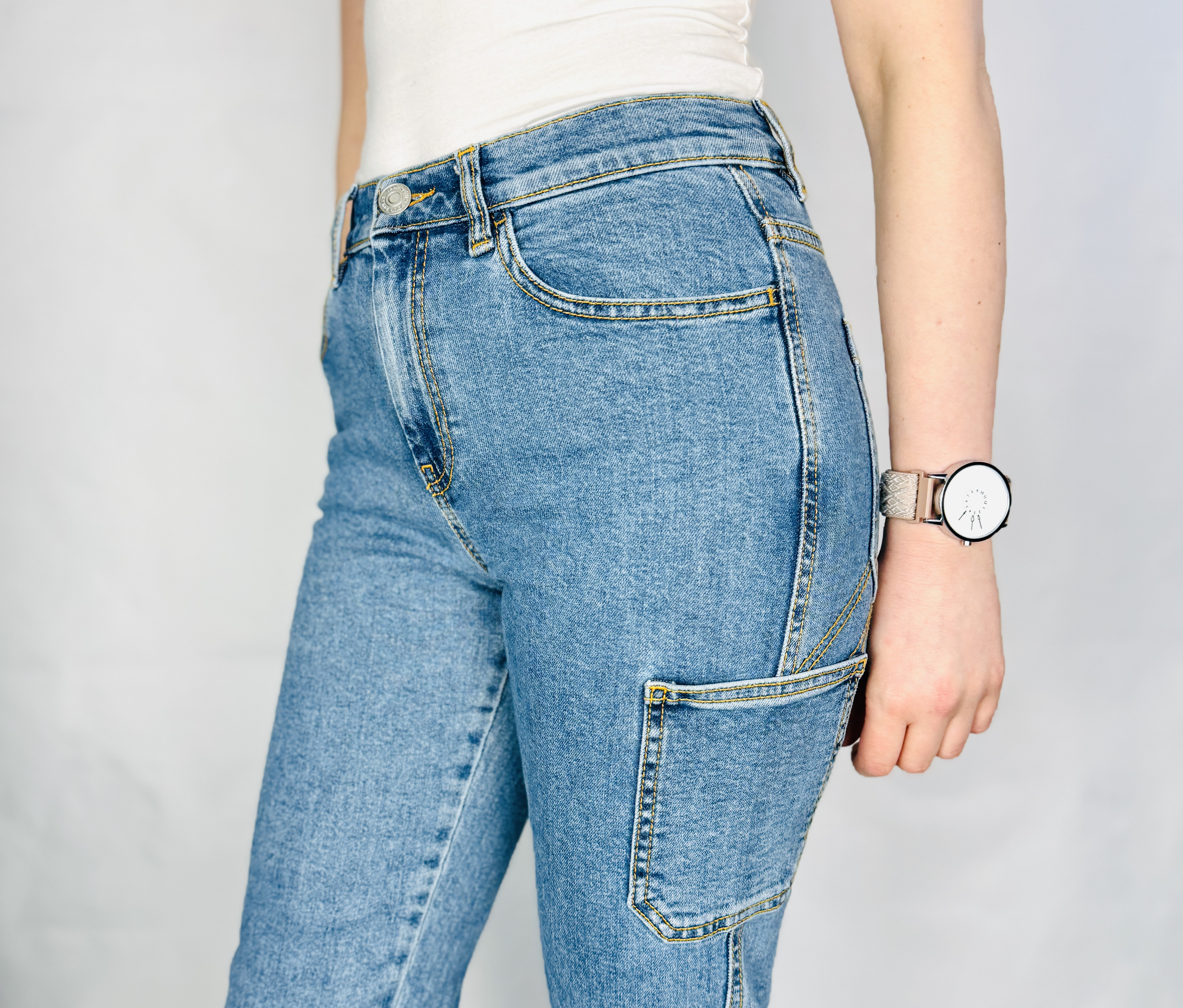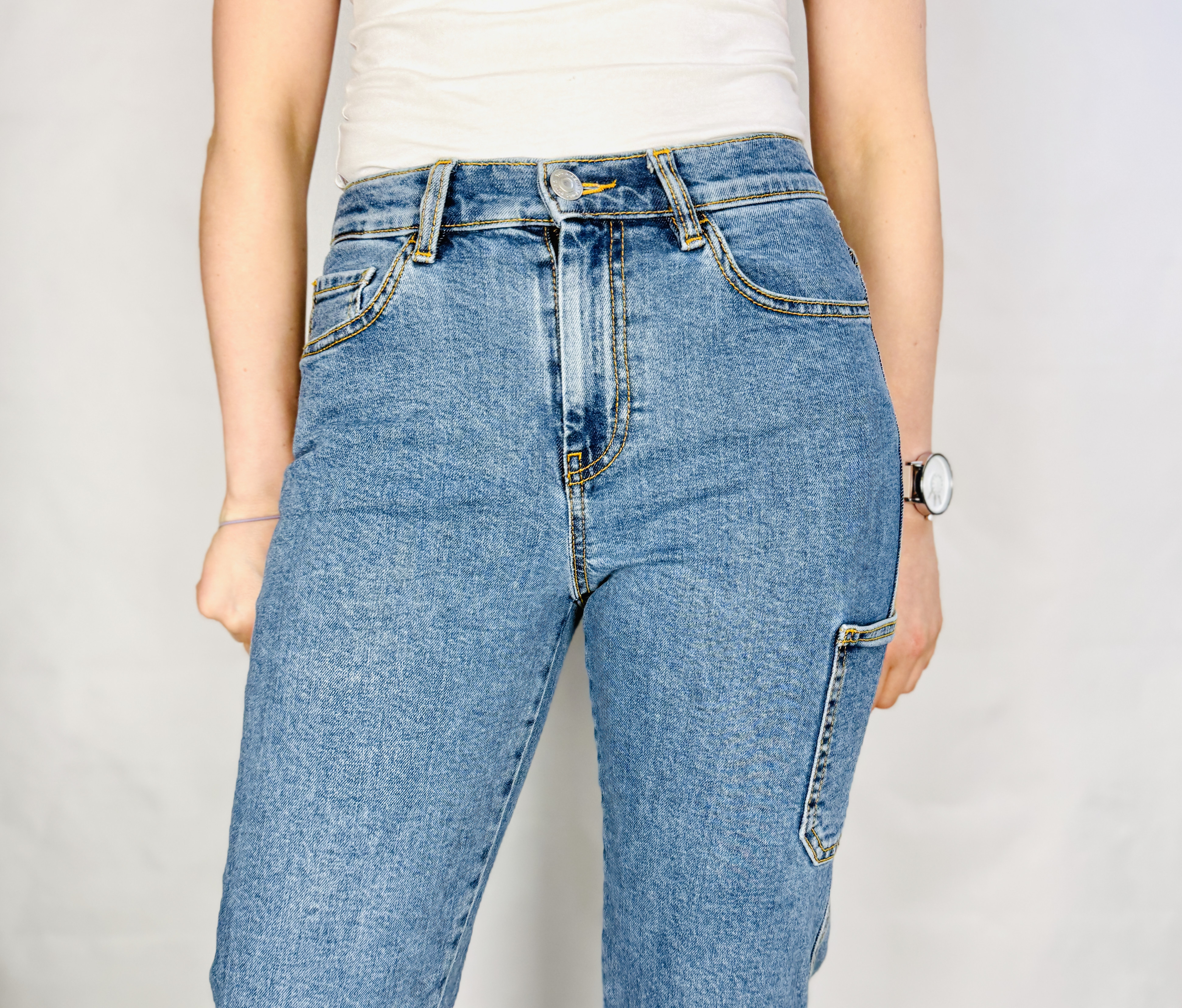 W stylizacjach to bardzo uniwersalny model: doskonale zagra z prostym, białym topem i sneakersami w casualowym wydaniu, z cienkim swetrem i botkami w wersji miejskiej, a także z dopracowaną koszulą i marynarką, gdy chcesz nadać lookowi bardziej eleganckiego charakteru. Niebieski denim świetnie komponuje się z neutralnymi barwami jak biel, krem czy beż, ale także z akcentami w kolorze brązowym, bordo czy oliwkowej zieleni dla bardziej wyrazistego efektu. Kieszeń boczna będzie praktycznym i modnym atutem, który podkreśli codzienny charakter tych jeansów.