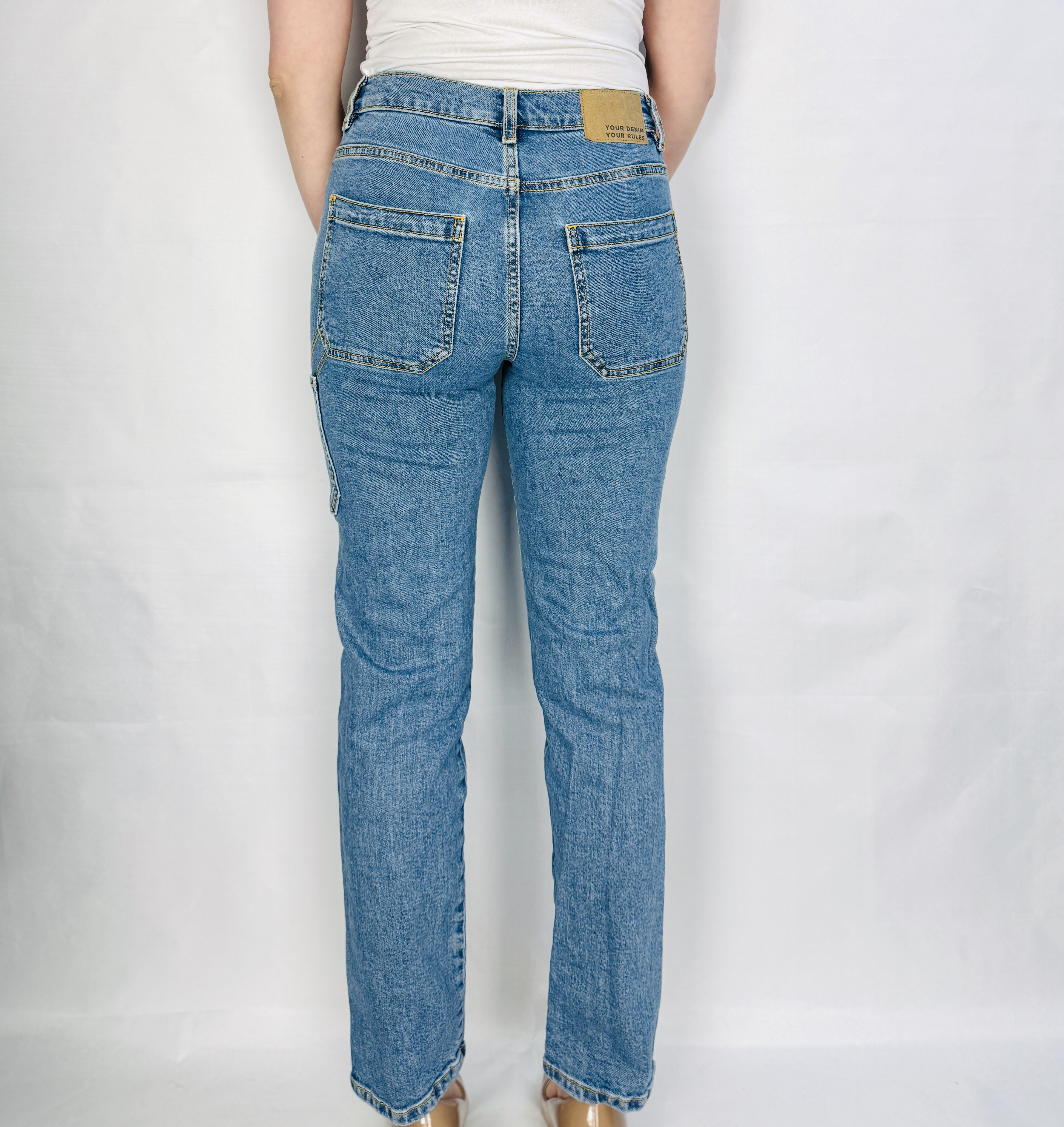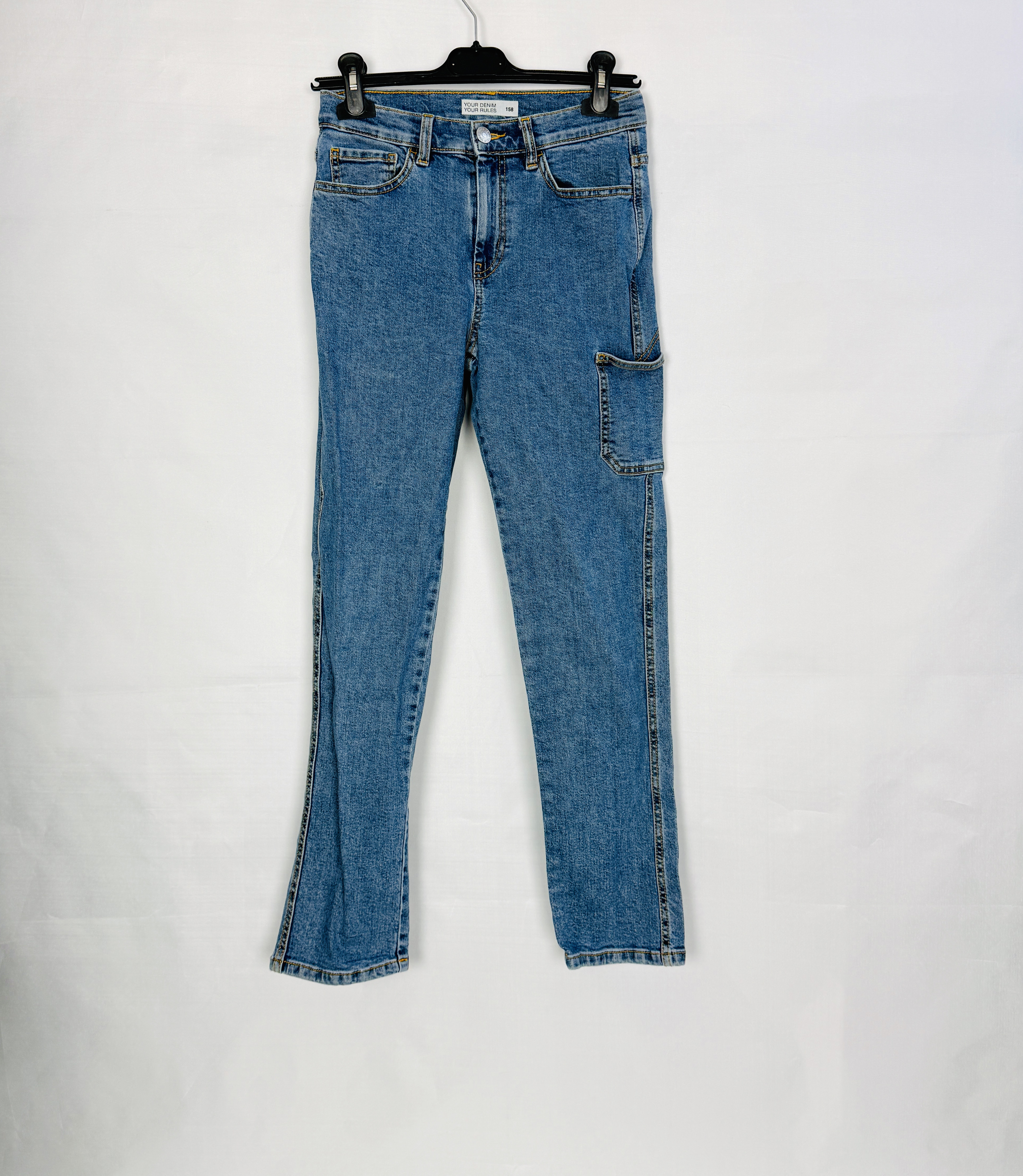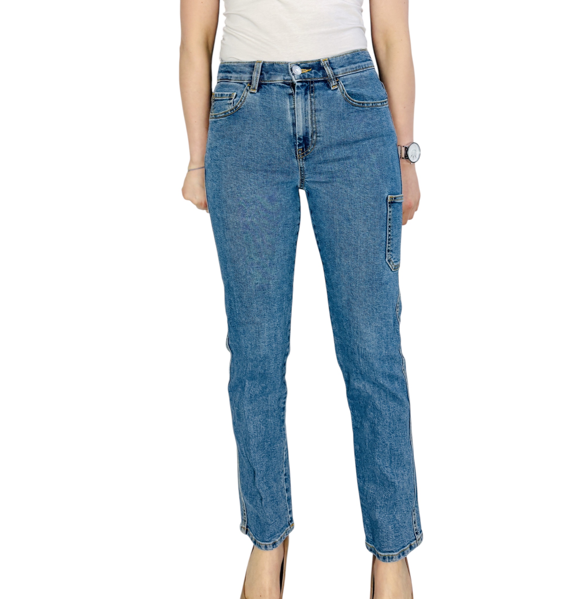 W stylizacjach to bardzo uniwersalny model: doskonale zagra z prostym, białym topem i sneakersami w casualowym wydaniu, z cienkim swetrem i botkami w wersji miejskiej, a także z dopracowaną koszulą i marynarką, gdy chcesz nadać lookowi bardziej eleganckiego charakteru. Niebieski denim świetnie komponuje się z neutralnymi barwami jak biel, krem czy beż, ale także z akcentami w kolorze brązowym, bordo czy oliwkowej zieleni dla bardziej wyrazistego efektu. Kieszeń boczna będzie praktycznym i modnym atutem, który podkreśli codzienny charakter tych jeansów.