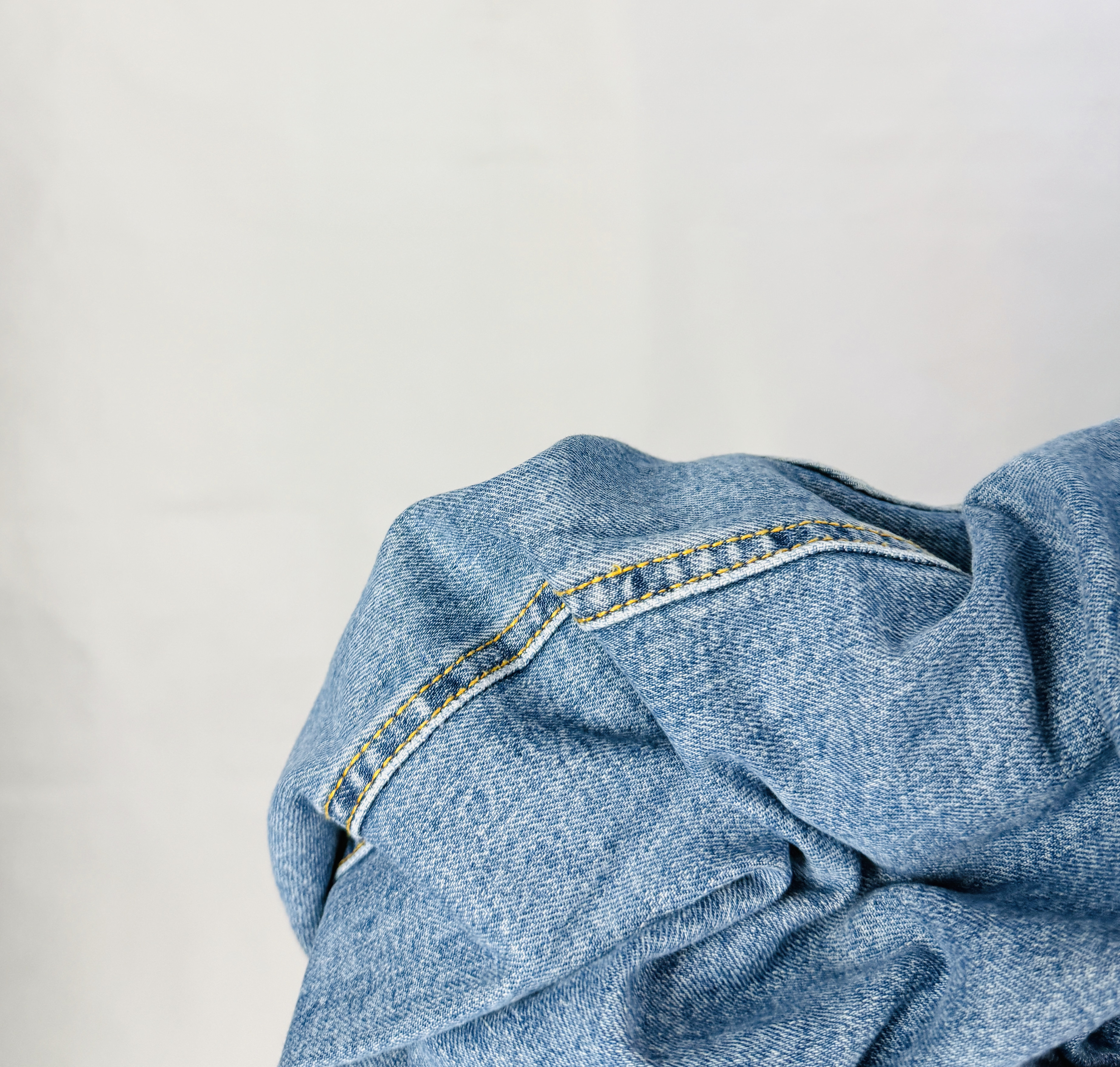 Materiał ma wyraźny denimowy rysunek, wygląda na nieco bardziej strukturalny i matowy, dzięki czemu spodnie trzymają formę i zachowują uporządkowaną sylwetkę. Powierzchnia tkaniny pokazuje delikatne spranie w partiach ud i środka nogawki, co nadaje im lekko postarzonego wyrazu. W miejscach pracy materiał miękko się marszczy, co świadczy o wygodzie użytkowania, ale ogólne wrażenie pozostaje schludne i trwałe.
