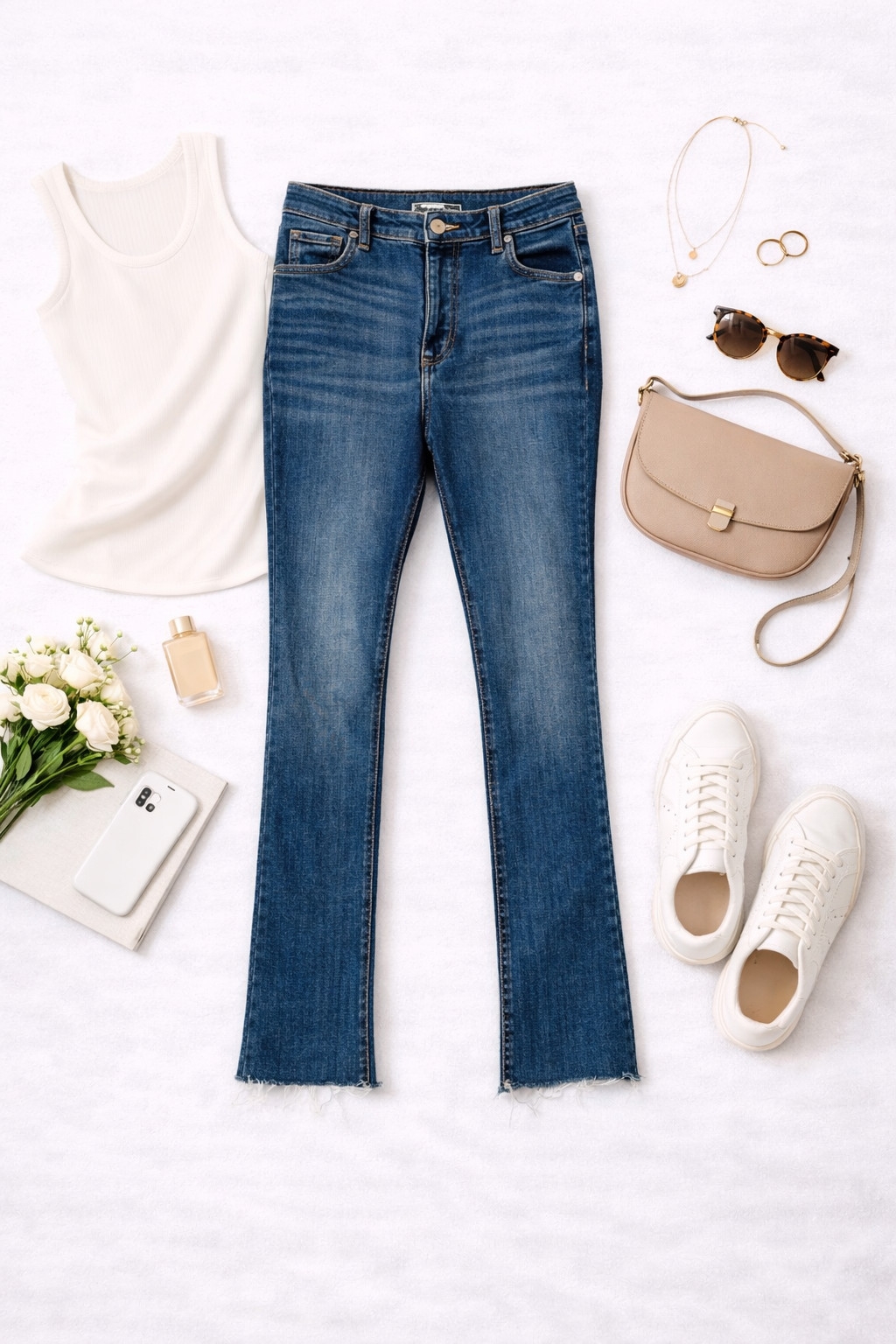 W stylizacjach jeansy sprawdzą się znakomicie: na co dzień zestaw z prostym białym topem i sneakersami dla świeżego, miejskiego looku; do pracy połącz z gładkim swetrem w kremie lub delikatną koszulą i eleganckimi loafersami, by uzyskać uporządkowany, kobiecy efekt; na wieczór noś z dopasowaną bluzką i czółenkami, aby podkreślić wysmukloną sylwetkę. Niebieski denim pięknie harmonizuje z bielą, kremem i beżem oraz z akcentami w kolorze camel, butelkowej zieleni czy bordowym, co daje wiele możliwości tworzenia zarówno stonowanych, jak i bardziej wyrazistych zestawów.
