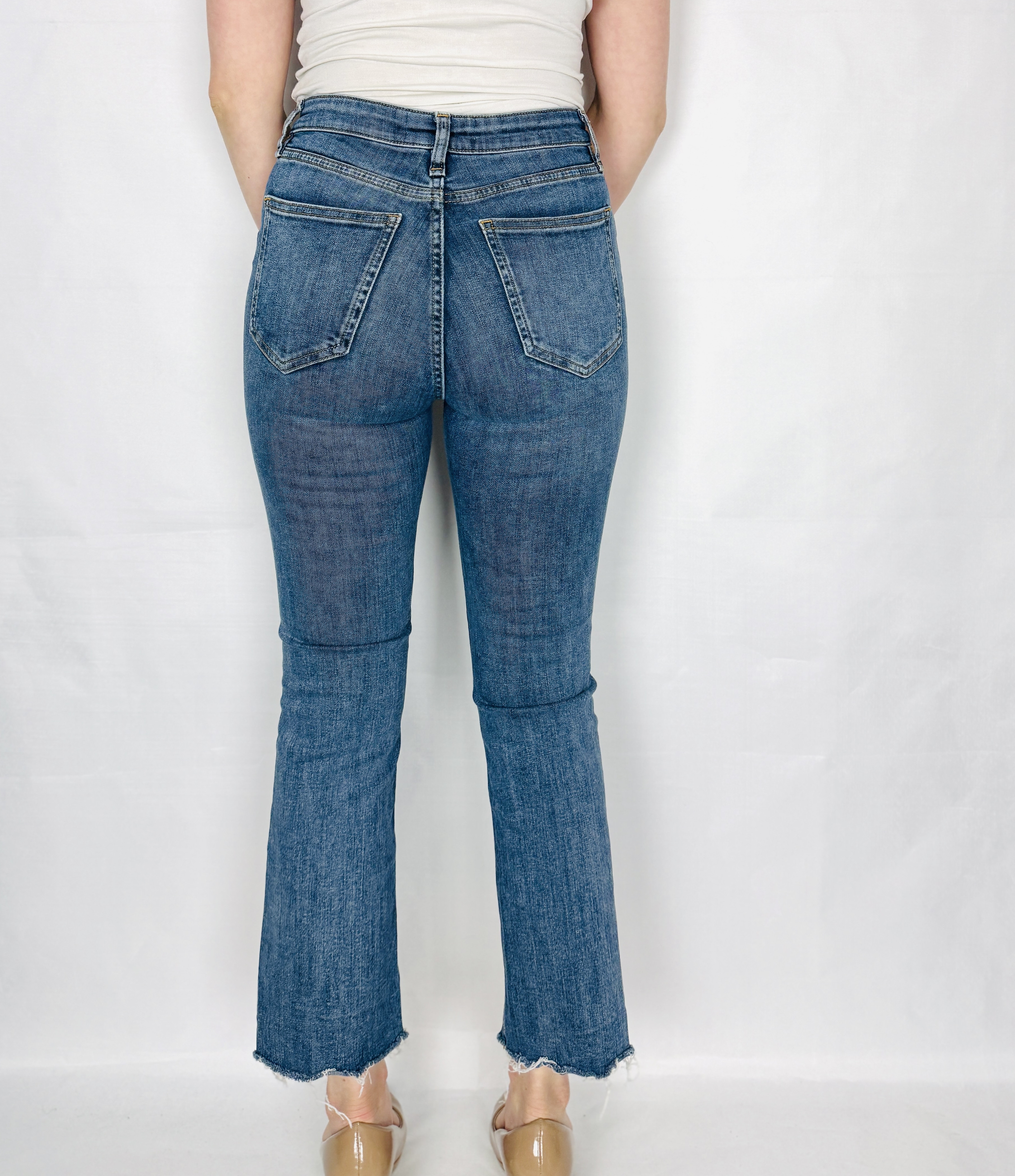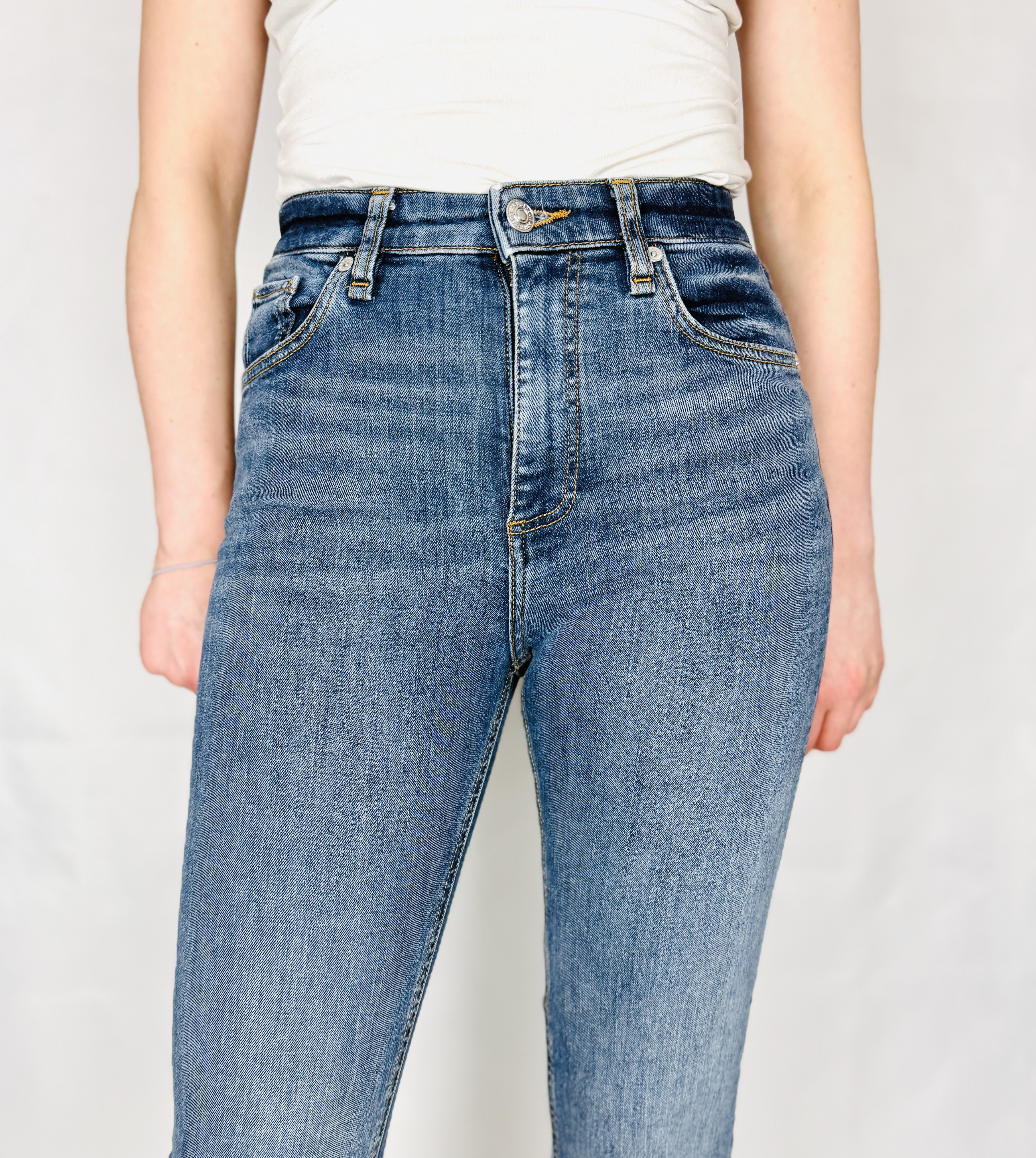 Materiał prezentuje się jako gładki denim o matowym wykończeniu z delikatnym spraniem na udach i subtelnymi przełamaniami przy zgięciach, co dodaje naturalnego życia i autentycznego, lekko vintage’owego wyrazu. Tkanina wydaje się miękko układająca, umiarkowanie strukturalna — trzyma formę, ale jednocześnie dopasowuje się do ruchu ciała, tworząc przyjemne fałdki przy kolanach. Surowe, postrzępione wykończenie nogawek stanowi modny akcent, dodając całości nieformalnego, młodzieńczego charakteru bez utraty szyku.