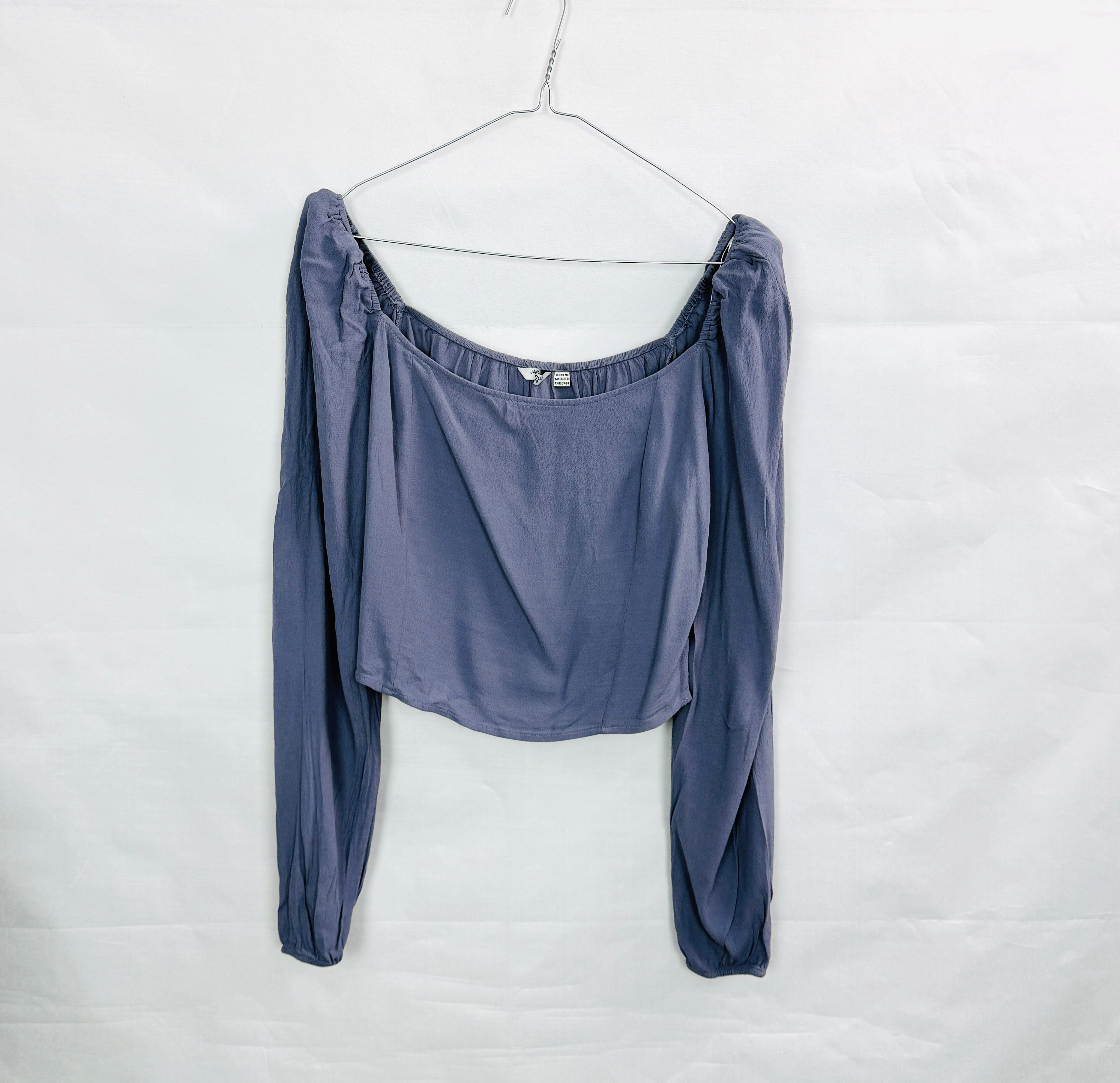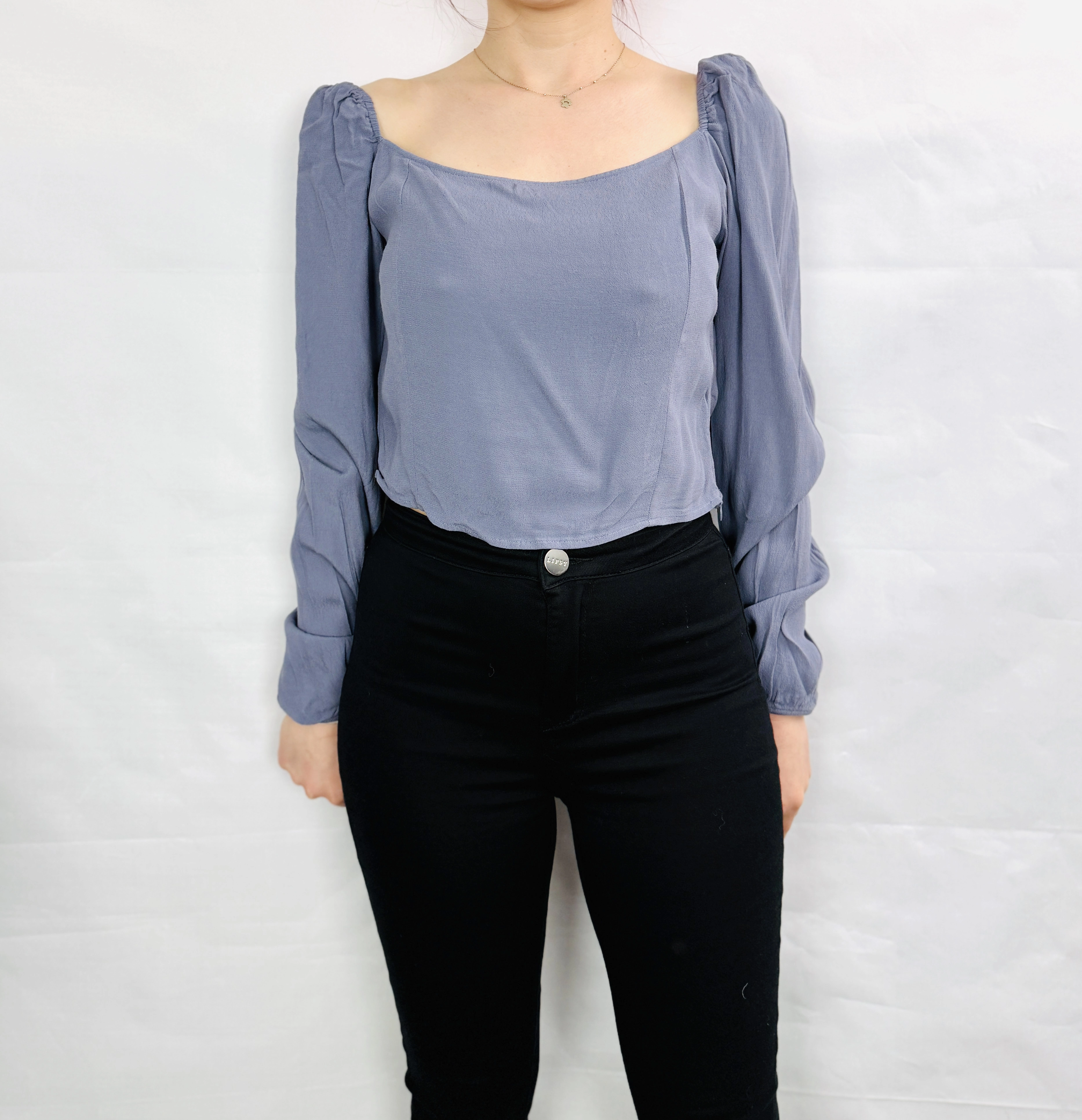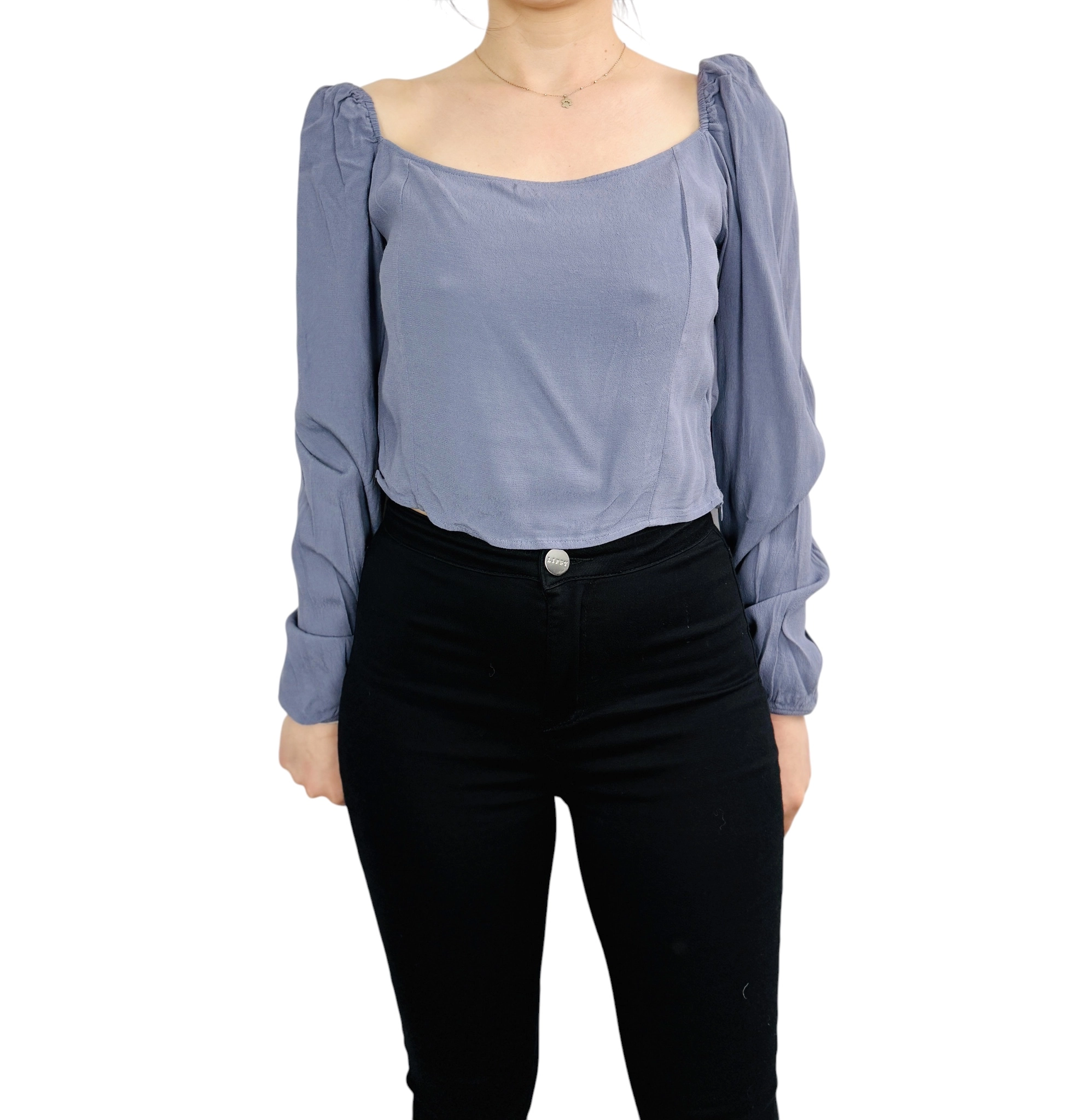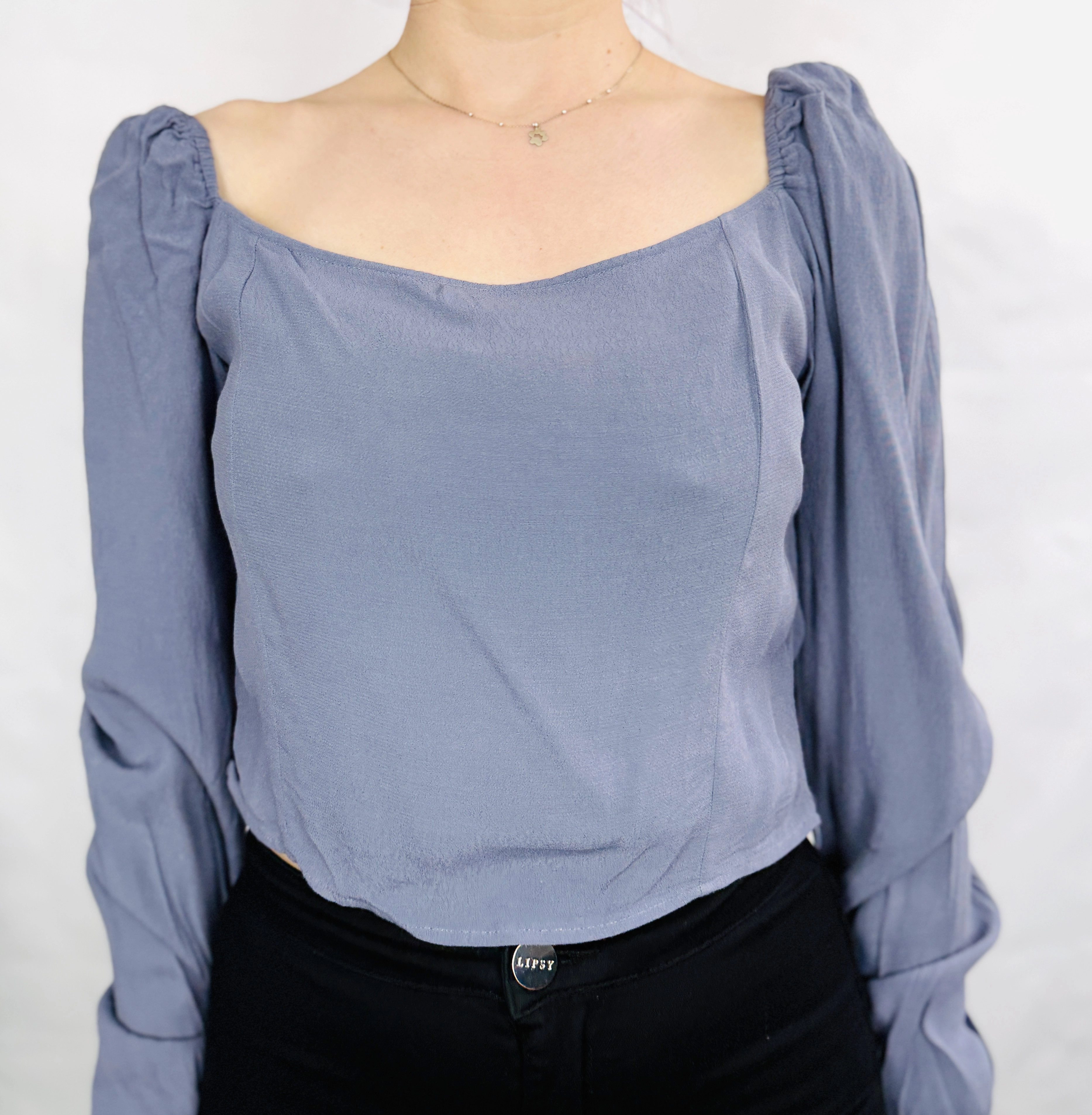 Pod względem oddziaływania na sylwetkę, bluzka ta rewelacyjnie modeluje proporcje ciała. Bufki przy ramionach optycznie poszerzają górną partię, co jest szczególnie korzystne dla pań o sylwetce typu gruszka, ponieważ pozwala zbalansować szersze biodra. Szeroki dekolt wysmukla szyję i dodaje twarzy promienności, natomiast dopasowany dół pięknie zaznacza talię, tworząc efekt figury klepsydry. Niebiesko szary kolor jest niezwykle twarzowy i elegancki, świetnie komponując się z różnymi typami urody i dodając całej postaci nowoczesnego, profesjonalnego wyrazu z nutą romantycznej swobody.