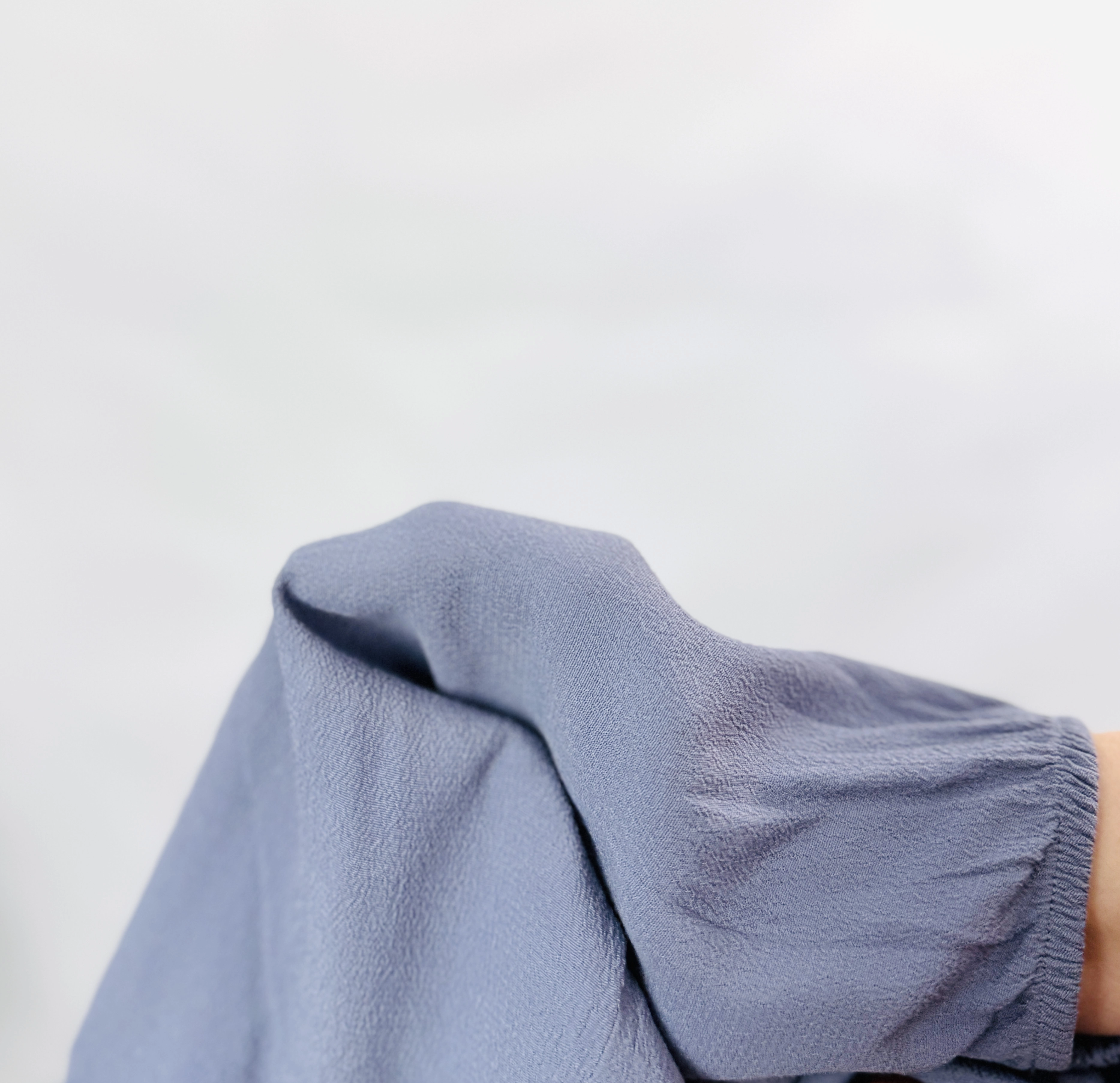 Materiał, z którego wykonano ten model, jest lekki, zwiewny i matowy, charakteryzujący się delikatnie ziarnistą strukturą, która pięknie pracuje ze światłem. Tkanina jest miękko układająca się i delikatnie lejąca, co sprawia, że bufiaste rękawy zachowują swój kształt, a jednocześnie pozostają lekkie i nie przytłaczają sylwetki. Struktura materiału jest przyjemna w dotyku i zapewnia komfort noszenia przez cały dzień, nie krępując ruchów pomimo dopasowanego kroju korpusu. Wysoka jakość wykończenia oraz precyzyjne marszczenia przy ramionach świadczą o dbałości o każdy detal, co czyni tę bluzkę luksusowym dodatkiem do każdej kobiecej szafy.