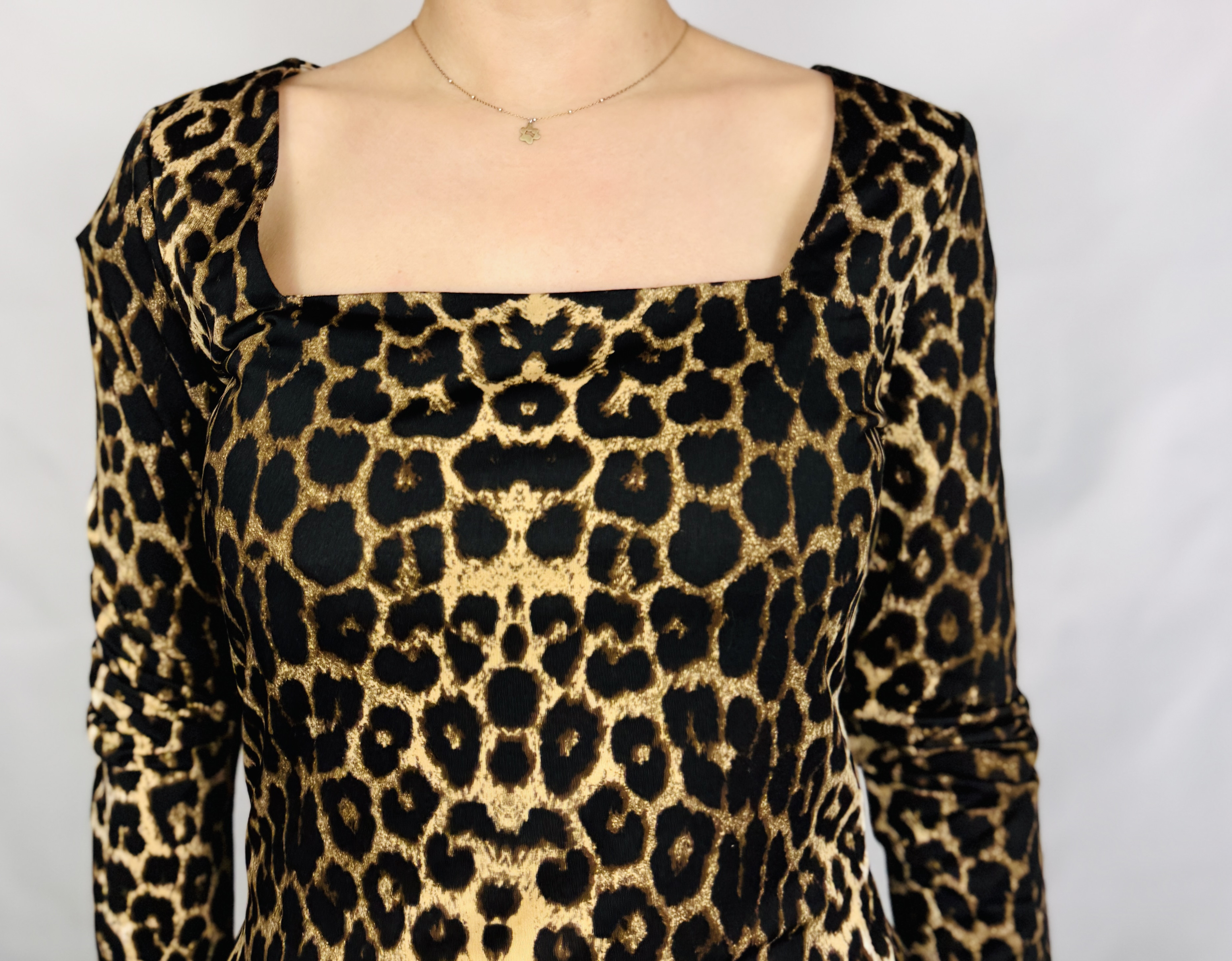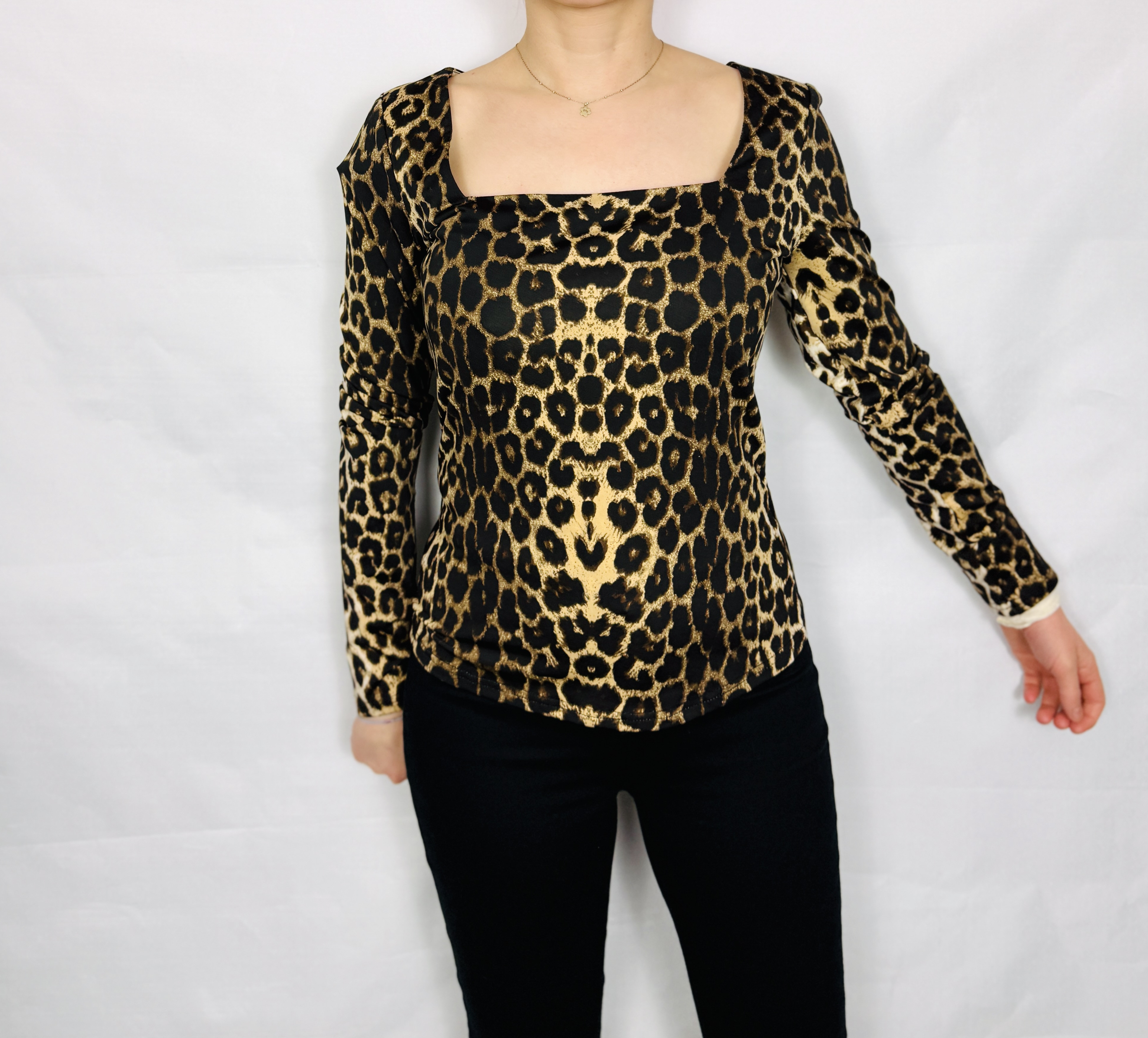 Ta bluzka to wyrazista i jednocześnie bardzo kobieca propozycja — klasyczny wzór panterki w ciepłych, złoto‑czarnych tonacjach nadaje jej zmysłowego, odważnego charakteru, a jednocześnie elegancji dzięki uporządkowanemu układowi plam i regularnemu rytmowi wzoru. Kwadratowy dekolt wnosi do projektu subtelną nutę retro i podkreśla linię szyi, dzięki czemu całość ma szykowny, kobiecy nastrój. To model dla osób, które chcą dodać stylizacji drapieżnego akcentu, nie rezygnując przy tym z klasycznej formy.