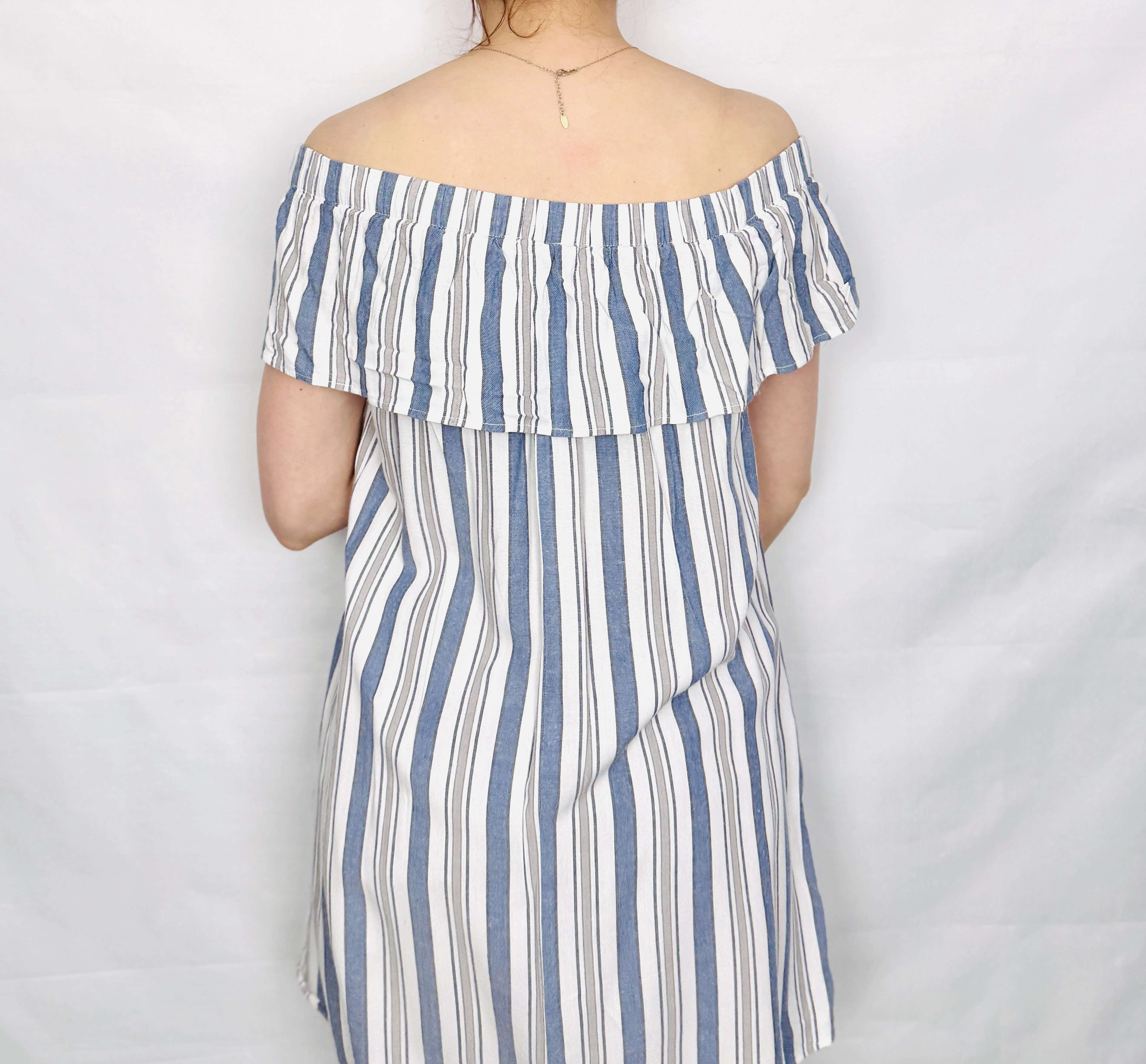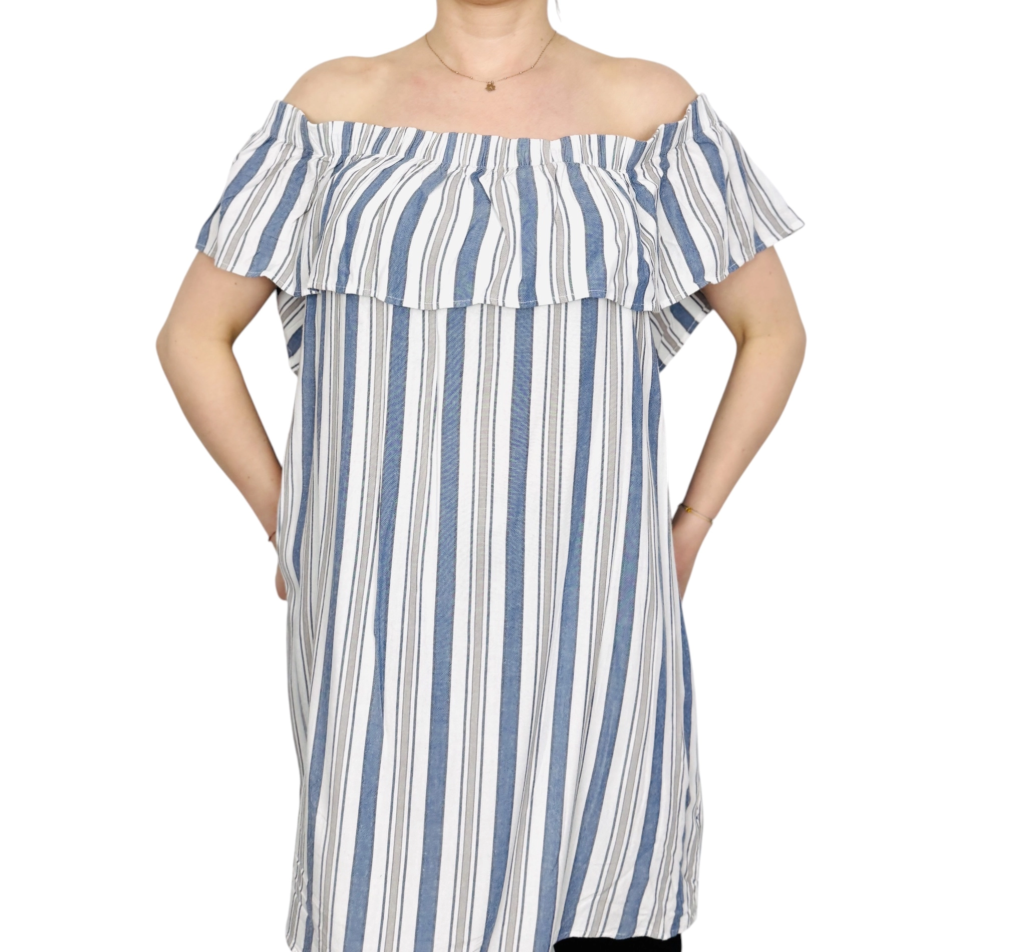 Fason tuniki charakteryzuje się luźną, prostą linią typu oversize, która swobodnie opływa sylwetkę, zapewniając pełną dyskrecję i wygodę. Najbardziej efektownym elementem jest dekolt typu hiszpanka, wykończony elastyczną gumką i ozdobiony szeroką, suto marszczoną falbaną. Falbana ta miękko opada na ramiona i biust, nadając całości trójwymiarowości i romantycznego charakteru. Pionowy układ pasów na korpusie kontrastuje z ich ułożeniem na falbanie, co wprowadza do projektu ciekawą dynamikę i nowoczesny sznyt. Materiał jest lekki, zwiewny i matowy, o strukturze, która pozwala skórze oddychać i pięknie układa się w ruchu.