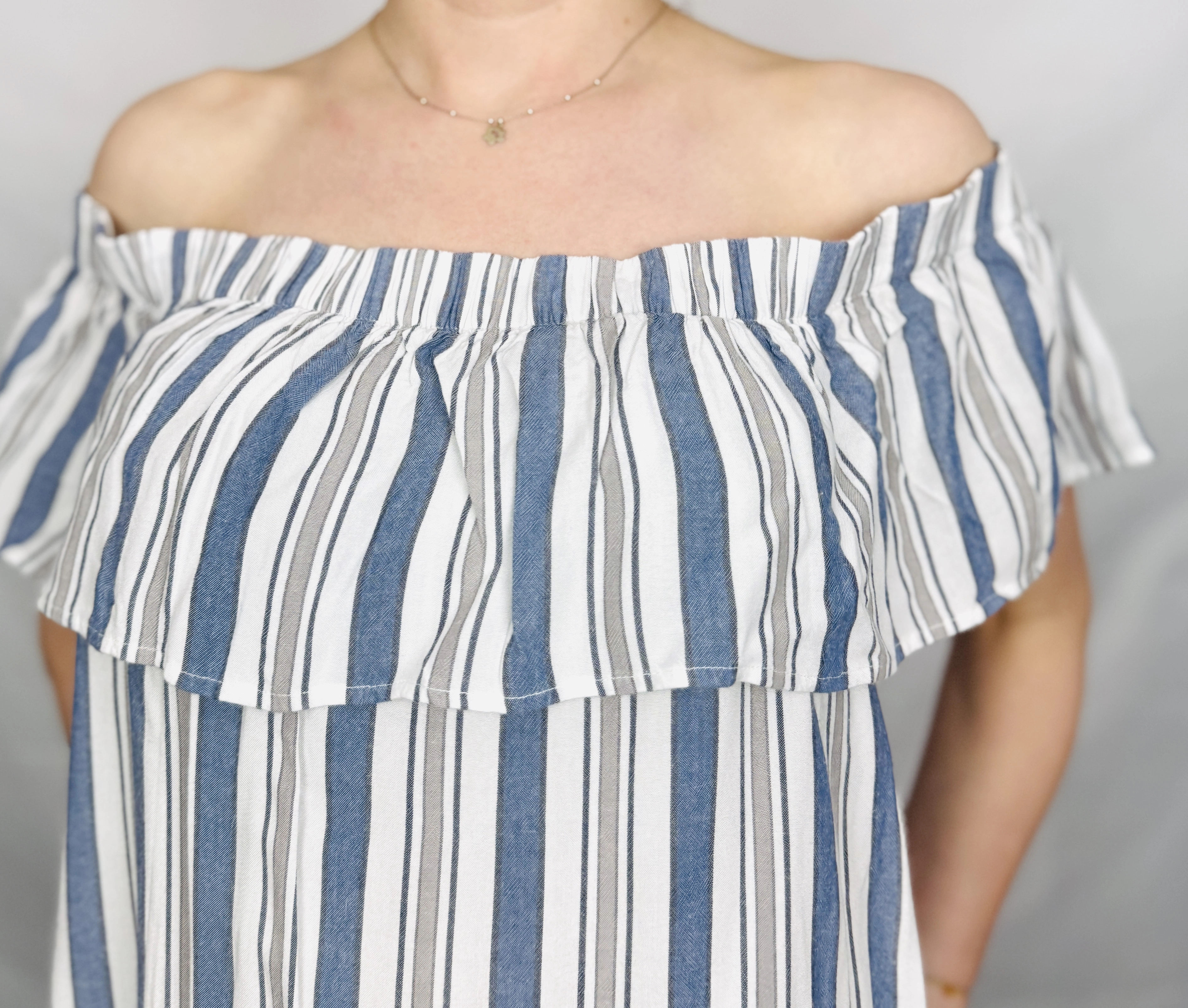 Ta tunika to kwintesencja letniej swobody i marynarskiego szyku, który natychmiast przywodzi na myśl wakacyjny odpoczynek i nadmorskie spacery. Klasyczne połączenie bieli z niebieskimi i szarymi pasami tworzy niezwykle świeży, lekki wizualnie efekt, który doskonale wpisuje się w ponadczasowe trendy. To ubranie, które łączy w sobie dziewczęcy urok z nowoczesną formą, oferując nie tylko stylowy wygląd, ale przede wszystkim nieoceniony komfort podczas ciepłych dni. Całość emanuje naturalnością i radosną energią, stanowiąc idealną bazę do letnich, kobiecych zestawień.
