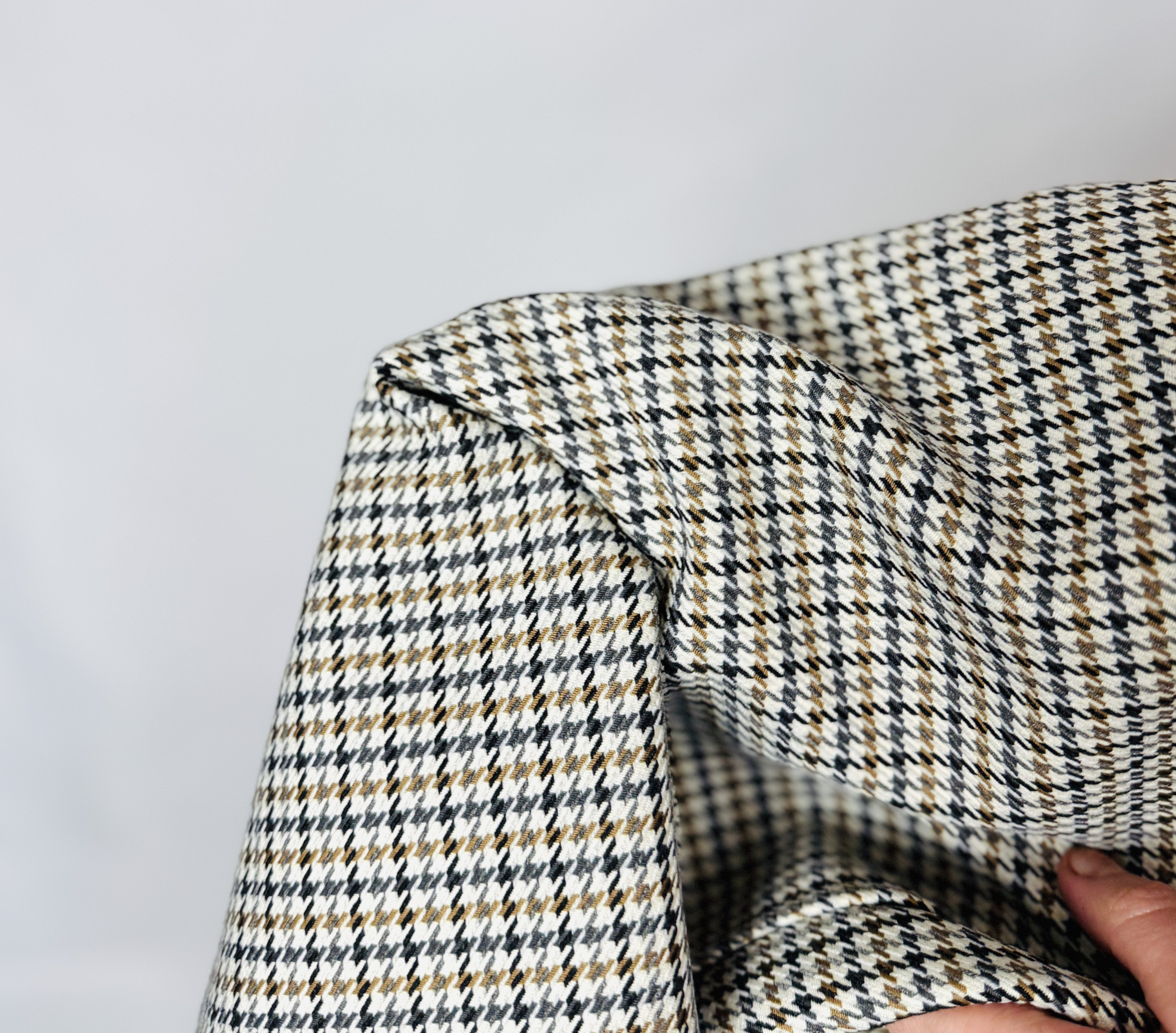Materiał prezentuje się jako zwarty i nieco strukturalny, dzięki czemu spódnica trzyma formę i ma uporządkowaną linię. Powierzchnia tkaniny zdaje się mieć subtelną fakturę, która wzmacnia graficzny efekt pepitki i dodaje powierzchniowości bez nadmiaru objętości; jednocześnie materiał delikatnie otula kontury, tworząc naturalne fałdki przy ruchu, co zapewnia komfort noszenia i estetyczne, dobrze dopracowane wykończenie. To połączenie zwartości i delikatnej miękkości sprawia, że fason wygląda elegancko i profesjonalnie.