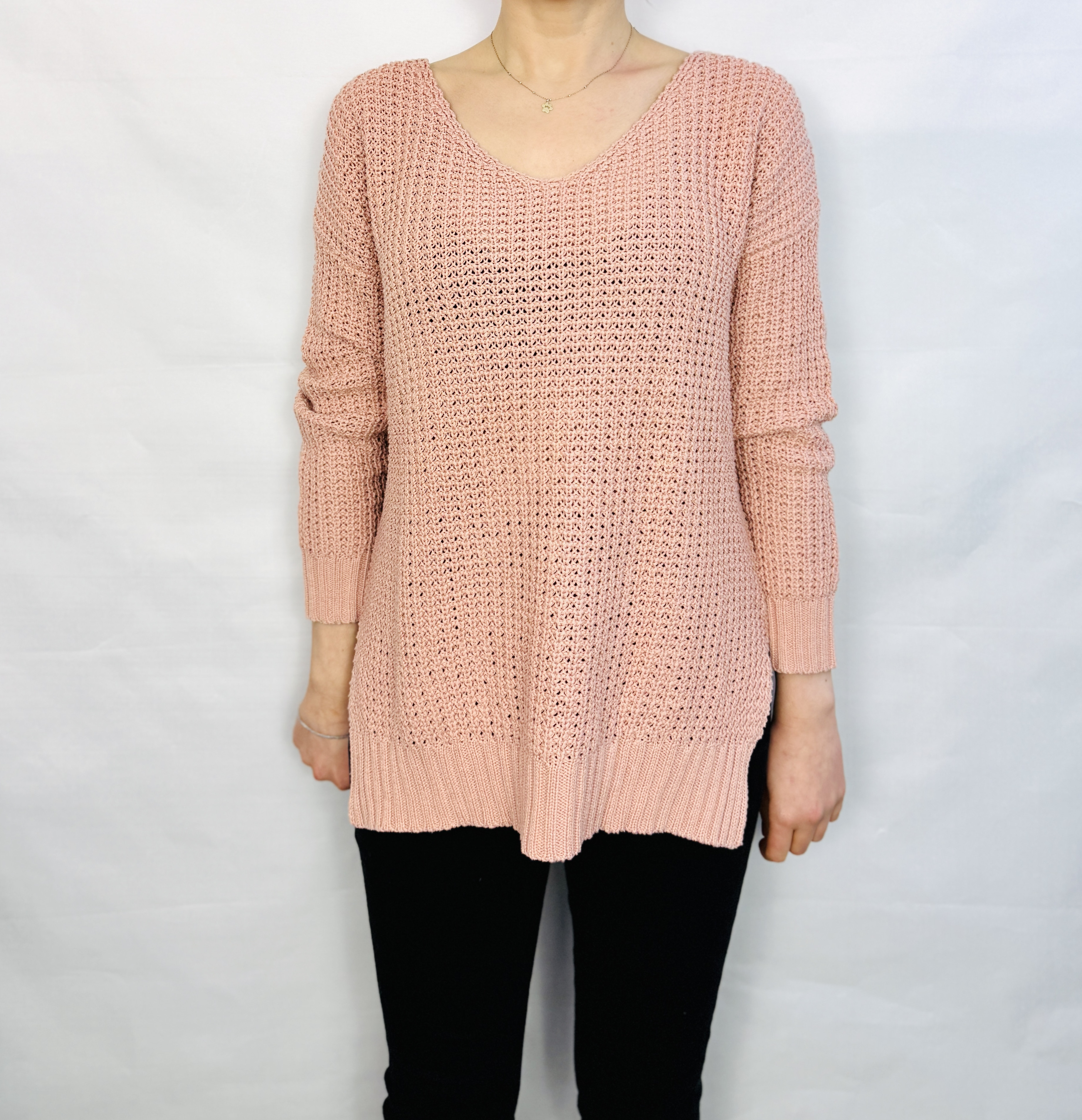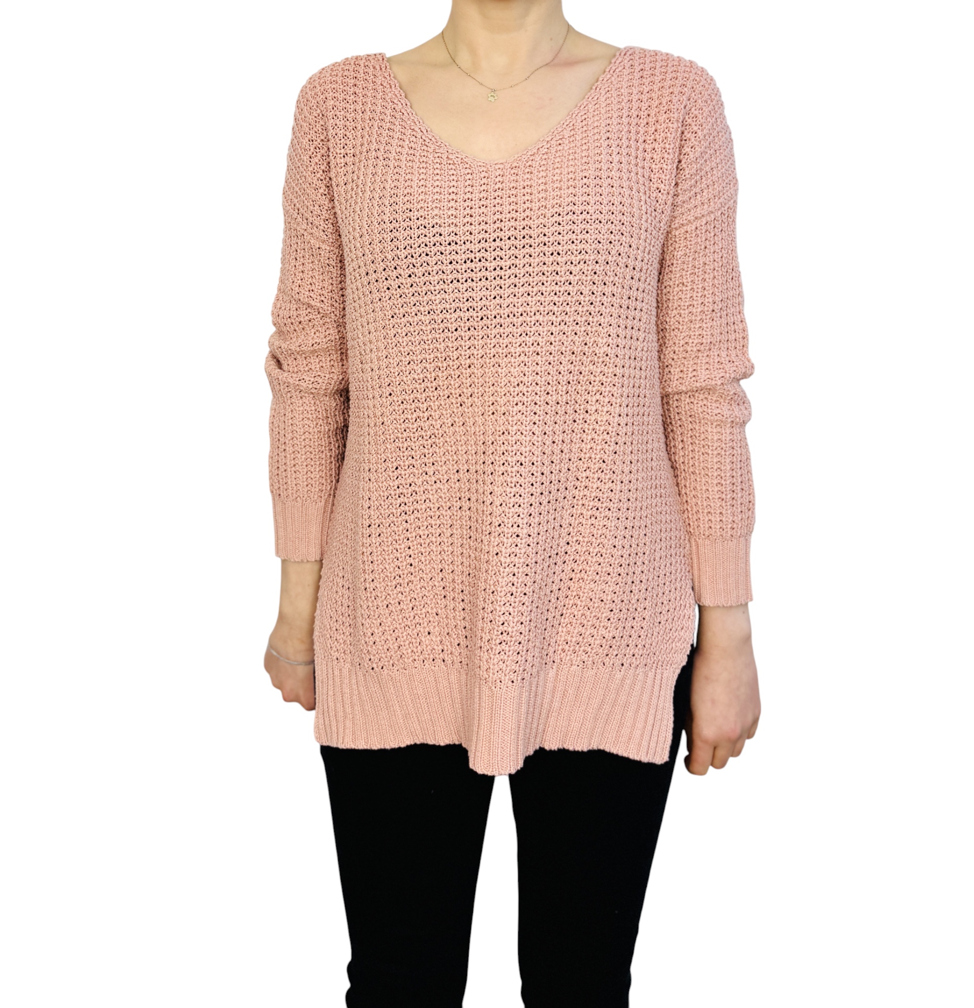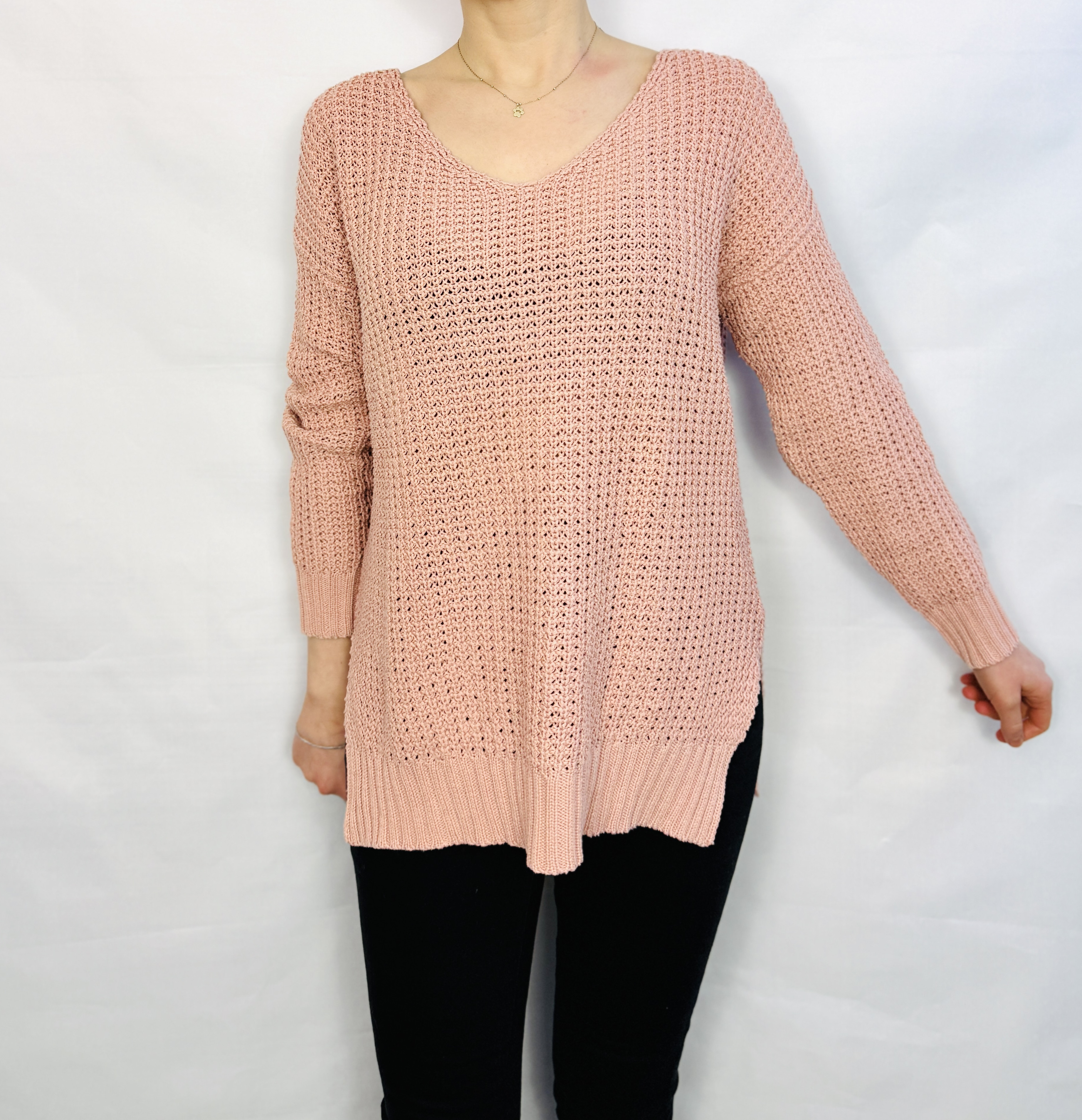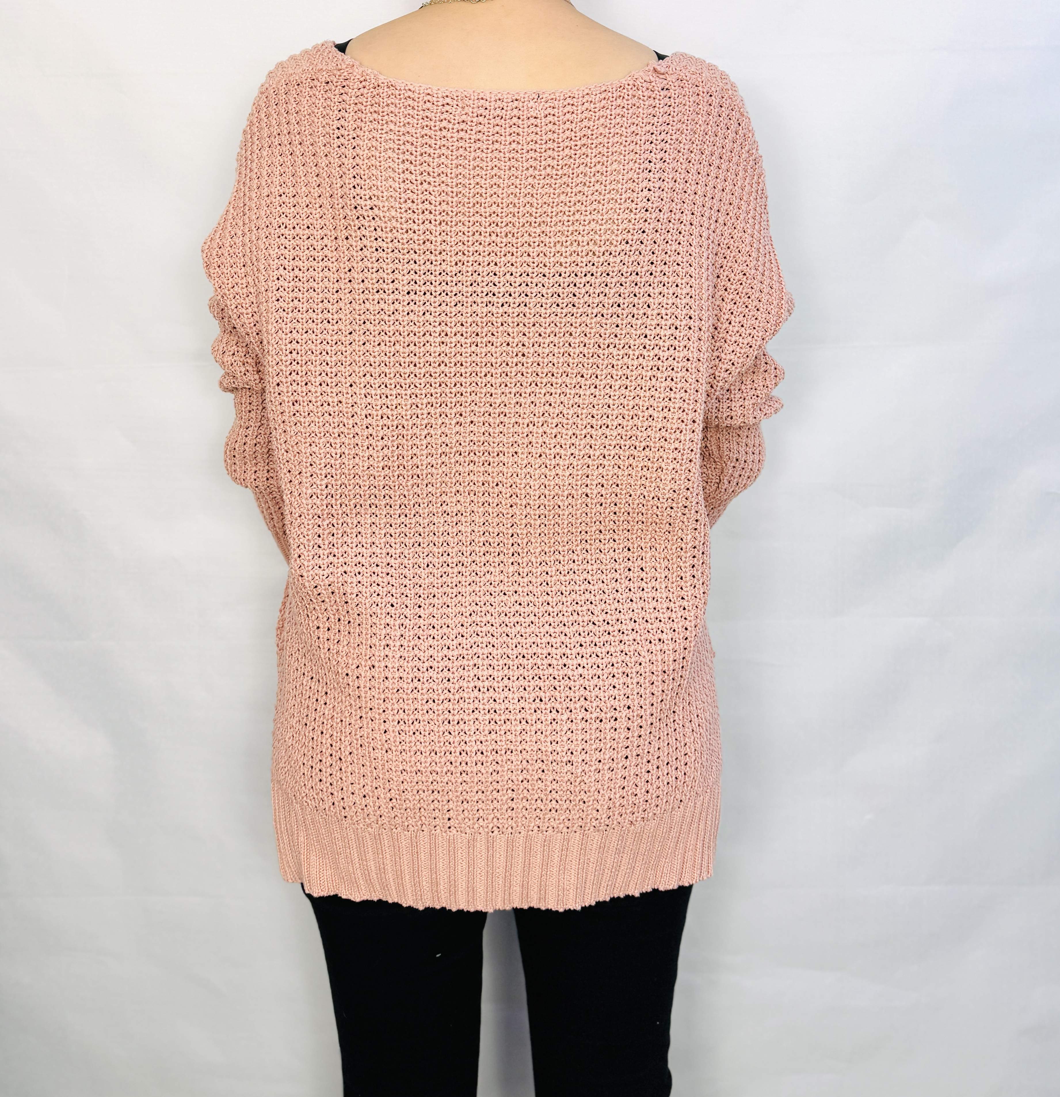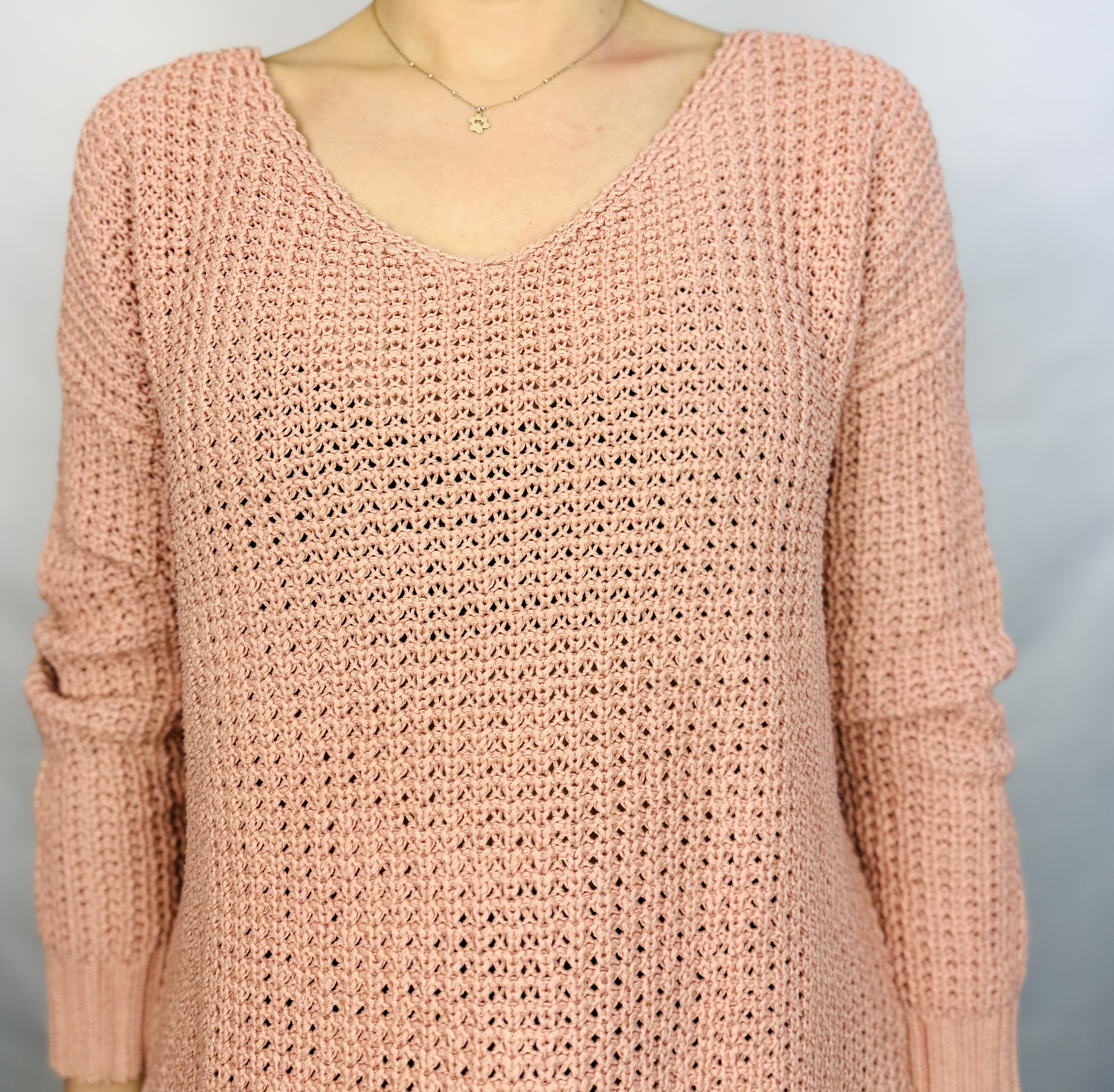 To sweter, który łączy w sobie delikatną kobiecość i wygodę codziennego stylu. Pudrowy róż nadaje mu subtelnego, romantycznego charakteru, a ażurowy splot wprowadza lekką, powietrzną nutę, dzięki której całość nie jest przytłaczająca, lecz świeża i bardzo kobieca. Prosty, spokojny fason sprawia, że sweter emanuje naturalną elegancją — idealny dla tych, którzy cenią nieprzesadzoną estetykę i komfort noszenia.