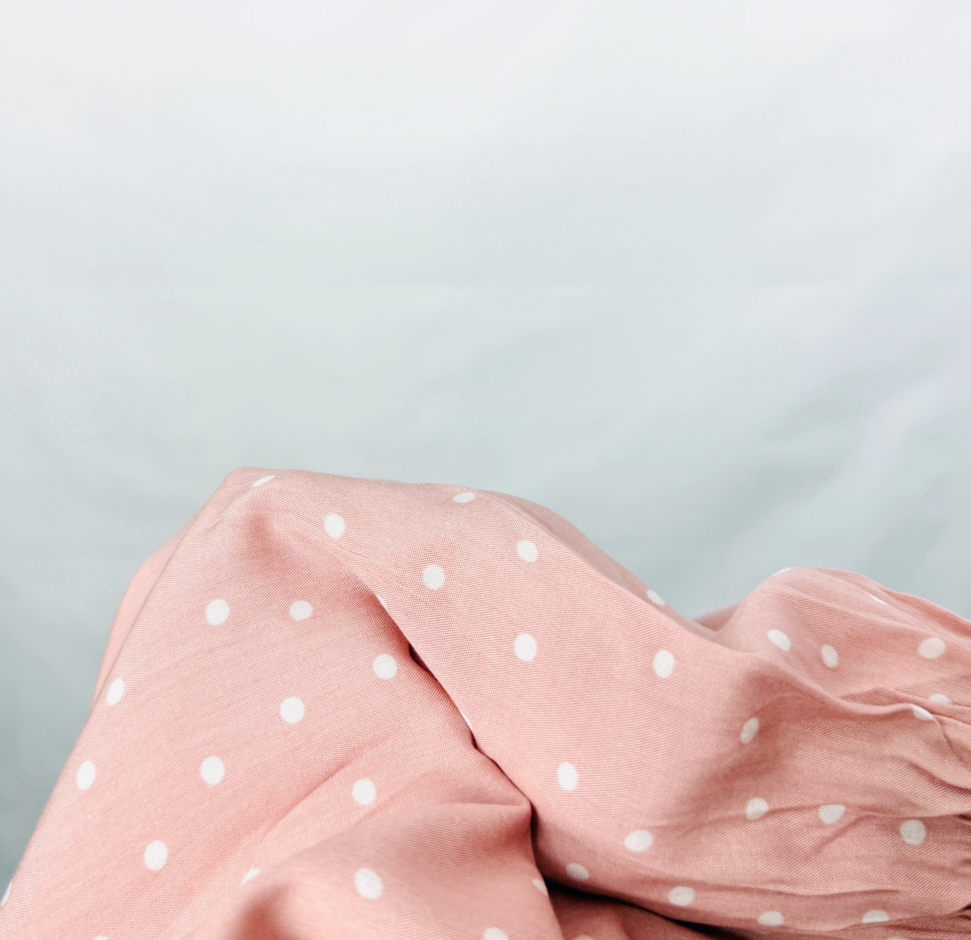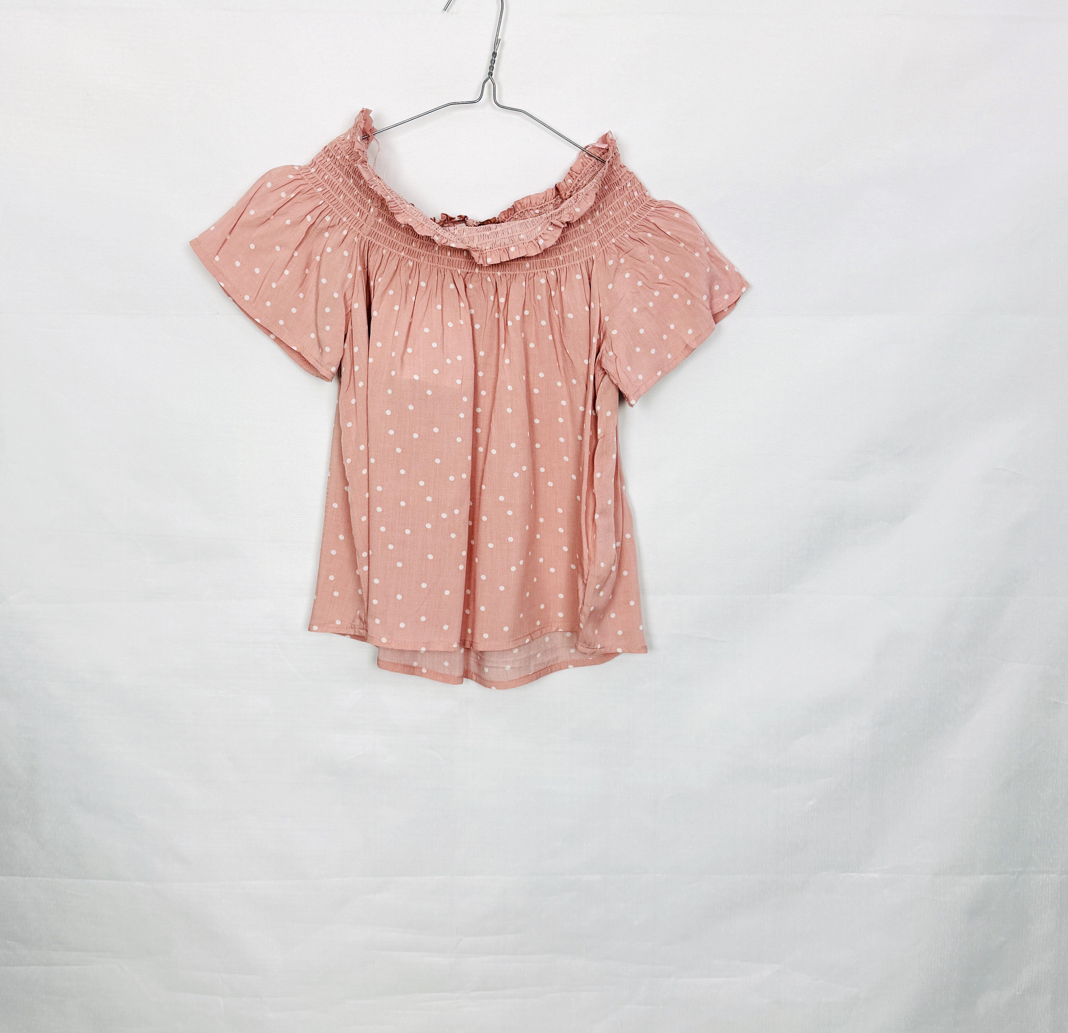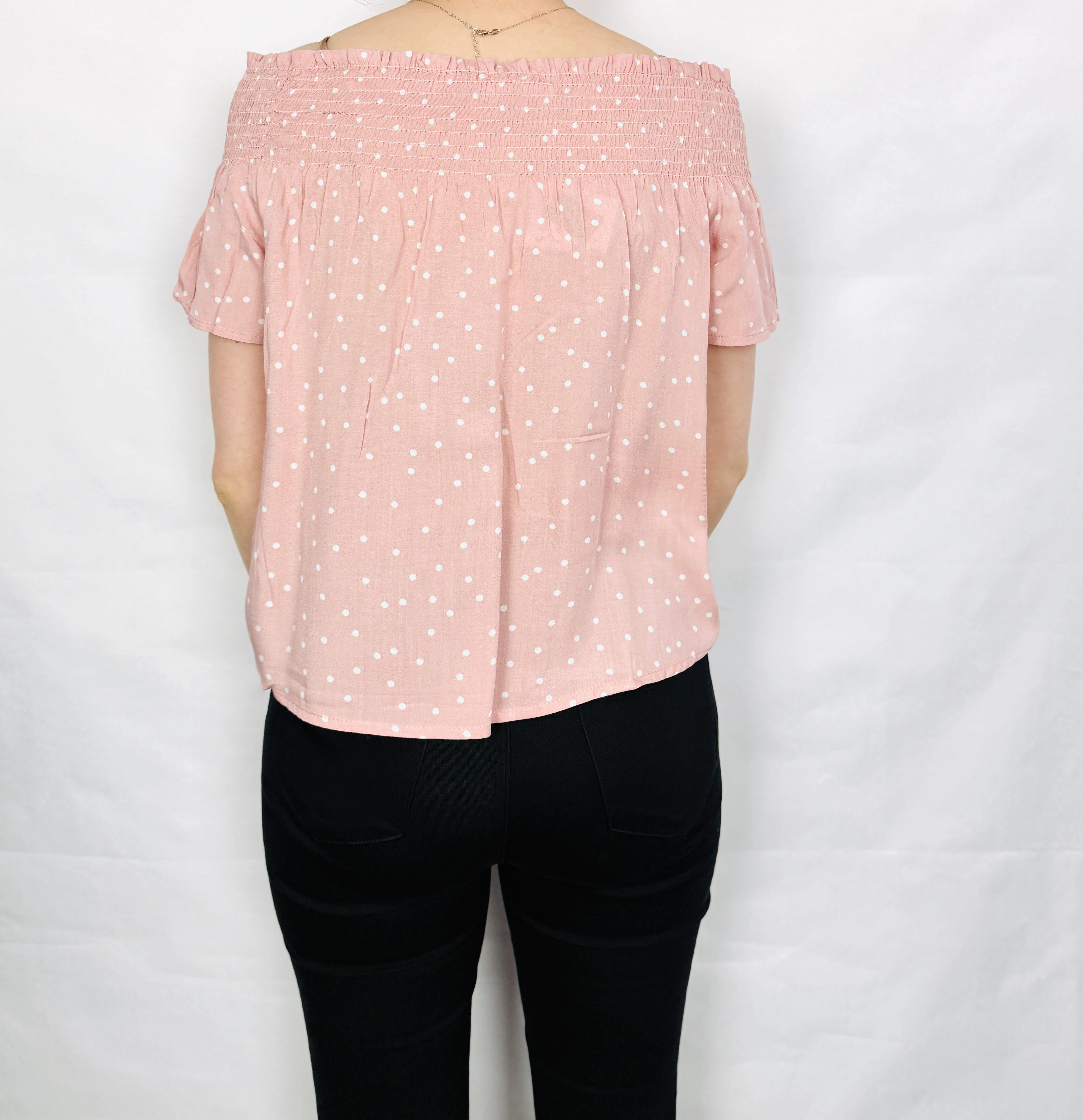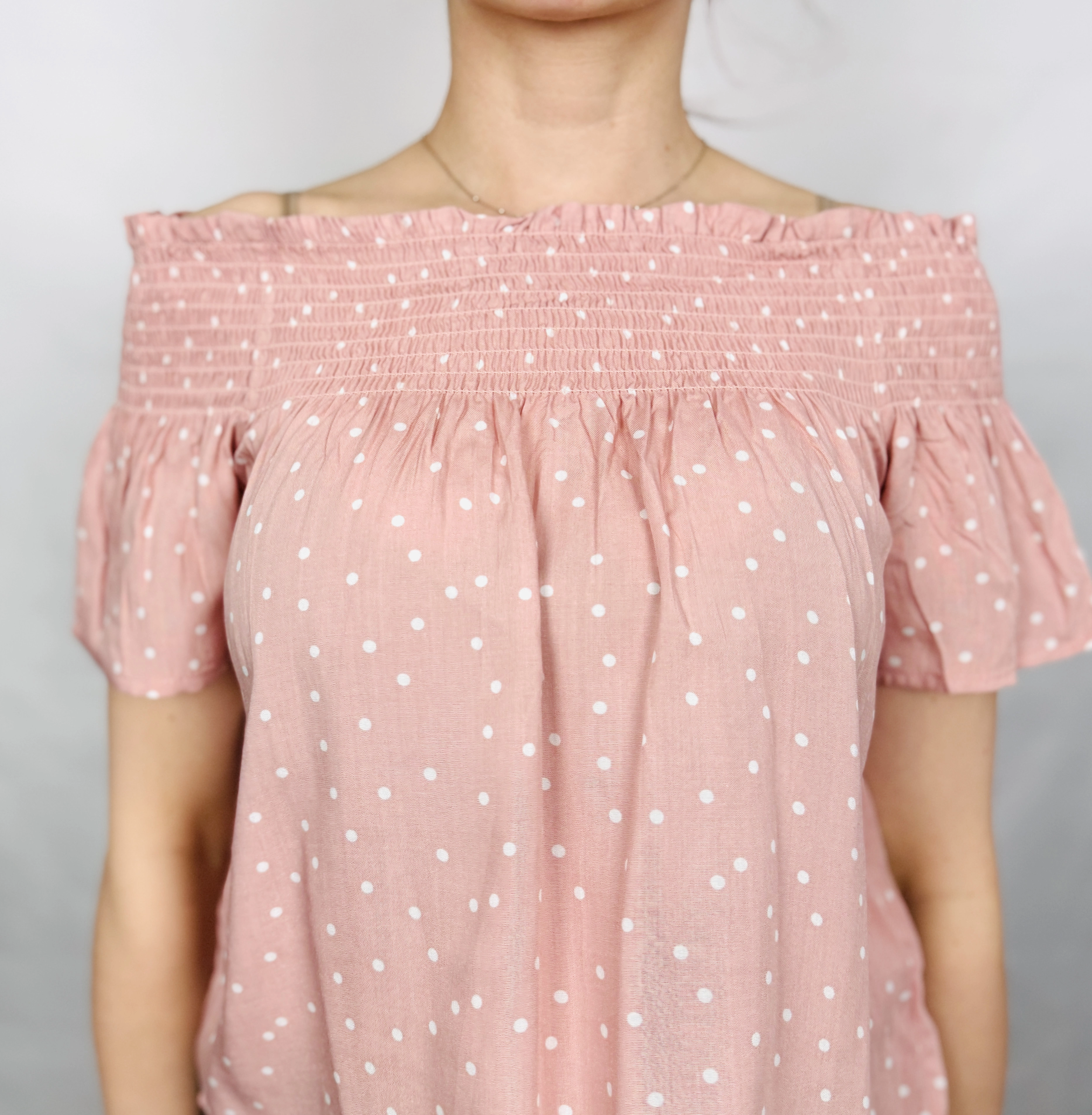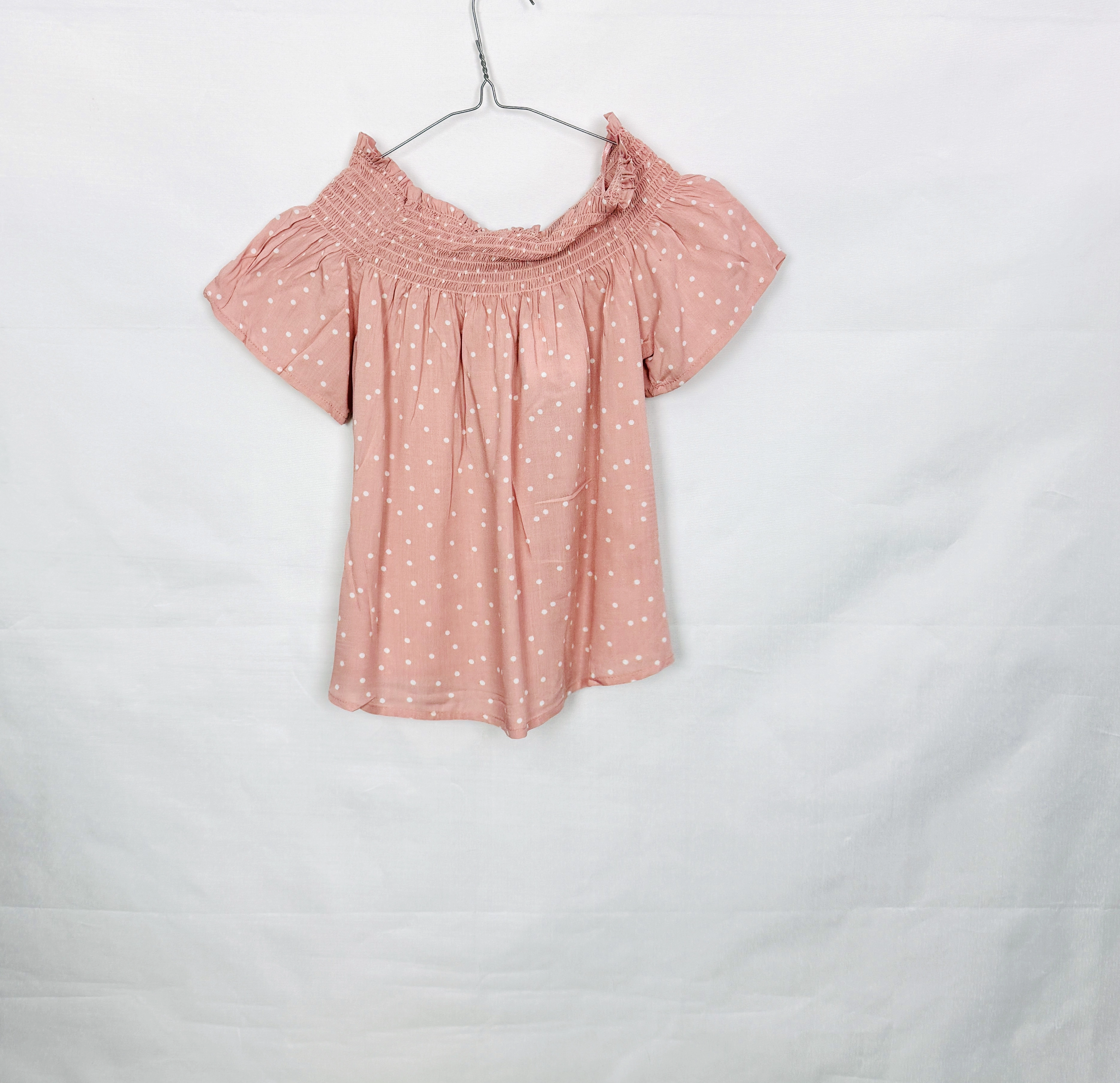 Różowa bluzka w białe groszki z hiszpańskim dekoltem M 38