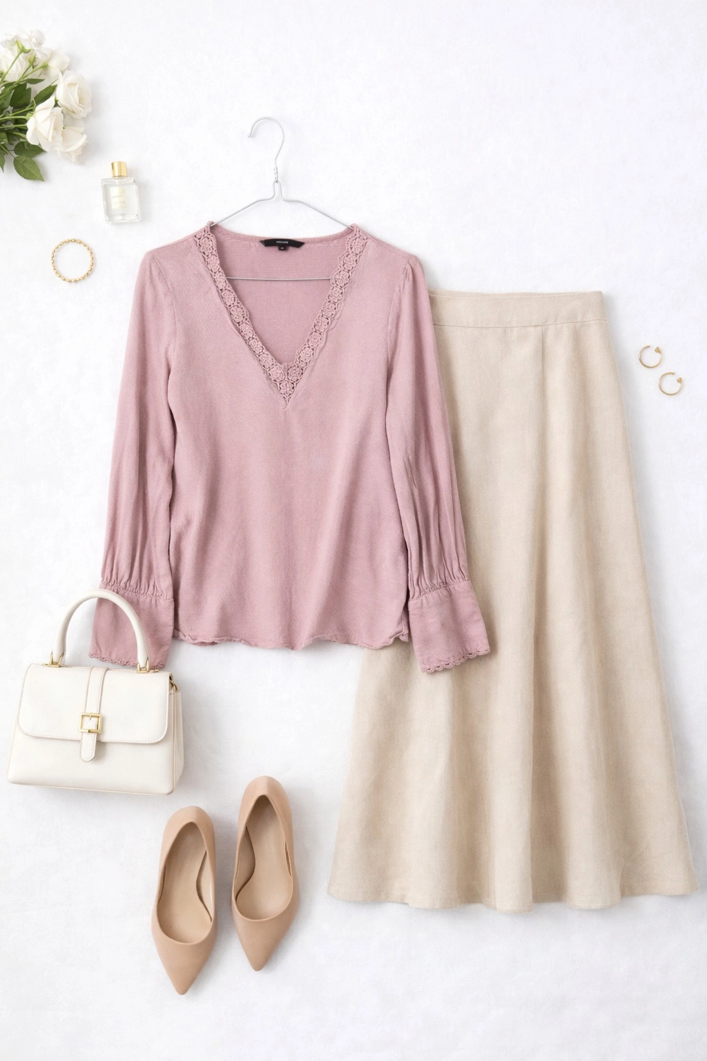 Fason bluzki charakteryzuje się swobodną, lekko luźniejszą linią, która miękko otula ciało, zapewniając pełen komfort noszenia przez cały dzień. Najbardziej zachwycającym elementem projektu jest głęboki dekolt w kształcie litery V, który został wykończony misterną, szeroką koronką o kwiatowym motywie. Ten romantyczny akcent pięknie eksponuje szyję oraz obojczyki, nadając całości finezji i powabu. Długie rękawy o swobodnym kroju zakończone są delikatnymi marszczeniami oraz koronkowym obszyciem przy mankietach, co tworzy spójną całość z dekoltem i dodaje projektowi luksusowego, dopracowanego wyrazu.