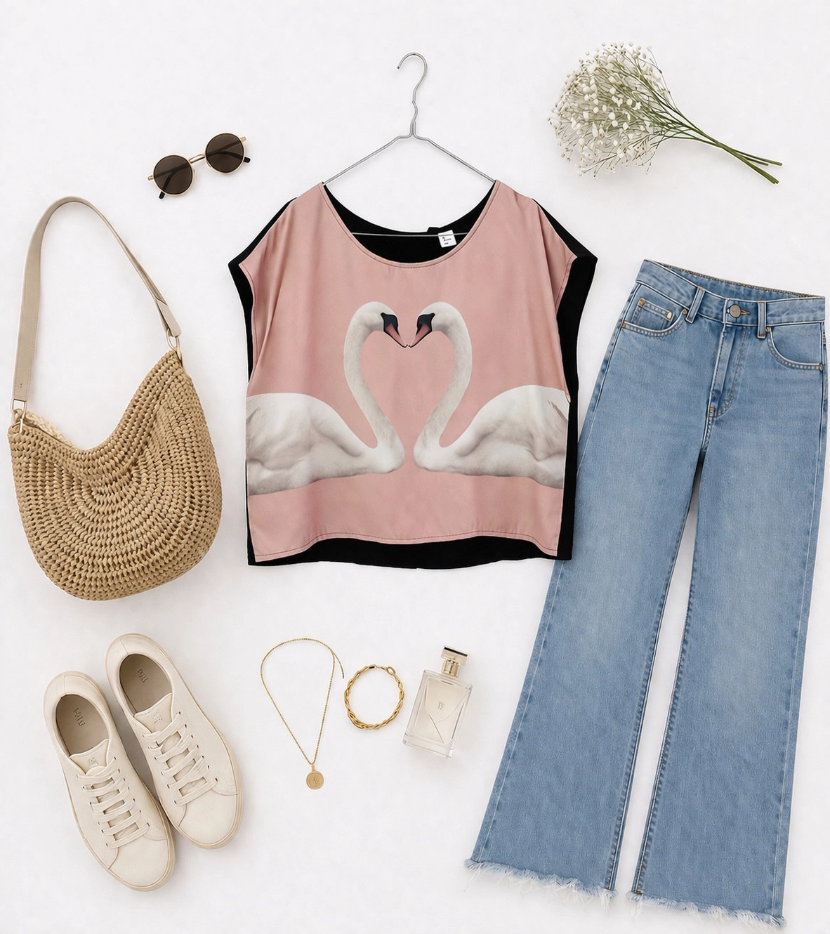 Ta unikalna bluzka to fascynujące połączenie romantycznej delikatności z nowoczesnym, kontrastowym designem, który zaskakuje przy każdym ruchu. Front ubrania w odcieniu pudrowego różu, ozdobiony artystycznym nadrukiem dwóch łabędzi układających się w kształt serca, emanuje spokojem i baśniowym wdziękiem. Jednak najciekawszy element ukryty jest z tyłu – plecy bluzki wykonano w całości z głębokiej czerni, co nadaje całości intrygującego, nowoczesnego charakteru. To idealna propozycja dla kobiet, które kochają nieoczywiste rozwiązania w modzie i chcą połączyć subtelną, kobiecą estetykę z odrobiną odważnego, graficznego stylu.