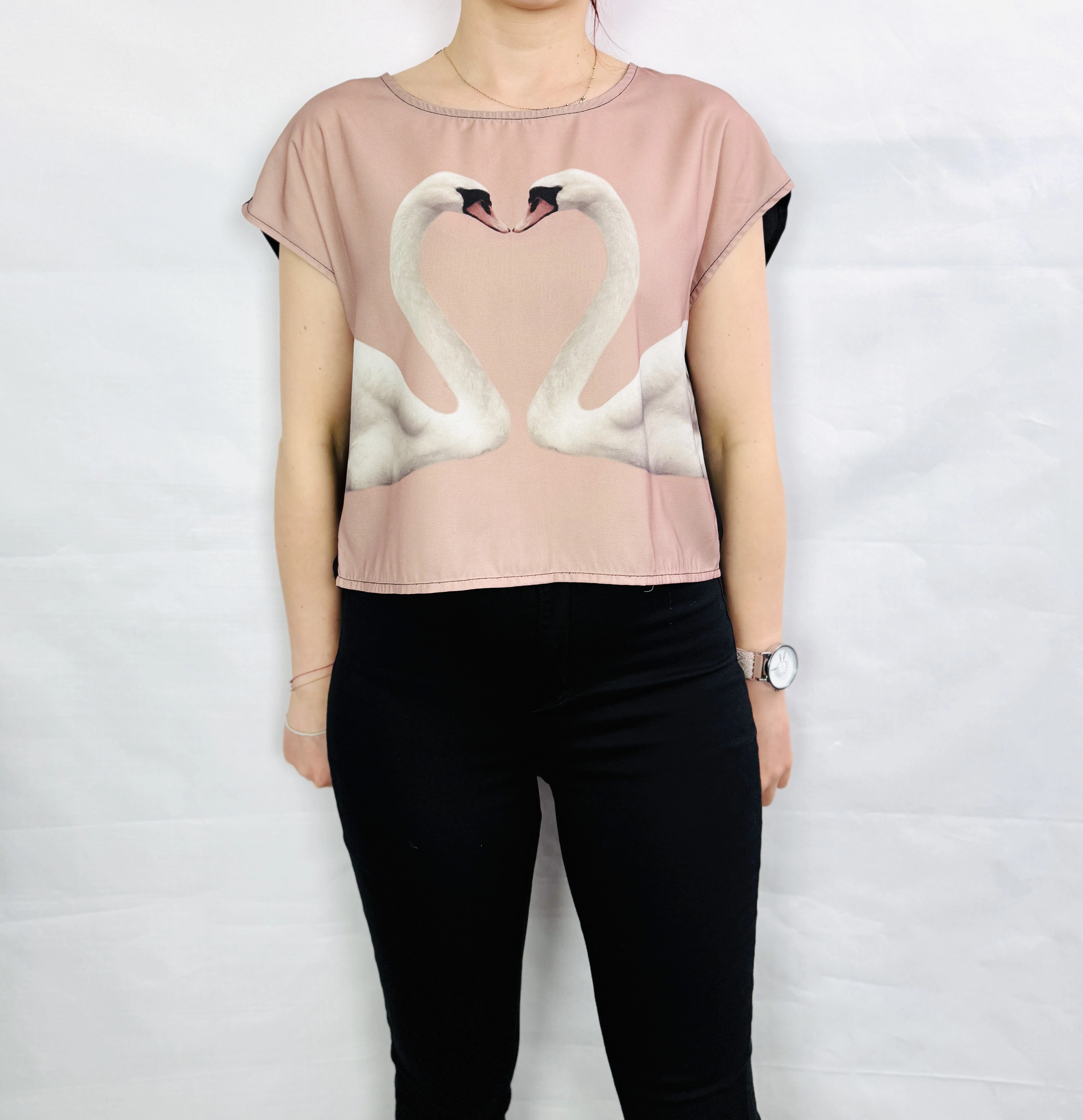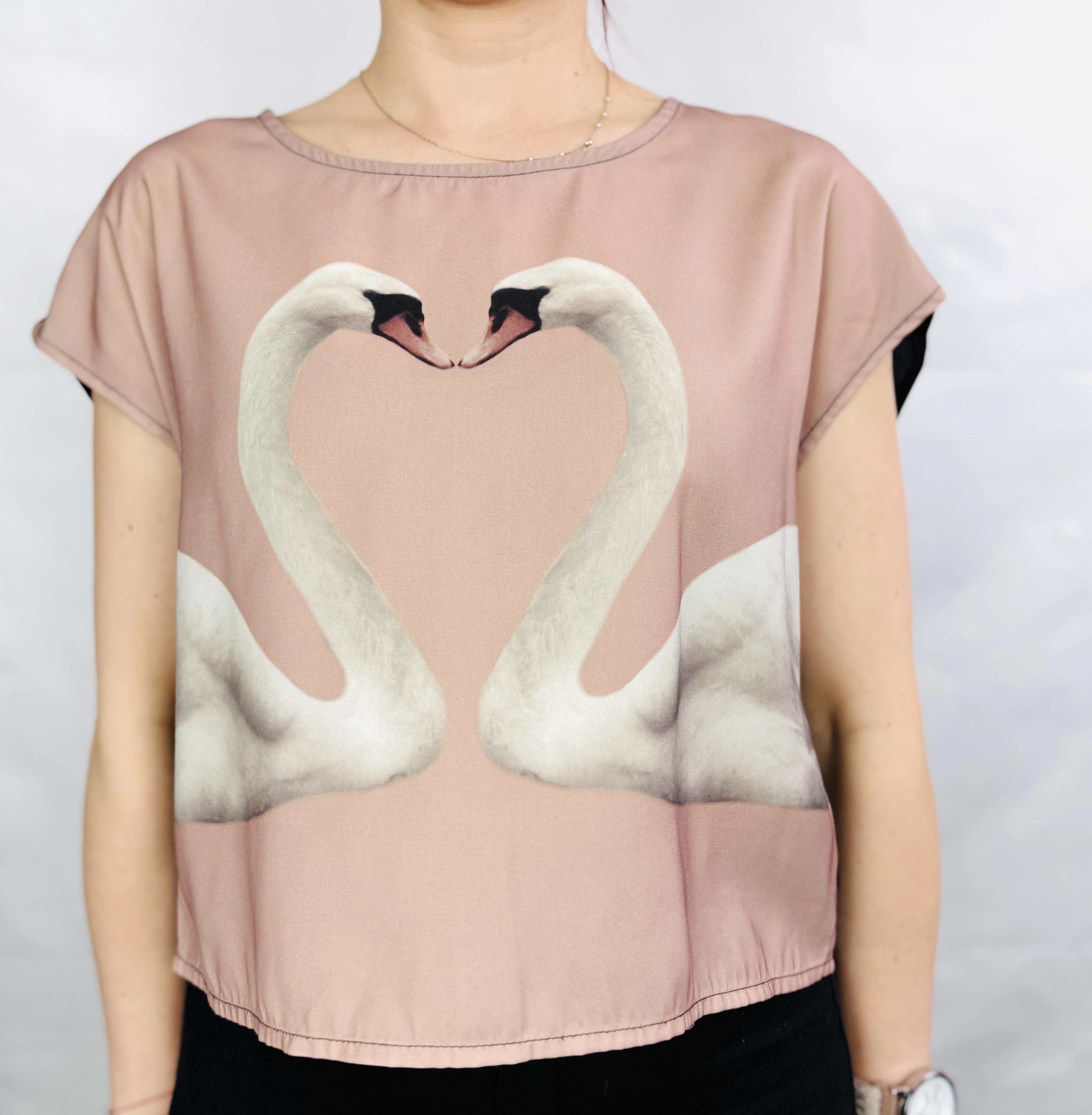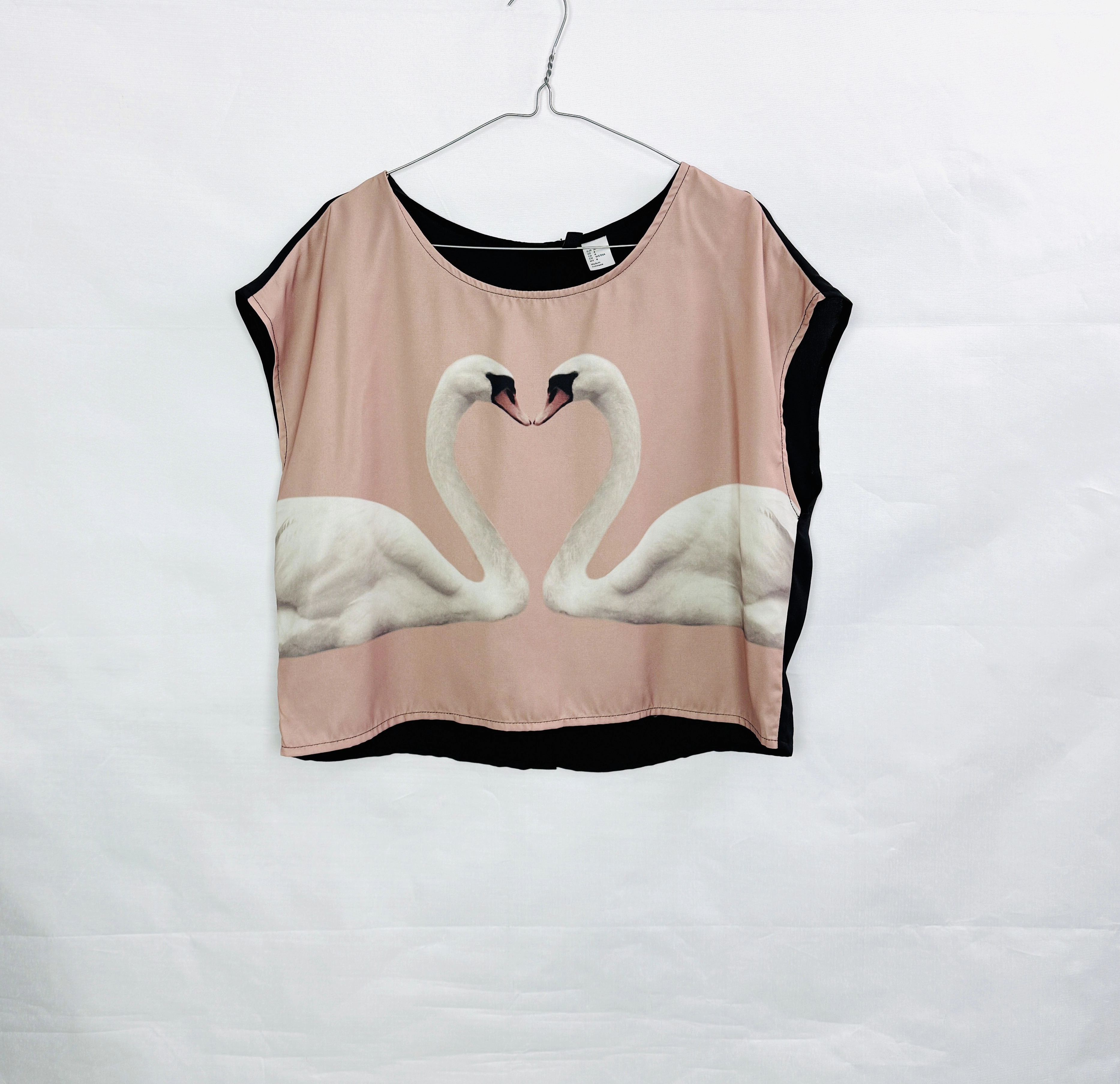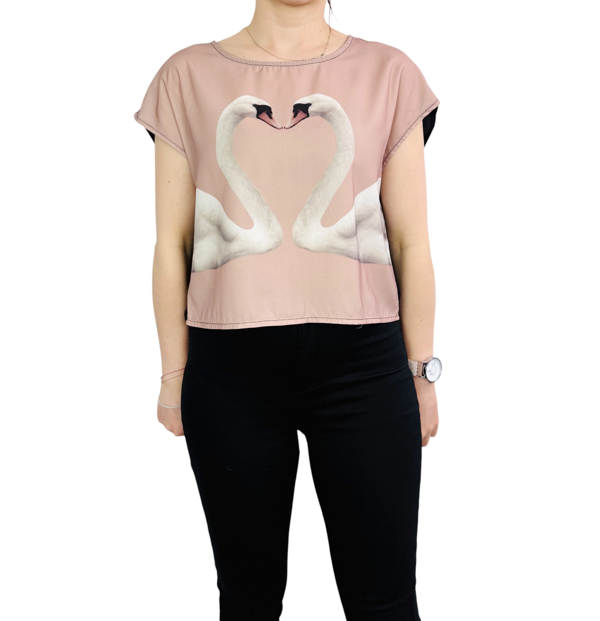 Różowa bluzka z łabędziami i czarnym tyłem S 36