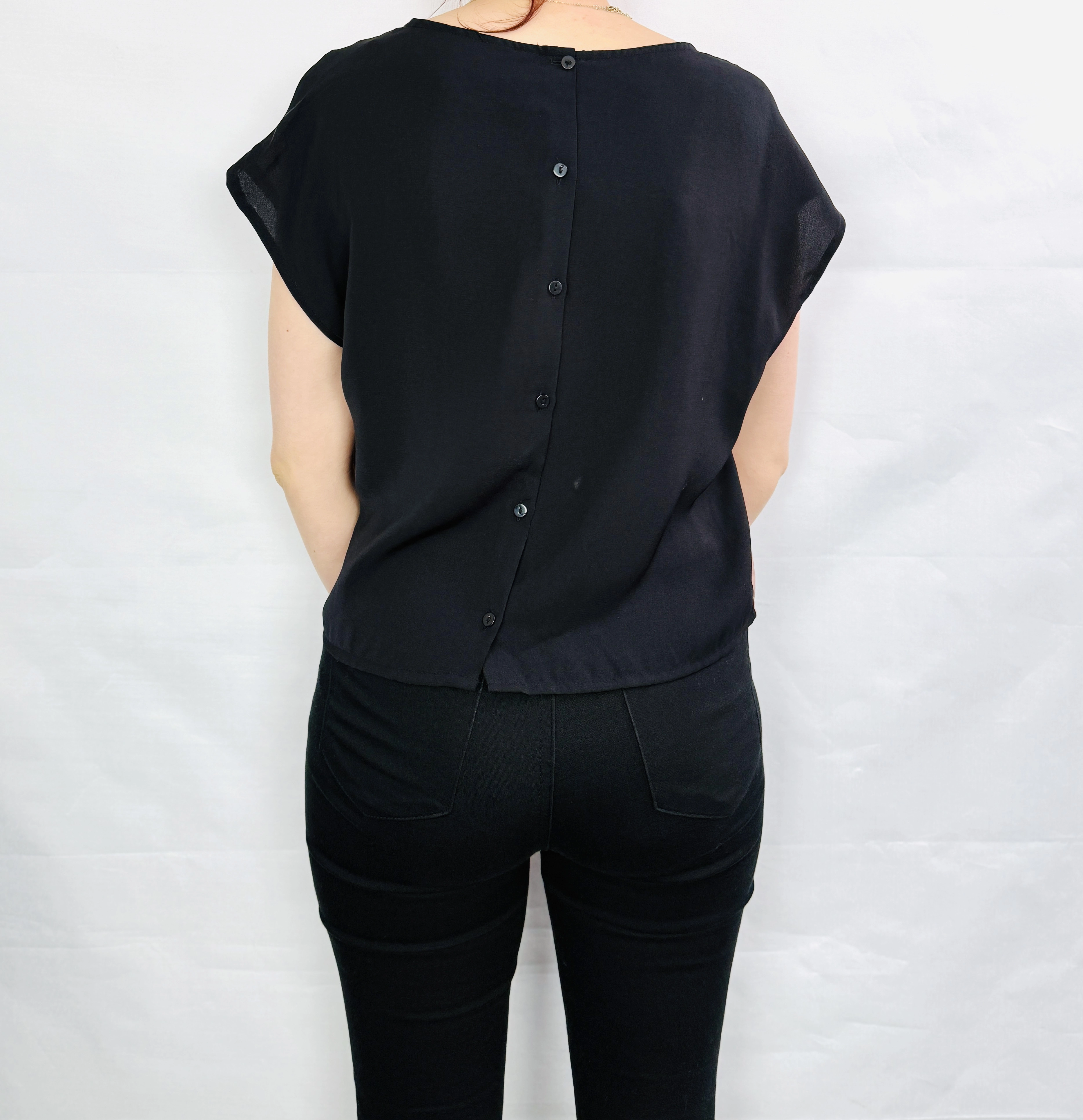 Fason bluzki opiera się na prostym, swobodnym kroju typu oversize, który gwarantuje pełen komfort i niezwykłą lekkość noszenia. Szeroki, łódkowy dekolt z przodu pięknie eksponuje szyję, natomiast tył zaskakuje pionowym rzędem dekoracyjnych, drobnych guzików, które biegną przez całą długość pleców. To funkcjonalny i niezwykle stylowy detal, który przełamuje gładką strukturę ciemnej tkaniny. Krótkie rękawy o fasonie kimono płynnie łączą się z linią ramion, dodając sylwetce miękkości. Bluzka sięga do linii bioder, a jej dół został wykończony delikatnym przeszyciem, które pozwala na swobodne układanie się materiału na sylwetce.