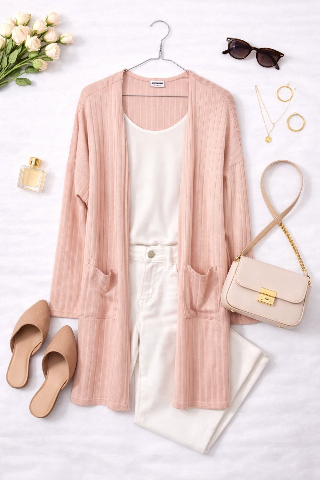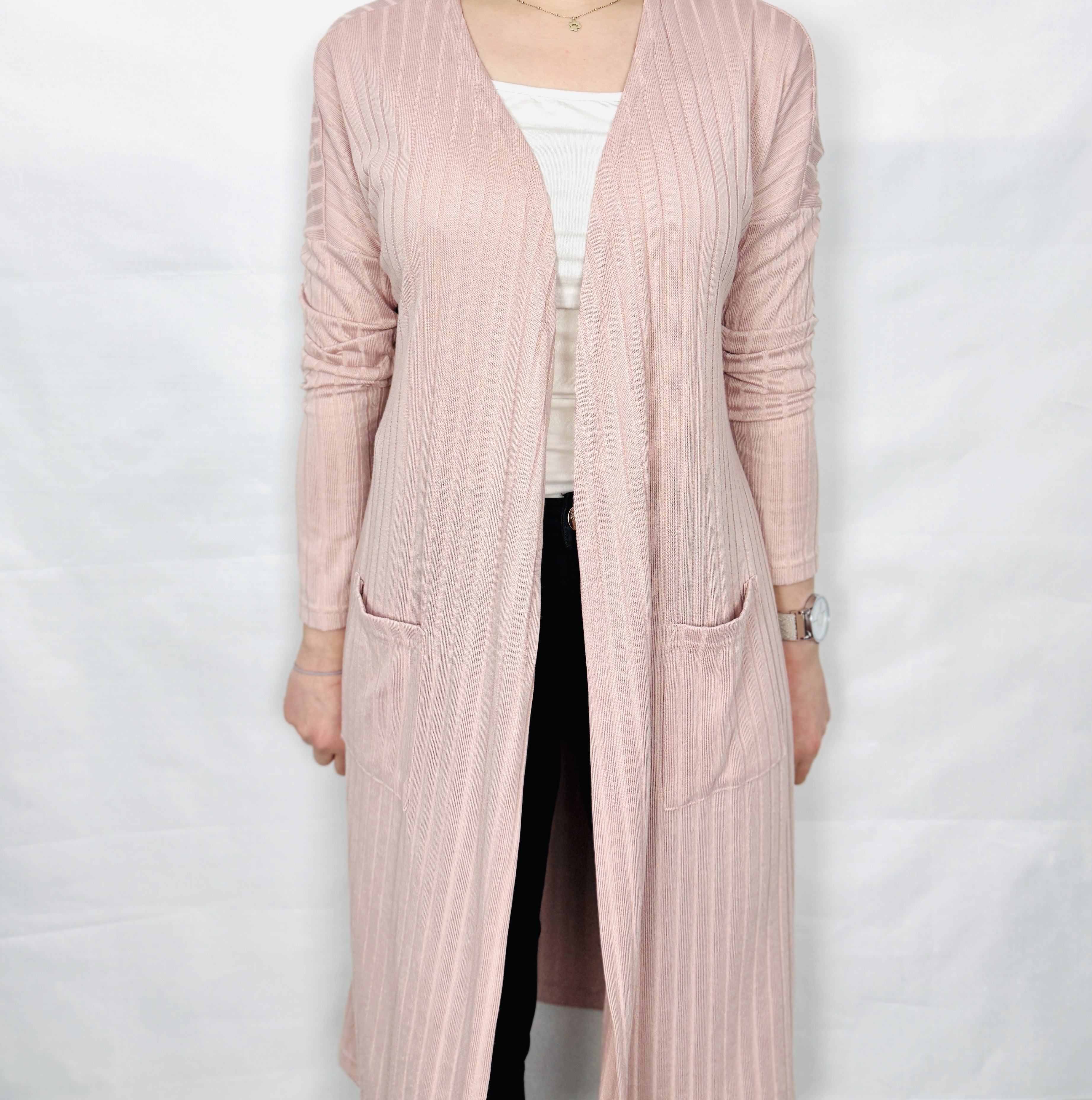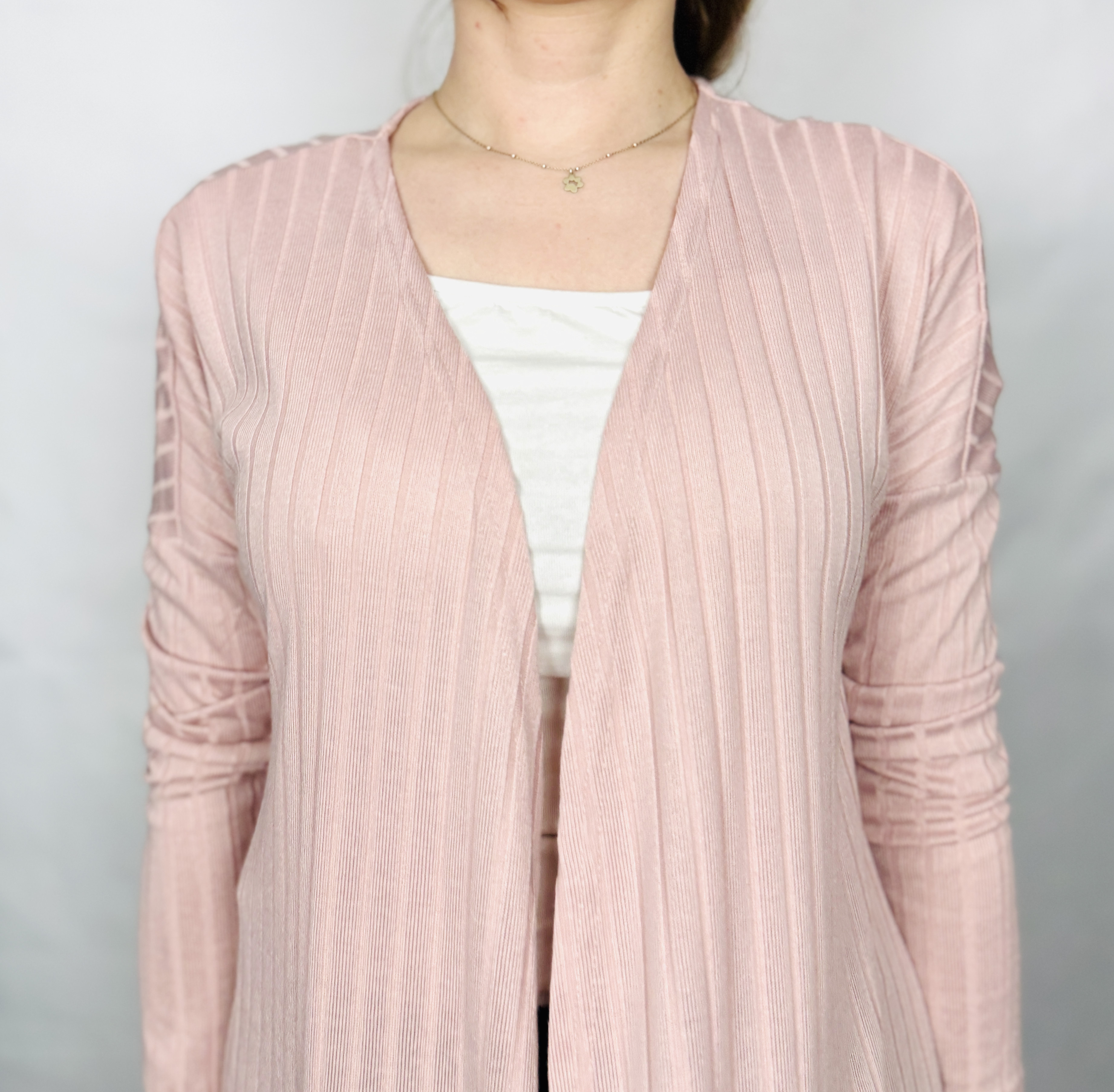 To subtelna i kobieca narzutka, która łączy prostotę z delikatnym, romantycznym wyrazem. Jasnoróżowy odcień wnosi do garderoby świeży, kobiecy akcent, a pionowe prążkowanie nadaje całości uporządkowaną, wysmuklającą linię. Model emanuje spokojem i elegancją, sprawiając wrażenie miękkiego ukołysania — to ubranie, które otula i jednocześnie dodaje szyku, idealne gdy chcesz poczuć się zadbana, a zarazem wygodna.