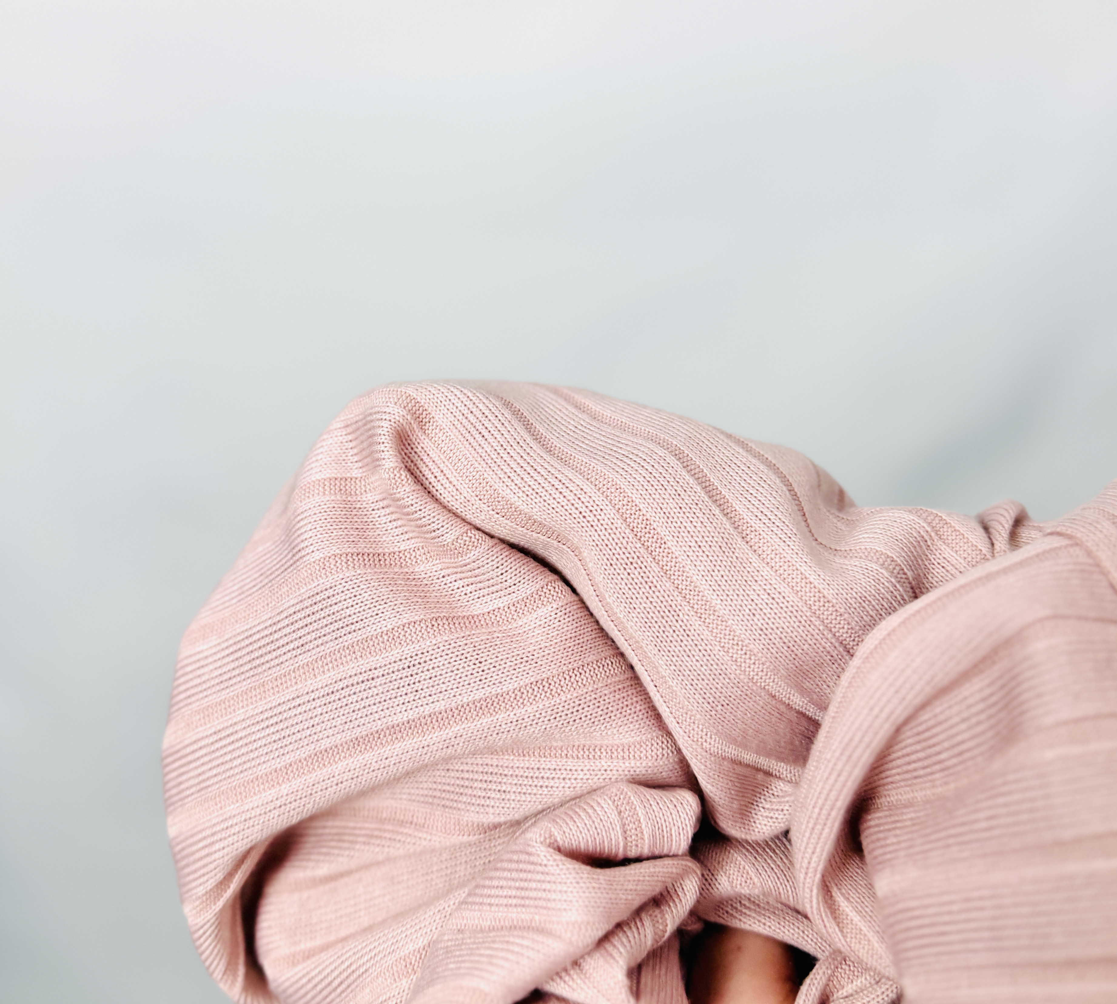 Prążkowana faktura materiału jest ważnym elementem wizualnym: pionowe żebra optycznie wydłużają sylwetkę i dodają lekkiej struktury bez nadmiernego opinania. Materiał prezentuje się jako miękko układający się i jednocześnie nieco strukturalny, co sprawia, że narzutka zachowuje ładny kształt podczas noszenia. Taka powierzchnia podkreśla naturalne kontury ciała, a jednocześnie subtelnie je modeluje, tworząc efekt harmonii i delikatnego wysmuklenia.