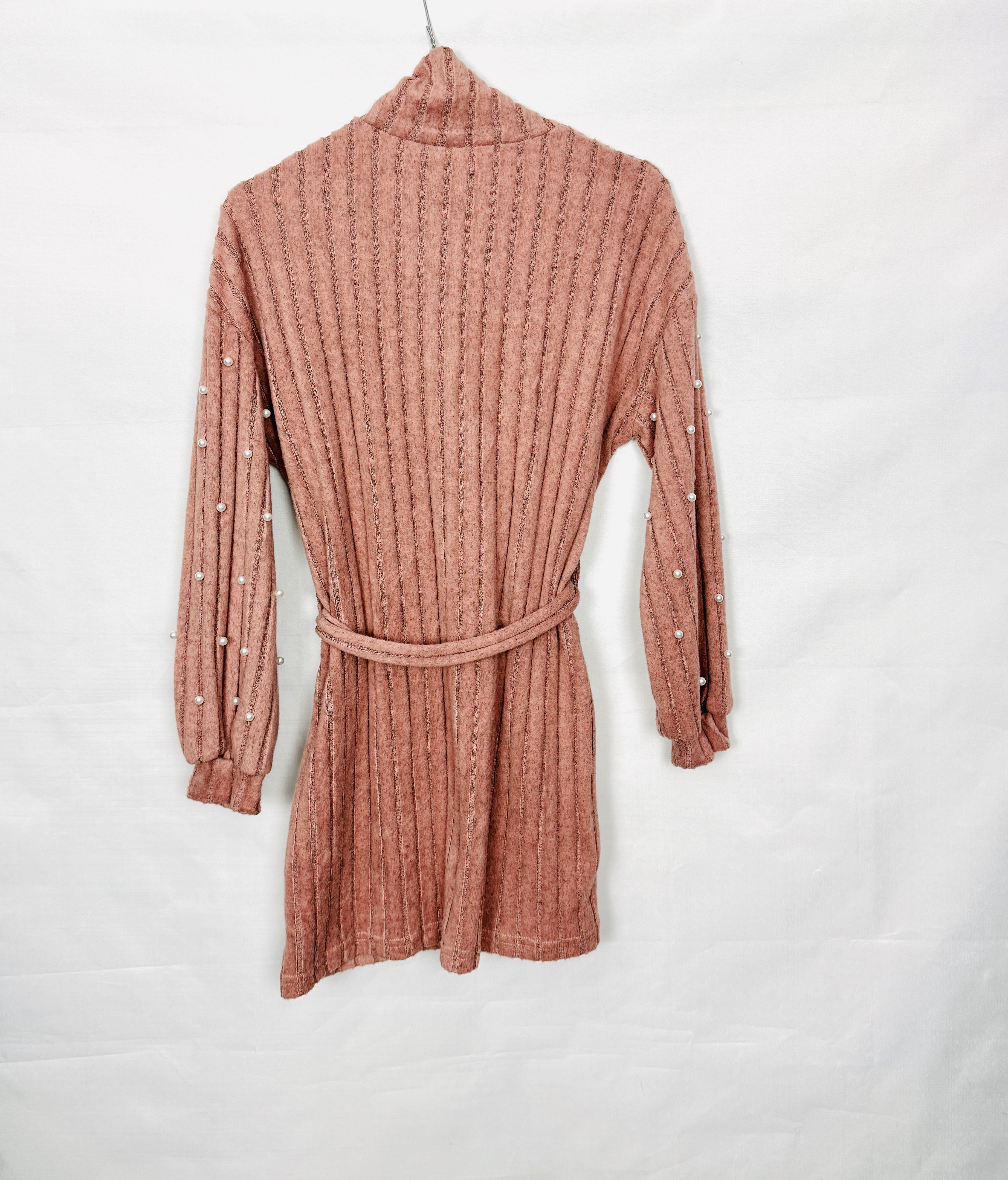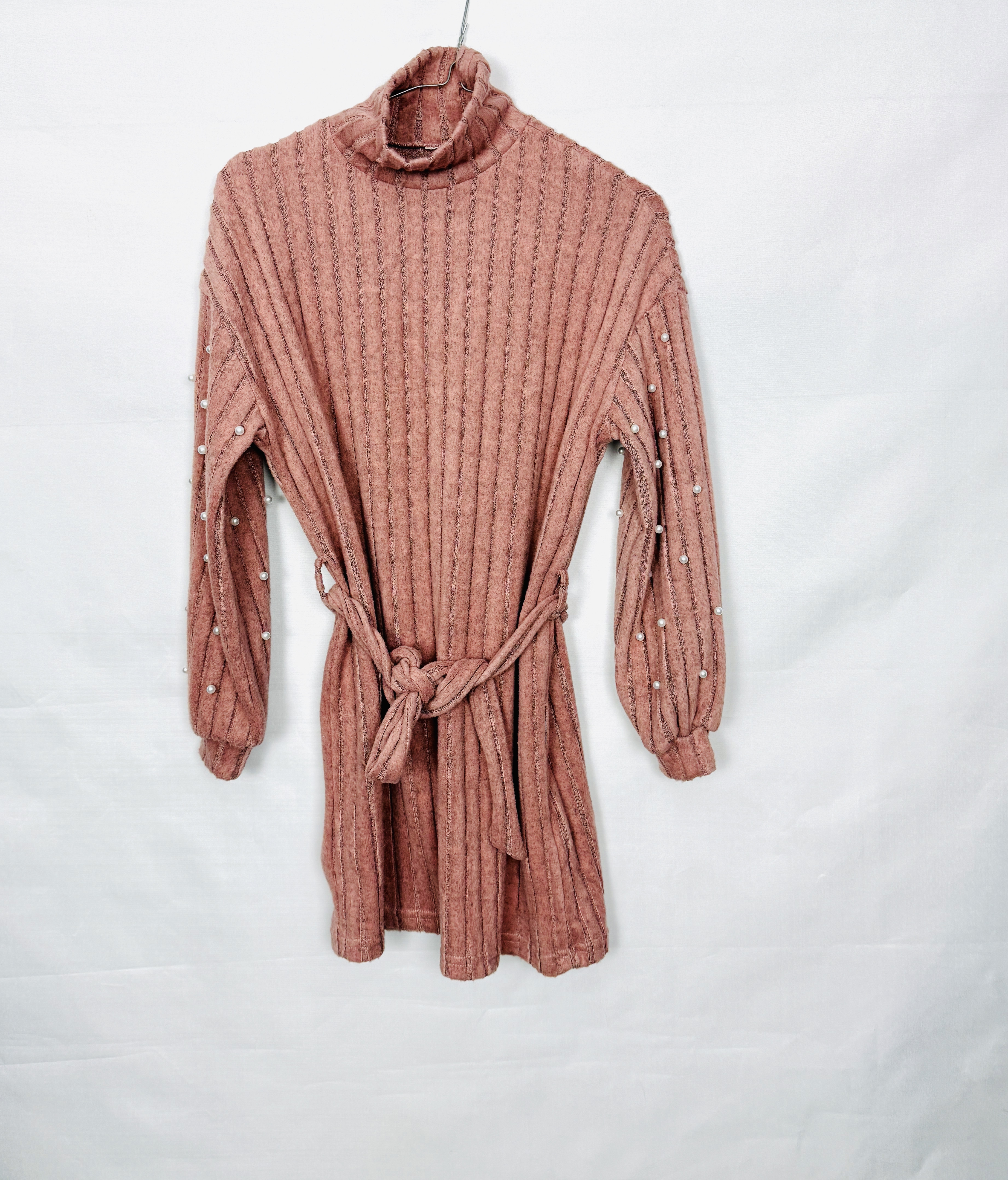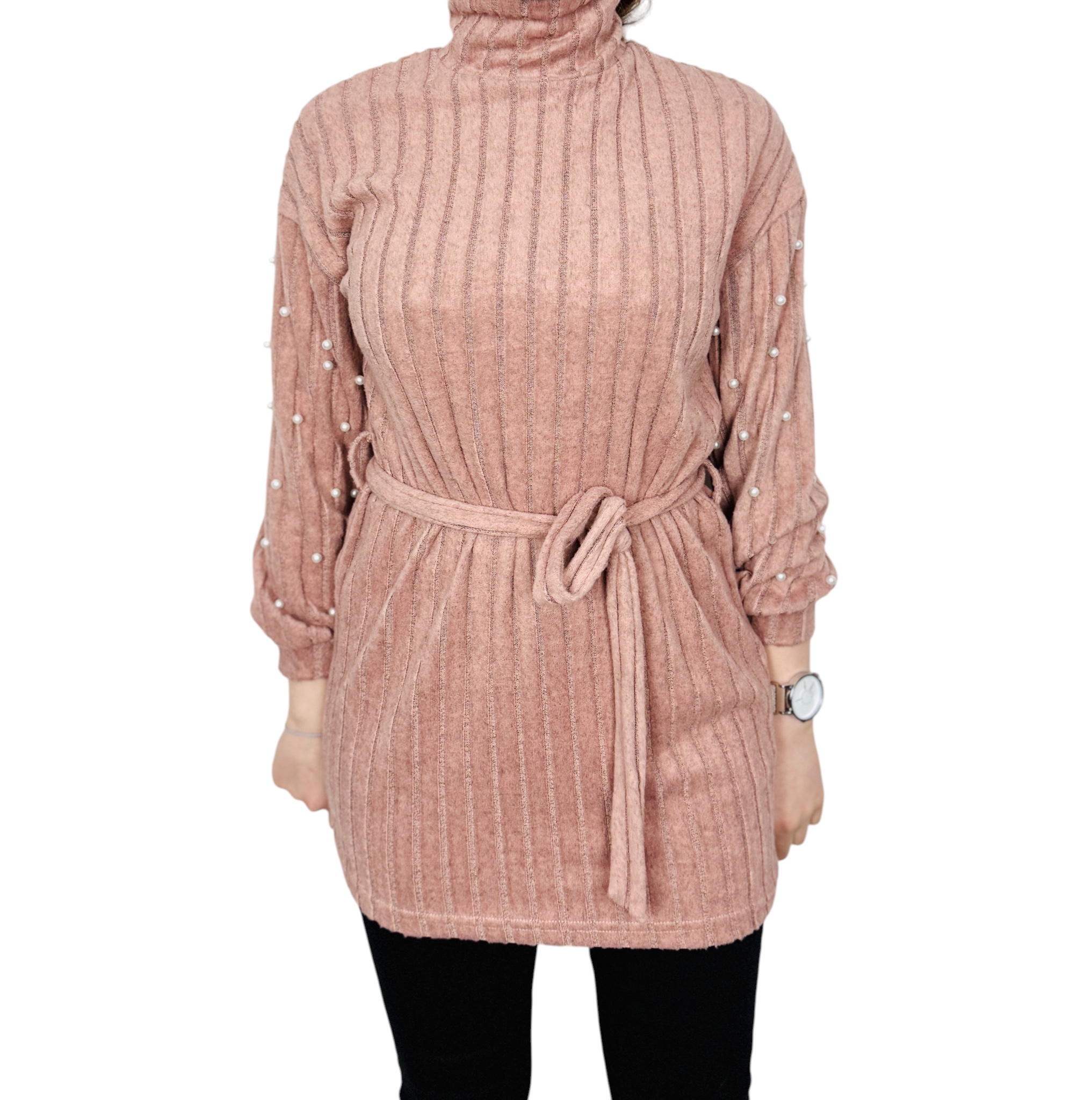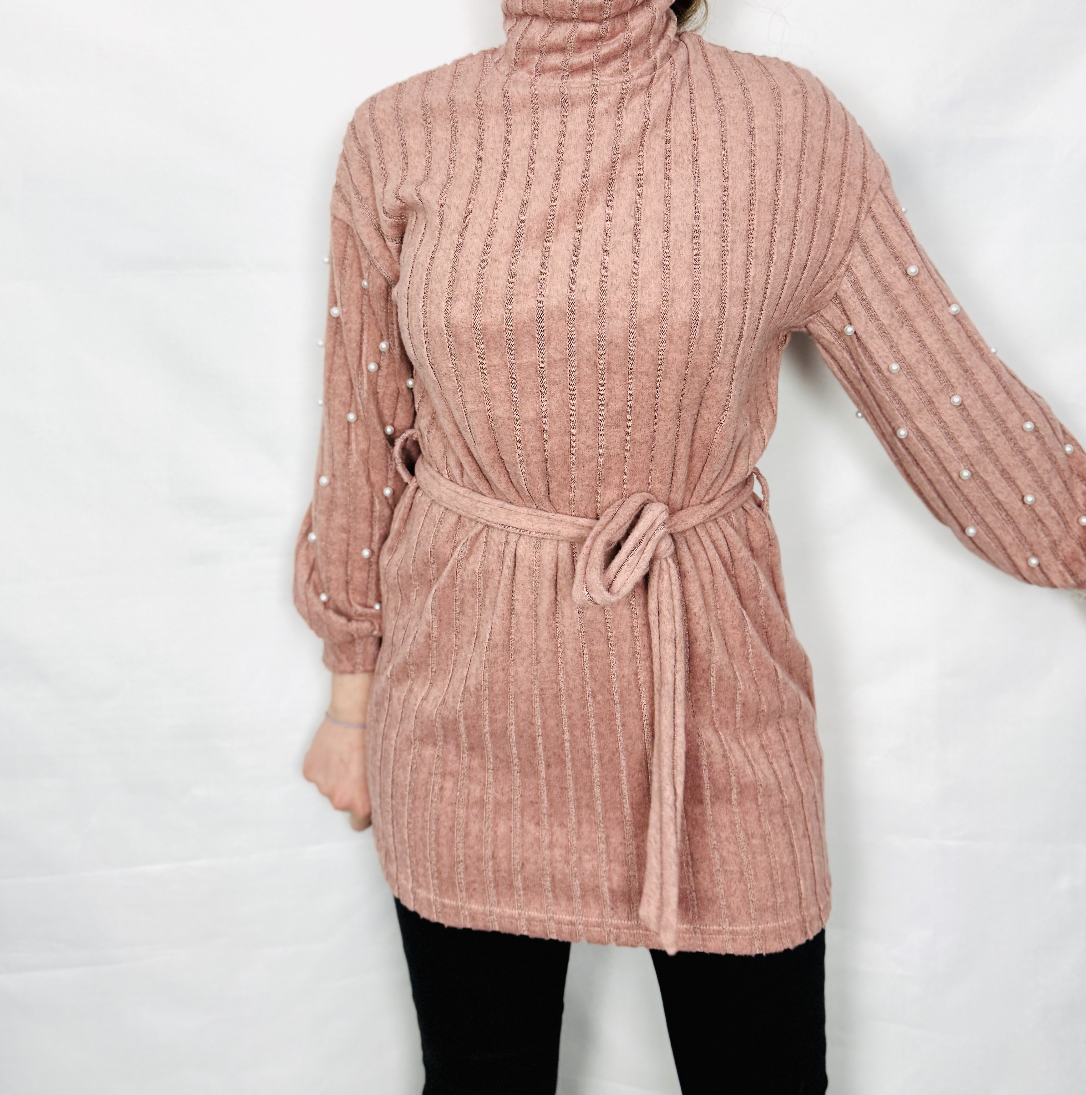 Różowa prążkowana tunika z golfem i perełkami XS 34
