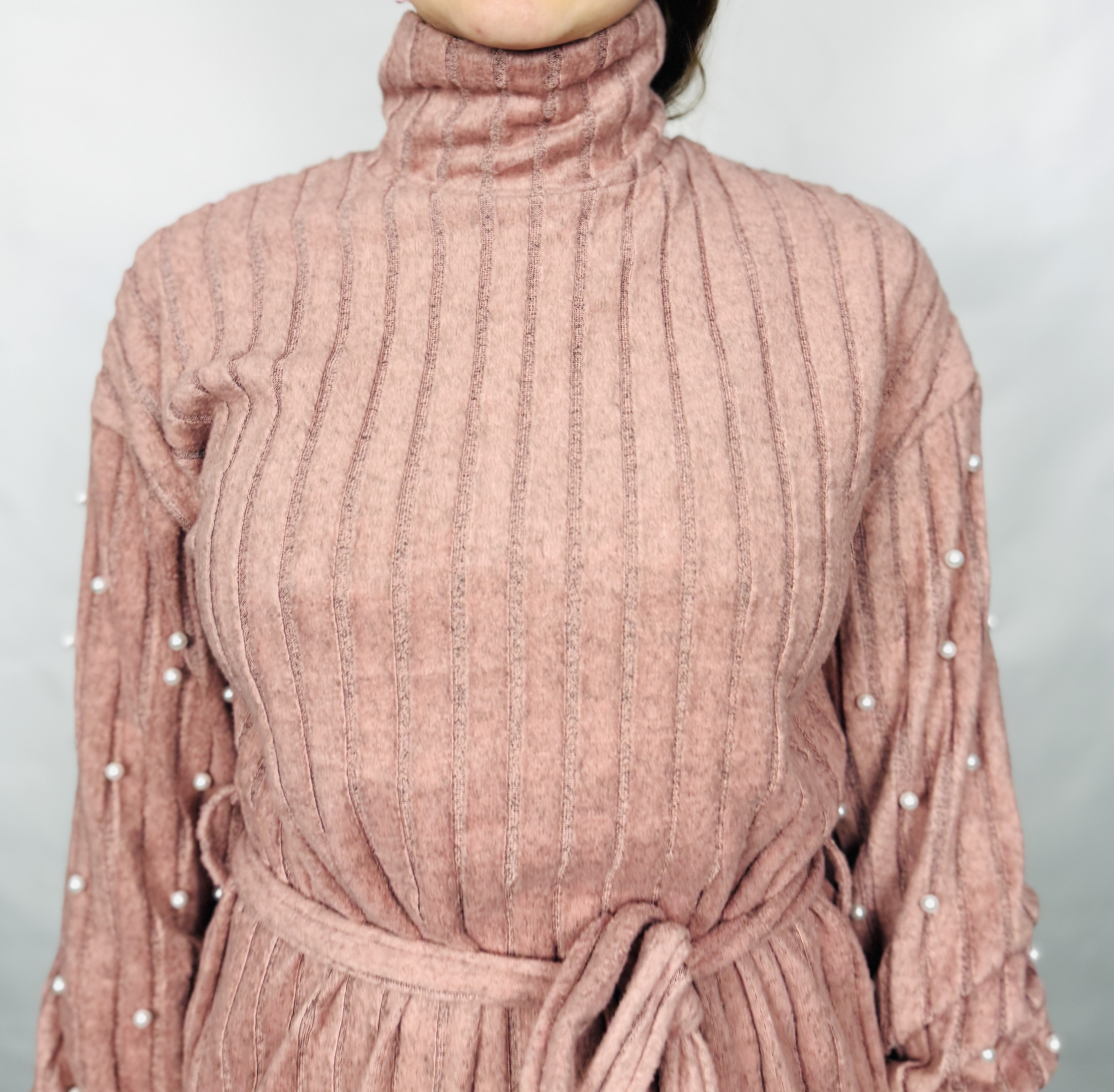 Materiał prezentuje się jako prążkowany i miękko układający się, nieco grubszy i otulający, co daje poczucie ciepła i komfortu. Prążki tworzą pionowy efekt wysmuklający, a delikatna faktura podkreśla naturalne kontury ciała bez nadmiernego opinania. Na rękawach rozmieszczone są dyskretne, perłowe ozdobniki ułożone w regularne rzędy — to subtelny, kobiecy detal, który dodaje stylowi szykownej finezji i delikatnego blasku przy ruchu.
