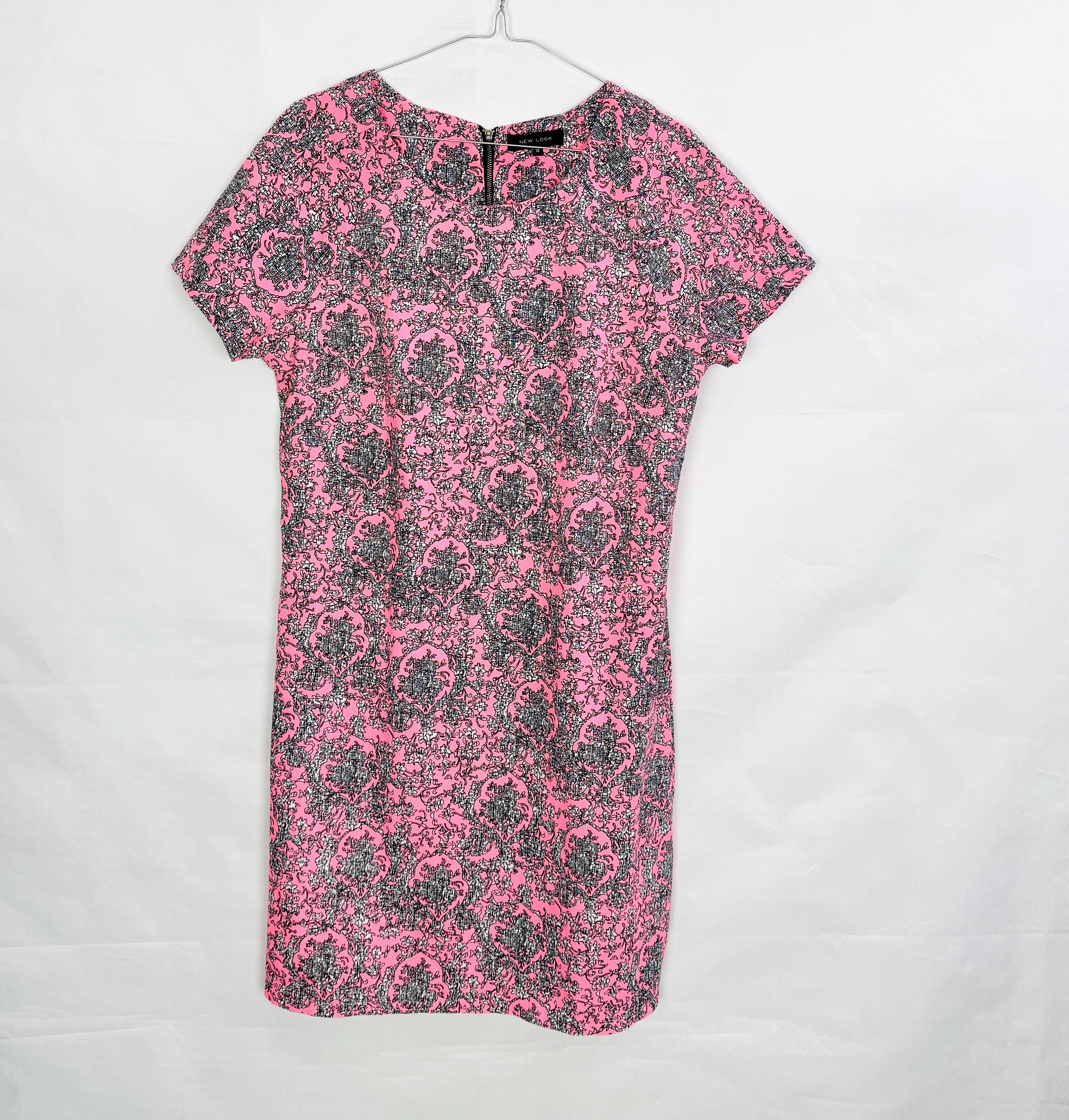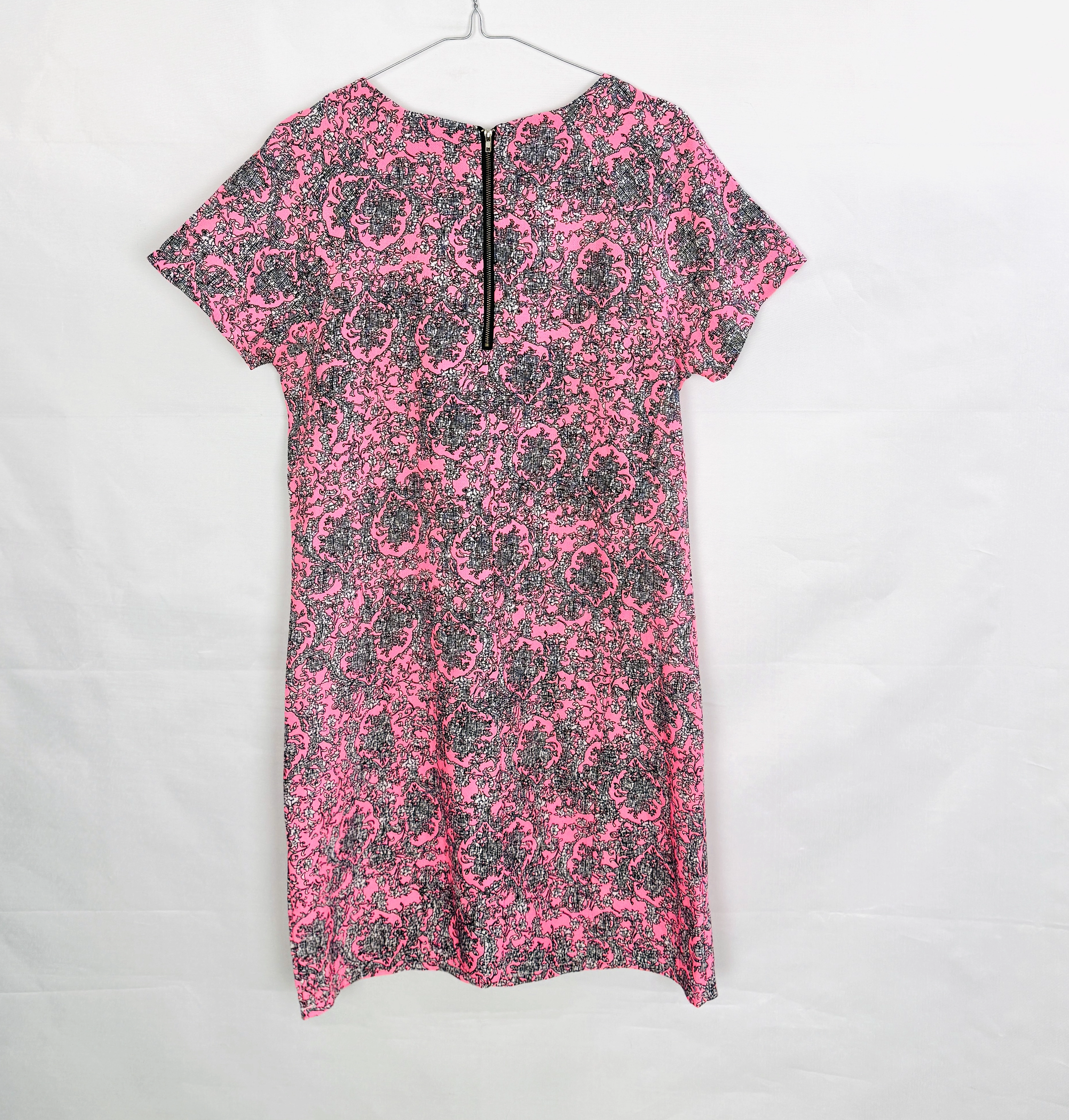 Wzór to bogaty ornament o delikatnych, roślinnym nutach, regularnie rozmieszczony na różowym tle. Ta grafika dodaje sukience eleganckiego charakteru i wizualnego bogactwa, dzięki czemu nawet przy prostej formie projekt nie staje się monotonny. Materiał wydaje się być gładki i lekko lejący, miękko układający się na ciele, co zapewnia komfort i przyjemne odczucie podczas noszenia. Linia sukienki ma uporządkowaną strukturę, która daje wrażenie schludnej formy, a jednocześnie zachowuje naturalną swobodę ruchu.