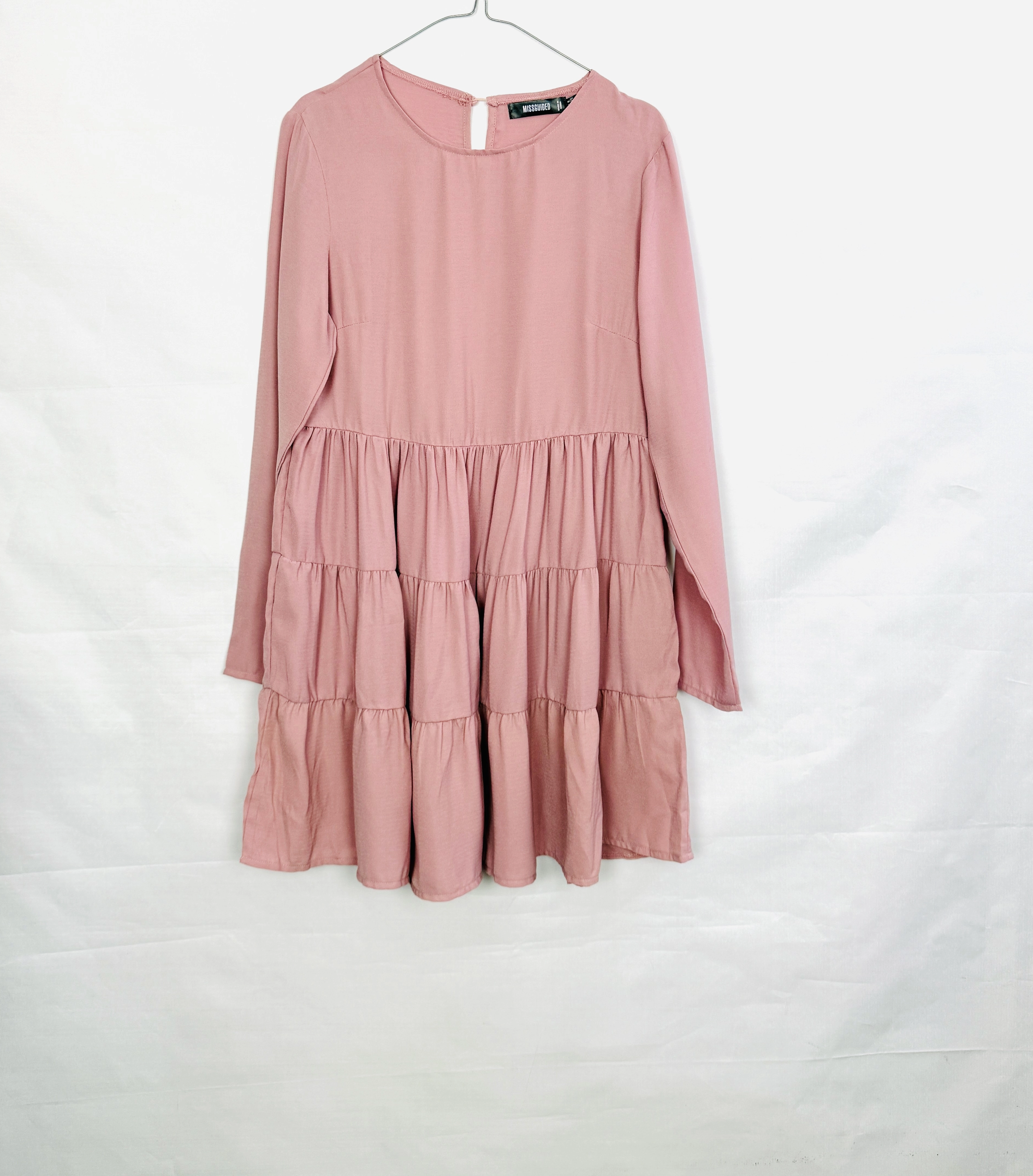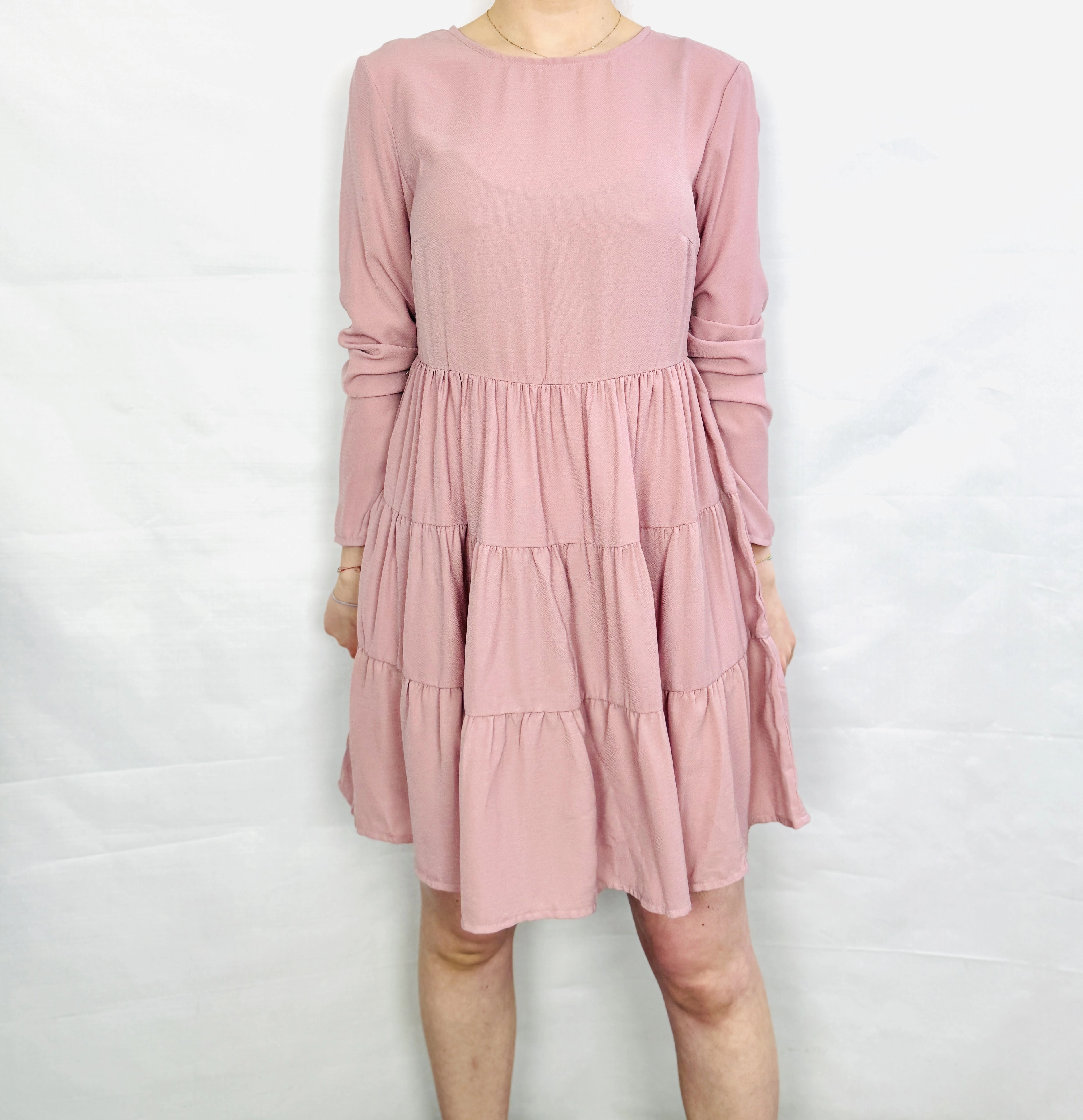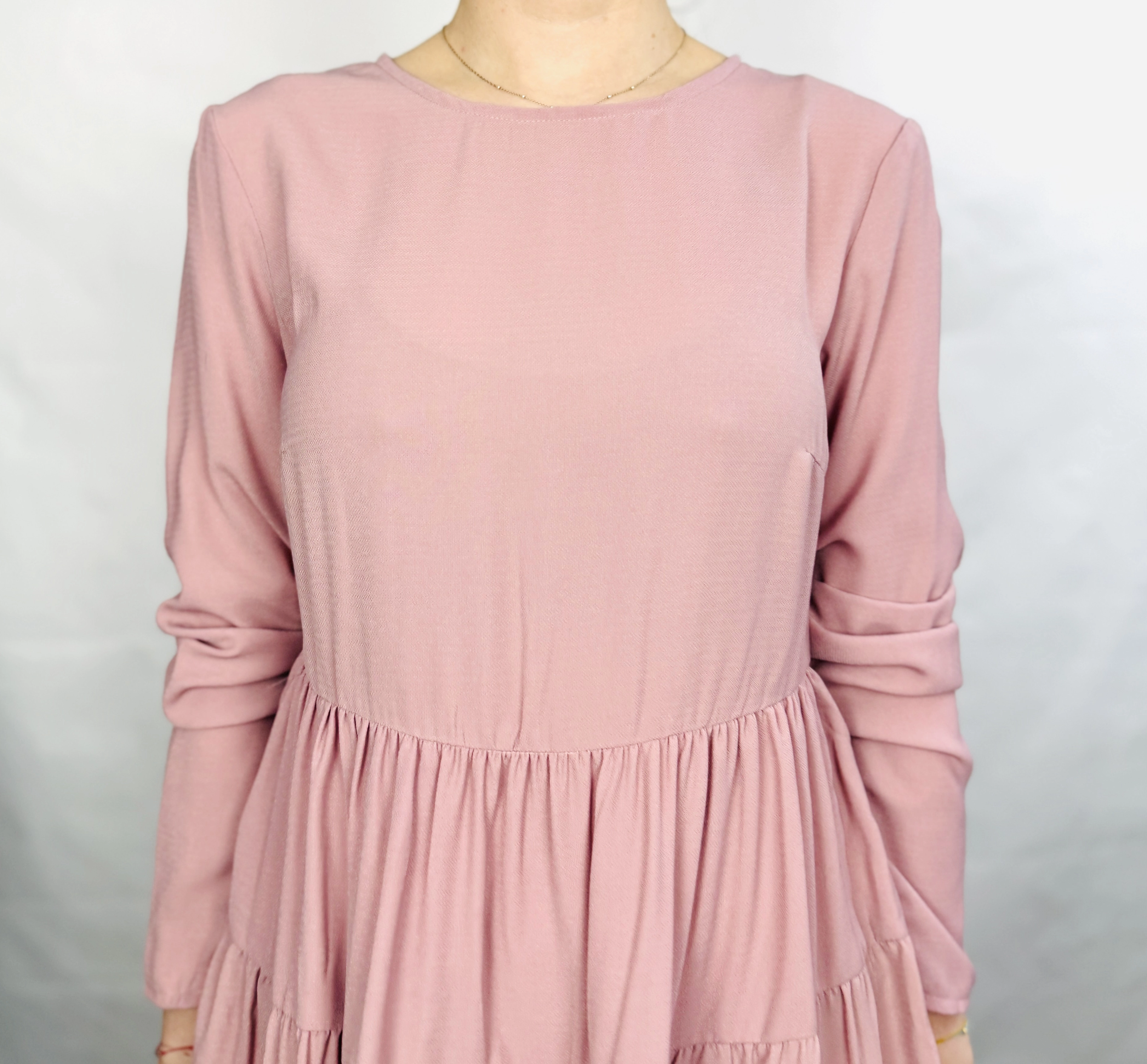 Długie, proste rękawy harmonizują z bogatym dołem sukienki, zachowując odpowiednią równowagę całego projektu. Materiał sprawia wrażenie gładkiego, miękkiego i delikatnie lejącego, dzięki czemu falbany nie odstają sztywno, lecz subtelnie opadają, tworząc naturalne plisy. Tkanina ma matowe wykończenie i wygląda na bardzo przyjemną dla skóry, co potęguje wrażenie wygody. Długość przed kolano pozwala wyeksponować nogi, co w połączeniu z luźną górą sprawia, że sylwetka wygląda na smuklejszą i bardziej proporcjonalną.