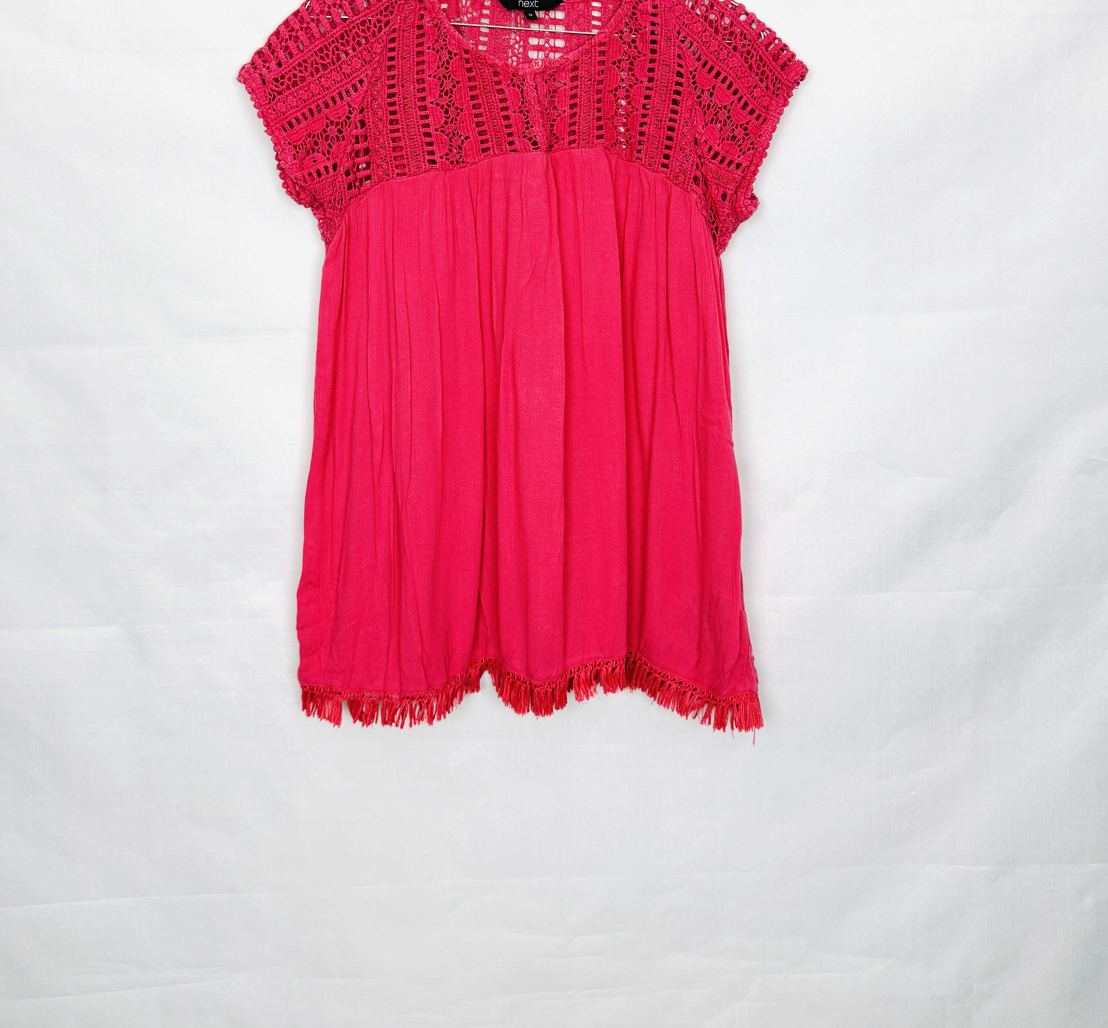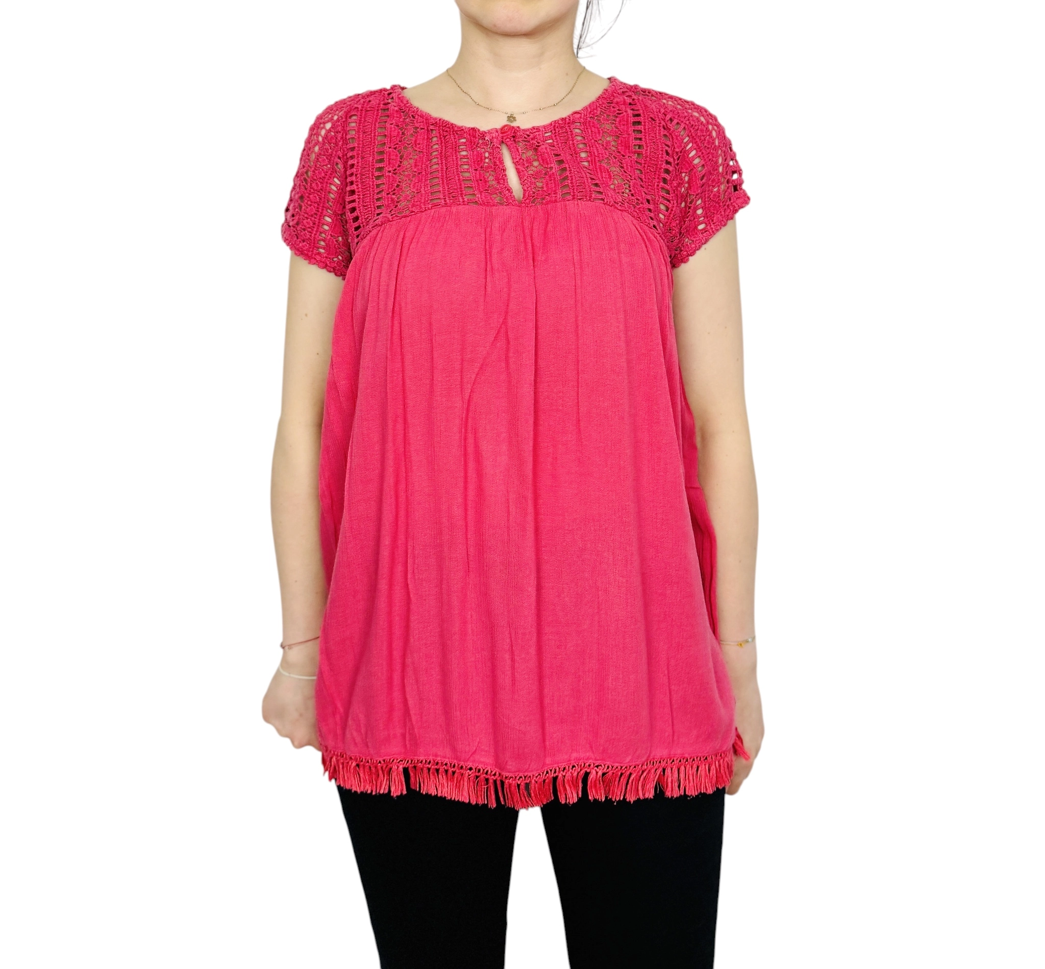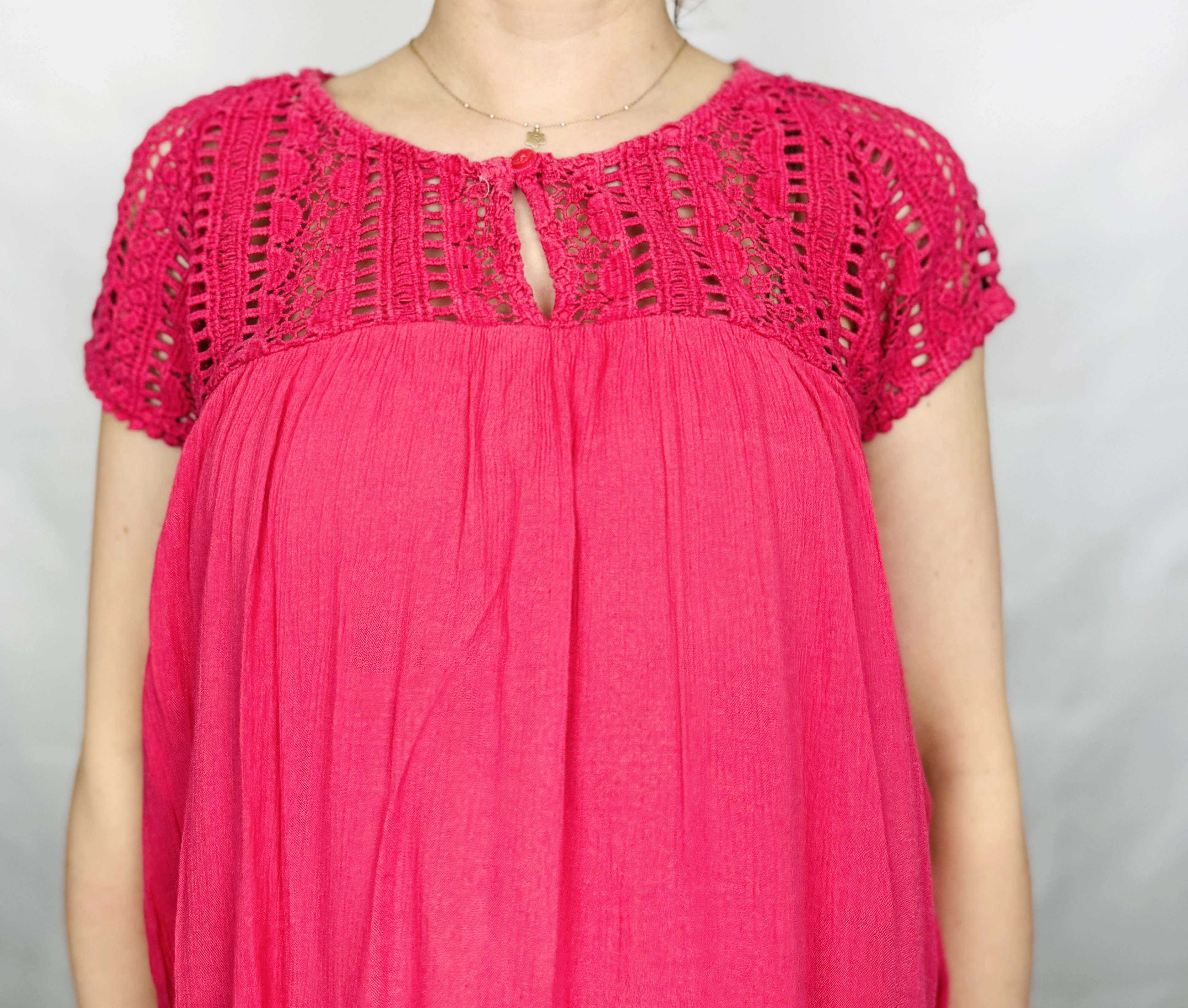Ta tunika przyciąga uwagę swoją energetyczną barwą i romantycznym wykończeniem, które nadaje jej wyjątkowego, letniego charakteru. Intensywny odcień różu ożywia stylizację i wprowadza do niej świeżość oraz kobiecą lekkość. Górna część z ażurową koronką tworzy piękny kontrast z gładkim, miękko układającym się materiałem, dzięki czemu całość wygląda niezwykle efektownie i oryginalnie. To model, który łączy w sobie swobodę z dekoracyjnością, idealny dla kobiet lubiących wyraziste, ale wciąż subtelnie romantyczne elementy garderoby.