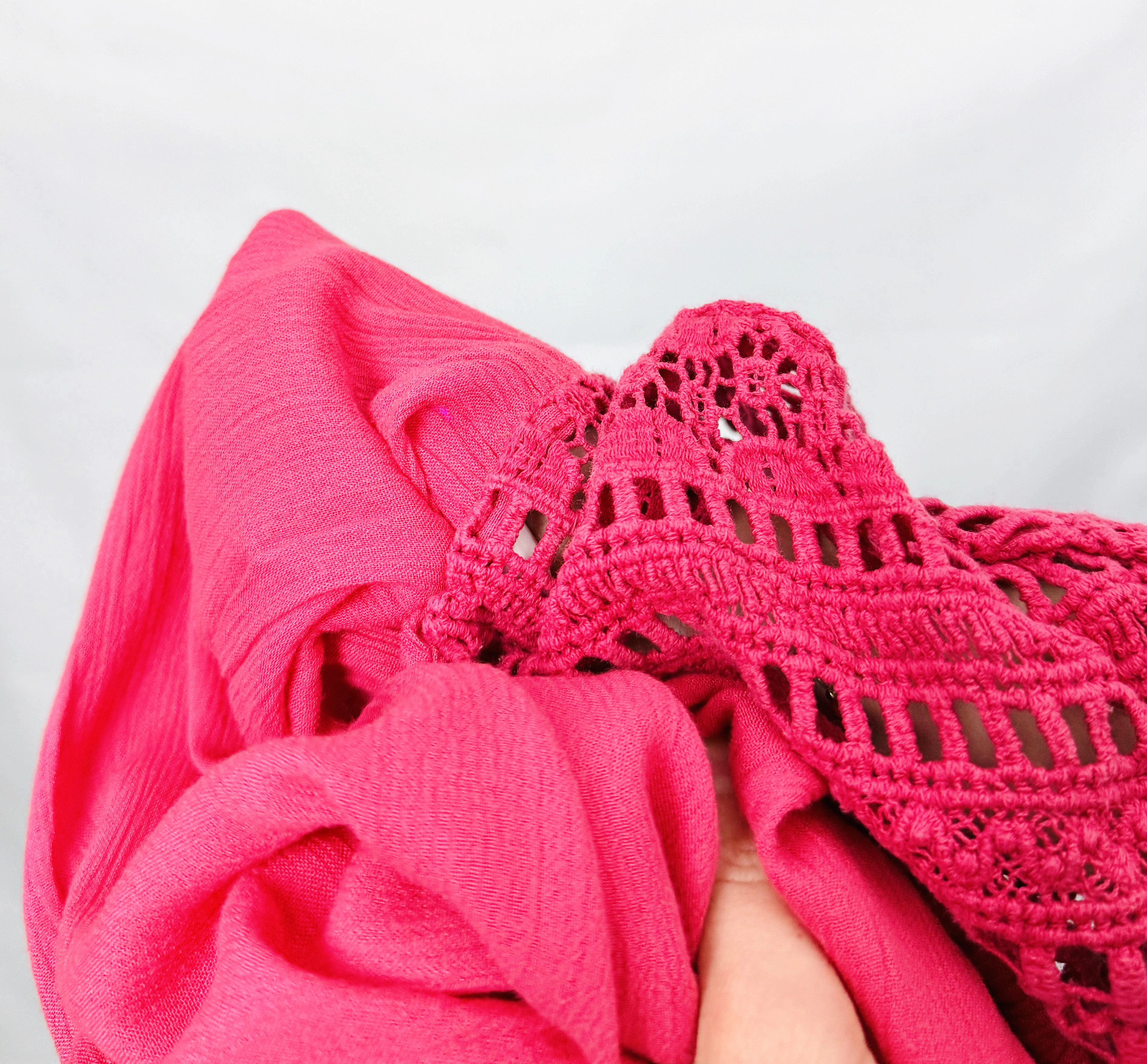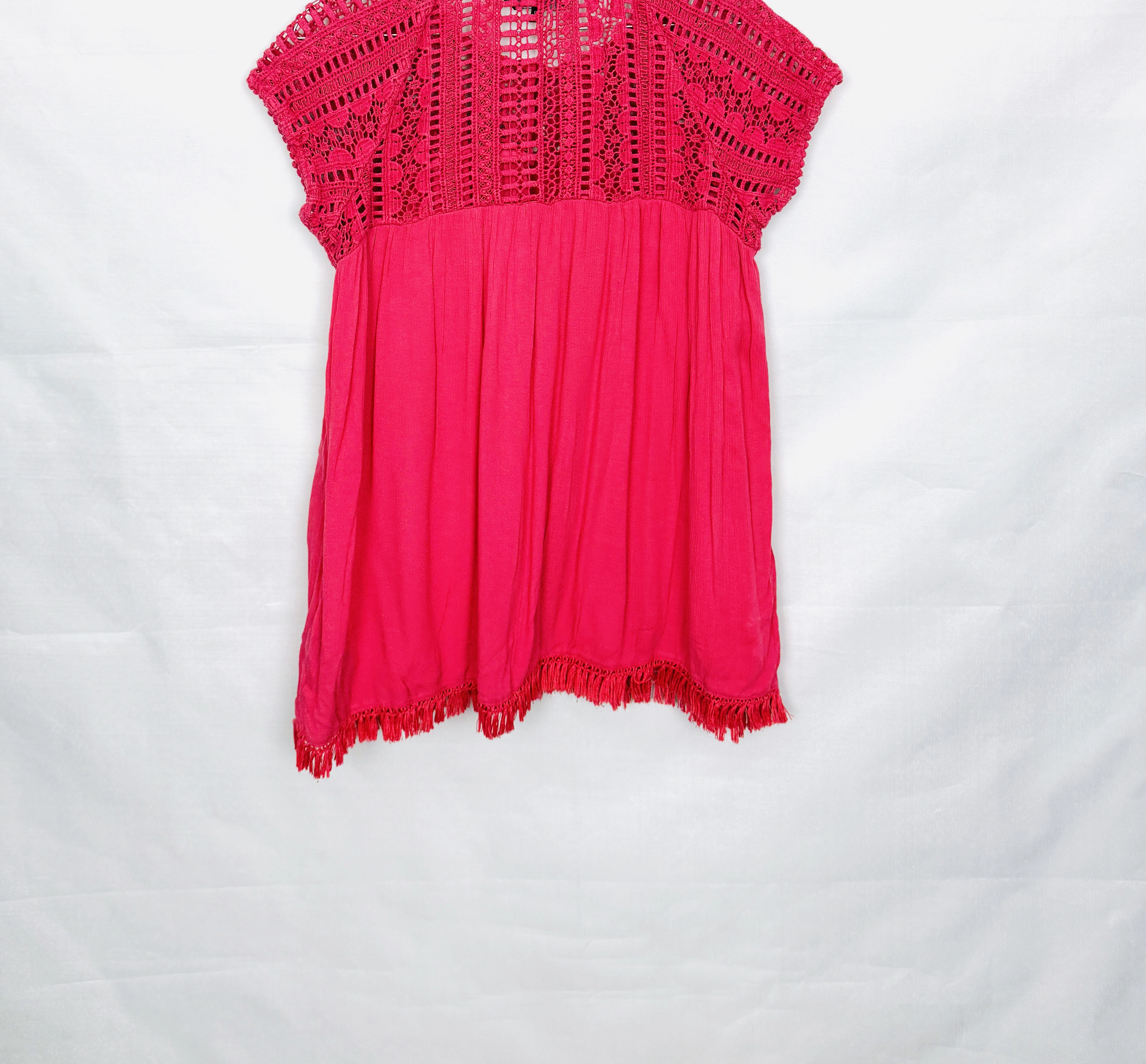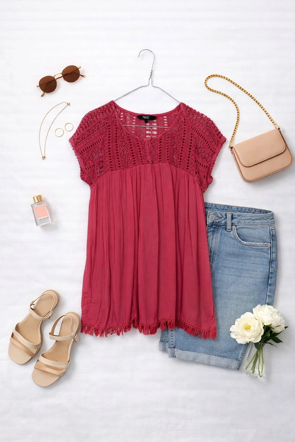 Ta tunika przyciąga uwagę swoją energetyczną barwą i romantycznym wykończeniem, które nadaje jej wyjątkowego, letniego charakteru. Intensywny odcień różu ożywia stylizację i wprowadza do niej świeżość oraz kobiecą lekkość. Górna część z ażurową koronką tworzy piękny kontrast z gładkim, miękko układającym się materiałem, dzięki czemu całość wygląda niezwykle efektownie i oryginalnie. To model, który łączy w sobie swobodę z dekoracyjnością, idealny dla kobiet lubiących wyraziste, ale wciąż subtelnie romantyczne elementy garderoby.