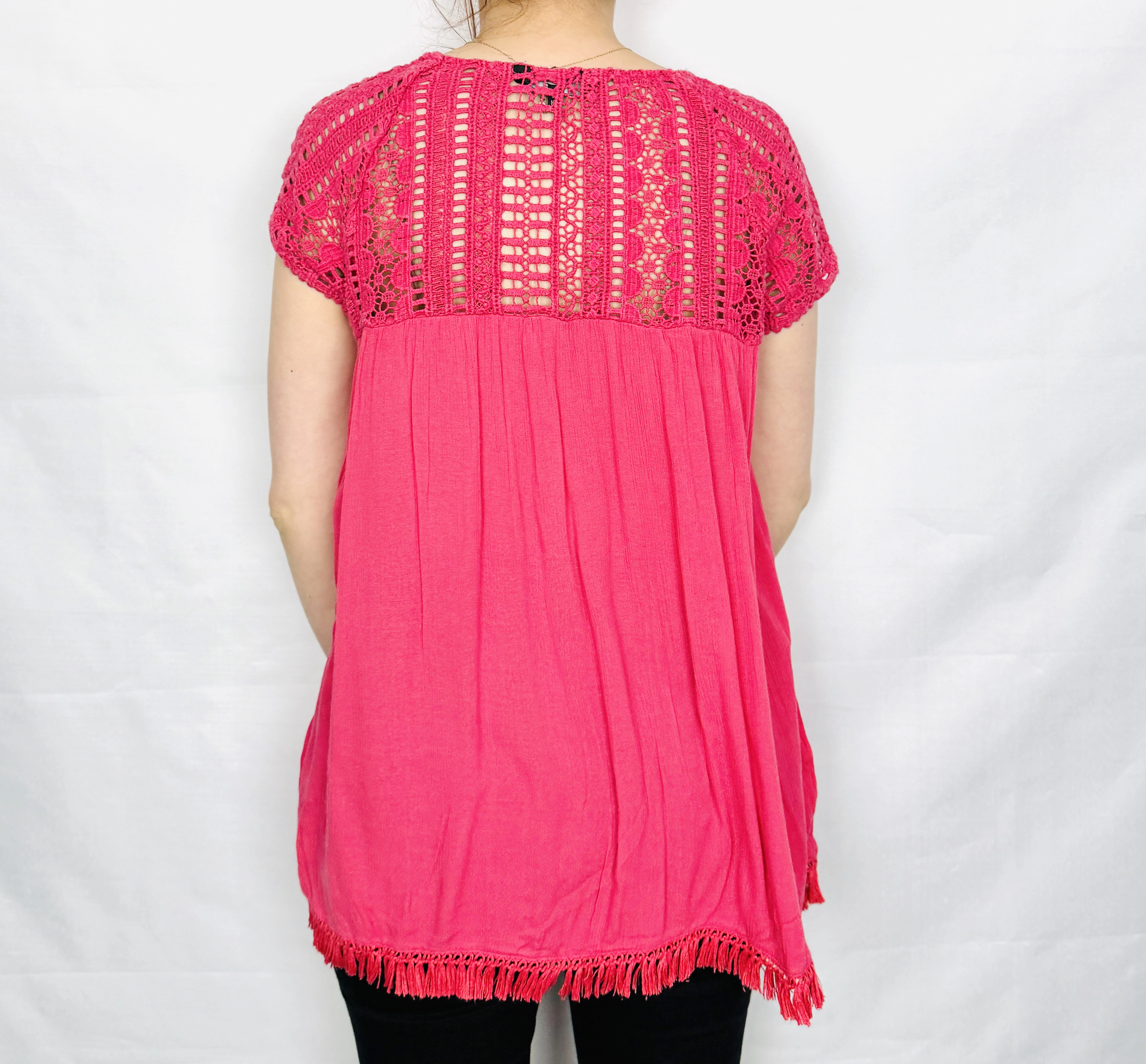 Fason tuniki jest luźny i lekko rozkloszowany, co zapewnia wygodę oraz swobodę ruchów. Góra została wykończona szeroką, ażurową wstawką obejmującą ramiona i krótkie rękawy, nadając sylwetce lekkości i delikatności. Pod szyją znajduje się niewielkie wycięcie w kształcie łezki, które subtelnie podkreśla dekolt i dodaje całości uroku. Dolna część tuniki miękko opada, tworząc naturalne, pionowe fałdy, które pięknie pracują przy ruchu. Całość została zakończona ozdobnymi frędzlami, które wprowadzają element boho i nadają stylizacji swobodnego, wakacyjnego charakteru. Materiał jest lekki, miękki i przyjemny w dotyku, co dodatkowo podkreśla komfort noszenia.