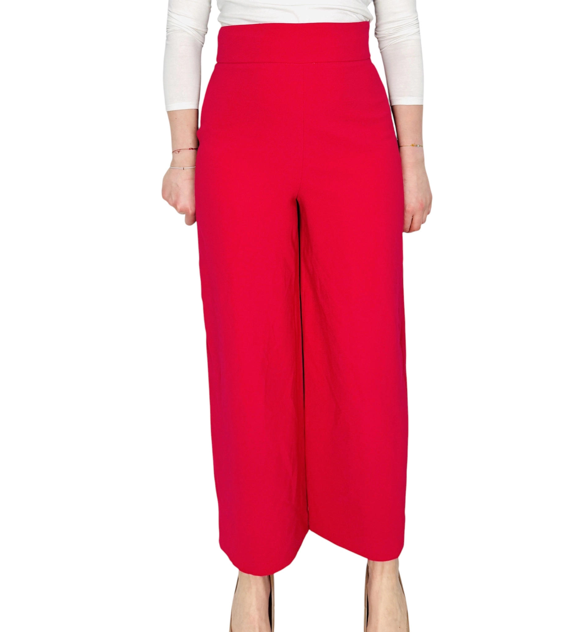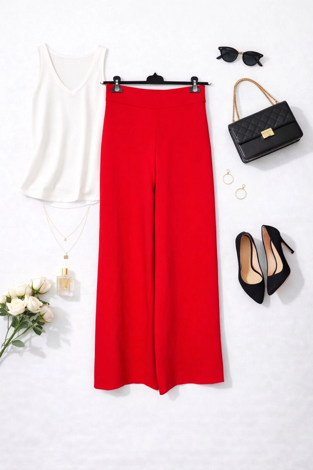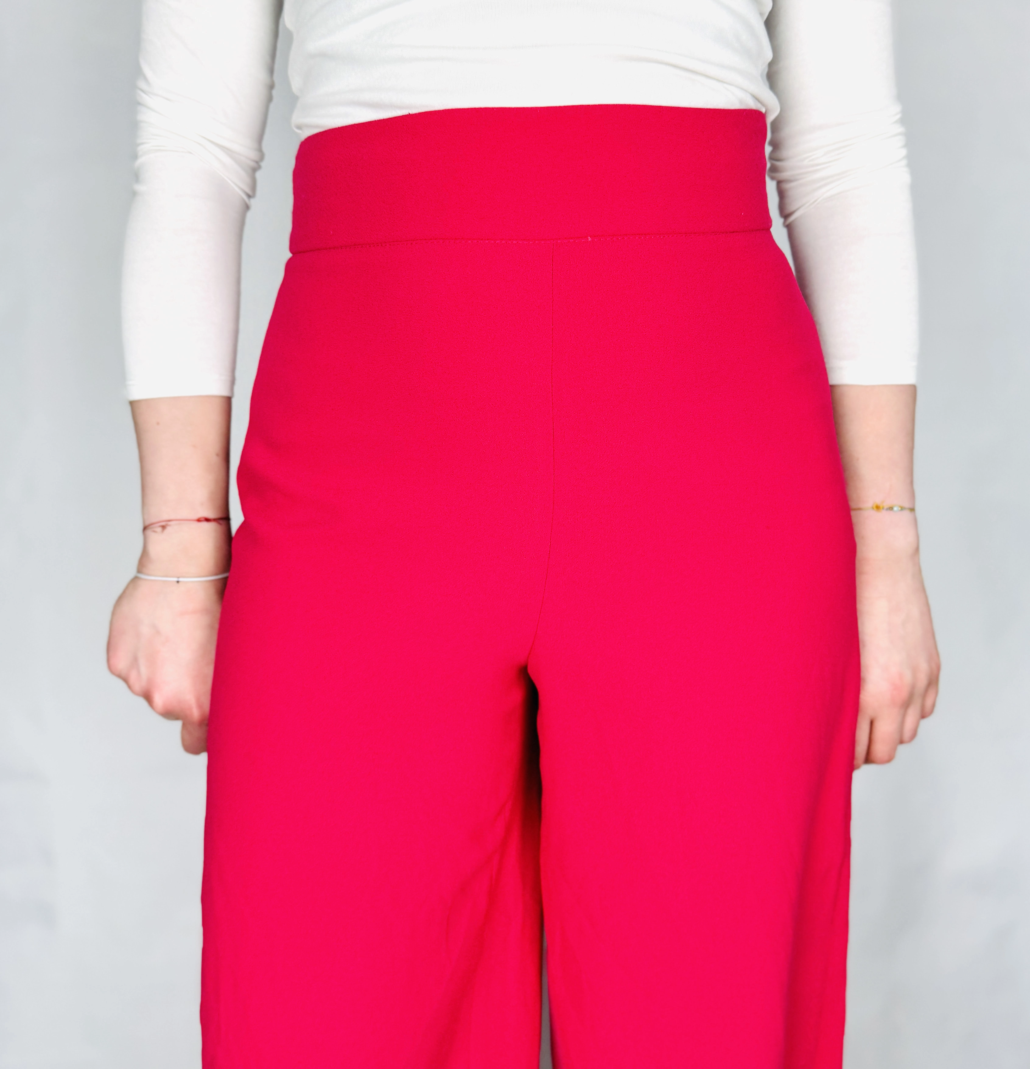 Fason z wysokim stanem pięknie podkreśla talię i modeluje sylwetkę, nadając jej proporcji. Górna część jest gładka i dobrze dopasowana, dzięki czemu spodnie układają się estetycznie w okolicach bioder. Nogawki są szerokie i luźne, opadają swobodnie wzdłuż nóg, tworząc efekt lekkości i eleganckiego ruchu. Taki krój optycznie wydłuża sylwetkę i dodaje jej smukłości, jednocześnie zapewniając pełen komfort noszenia.