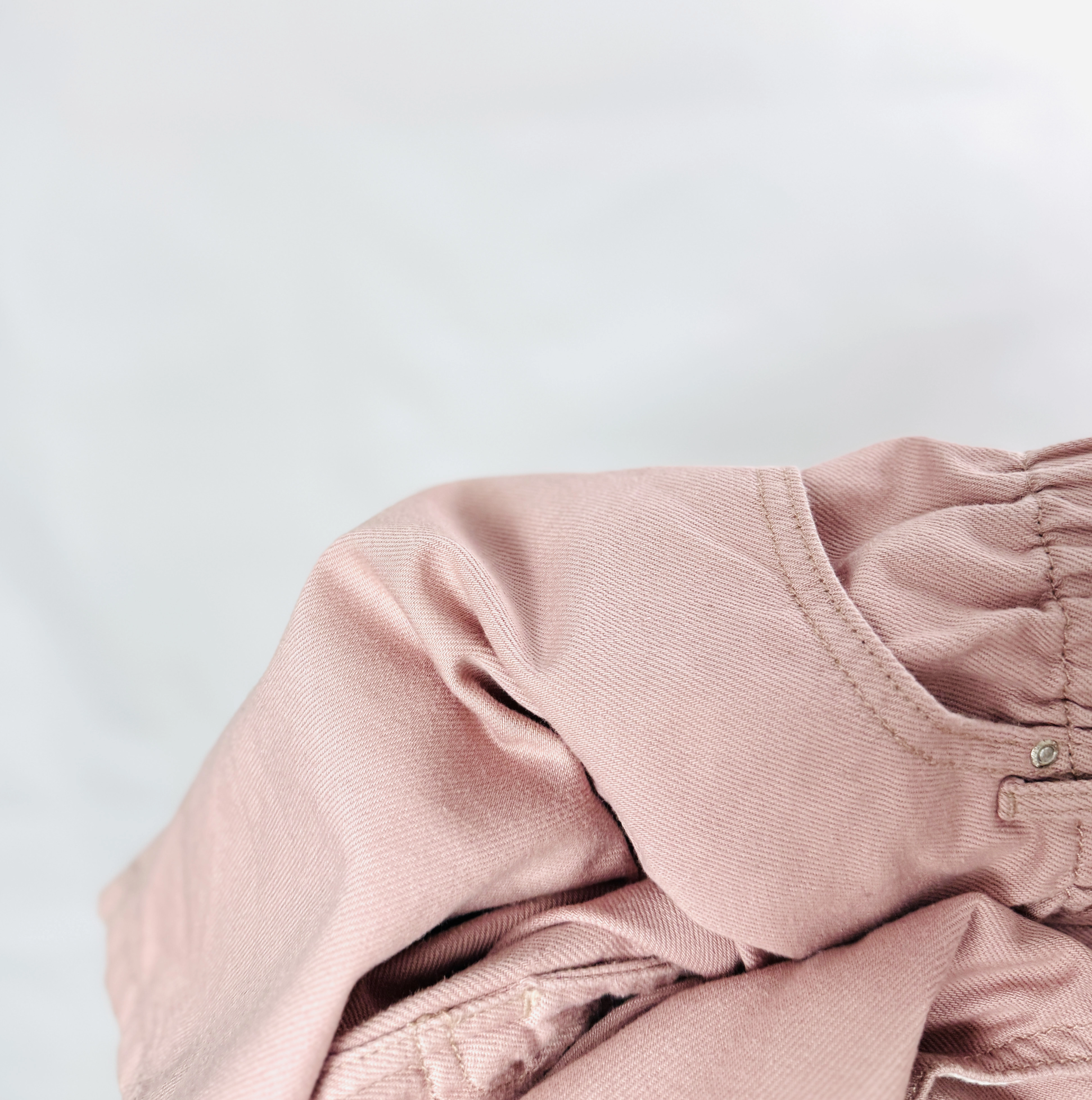Materiał, z którego wykonano szorty, jest nieco grubszy i otulający, o gładkiej, matowej strukturze, która gwarantuje trwałość i estetyczny wygląd przez cały dzień. Tkanina jest miękka i przyjemna w dotyku, co potęguje wrażenie naturalności i wysokiej jakości wykonania. Dzięki swojej gęstości spodenki doskonale trzymają formę, a jednocześnie są na tyle elastyczne, by dopasowywać się do ruchów ciała. Subtelny róż materiału jest jednolity i nasycony, co sprawia, że całość prezentuje się bardzo nowocześnie i z klasą, stanowiąc doskonały fundament dla wielu różnorodnych zestawień kolorystycznych.
