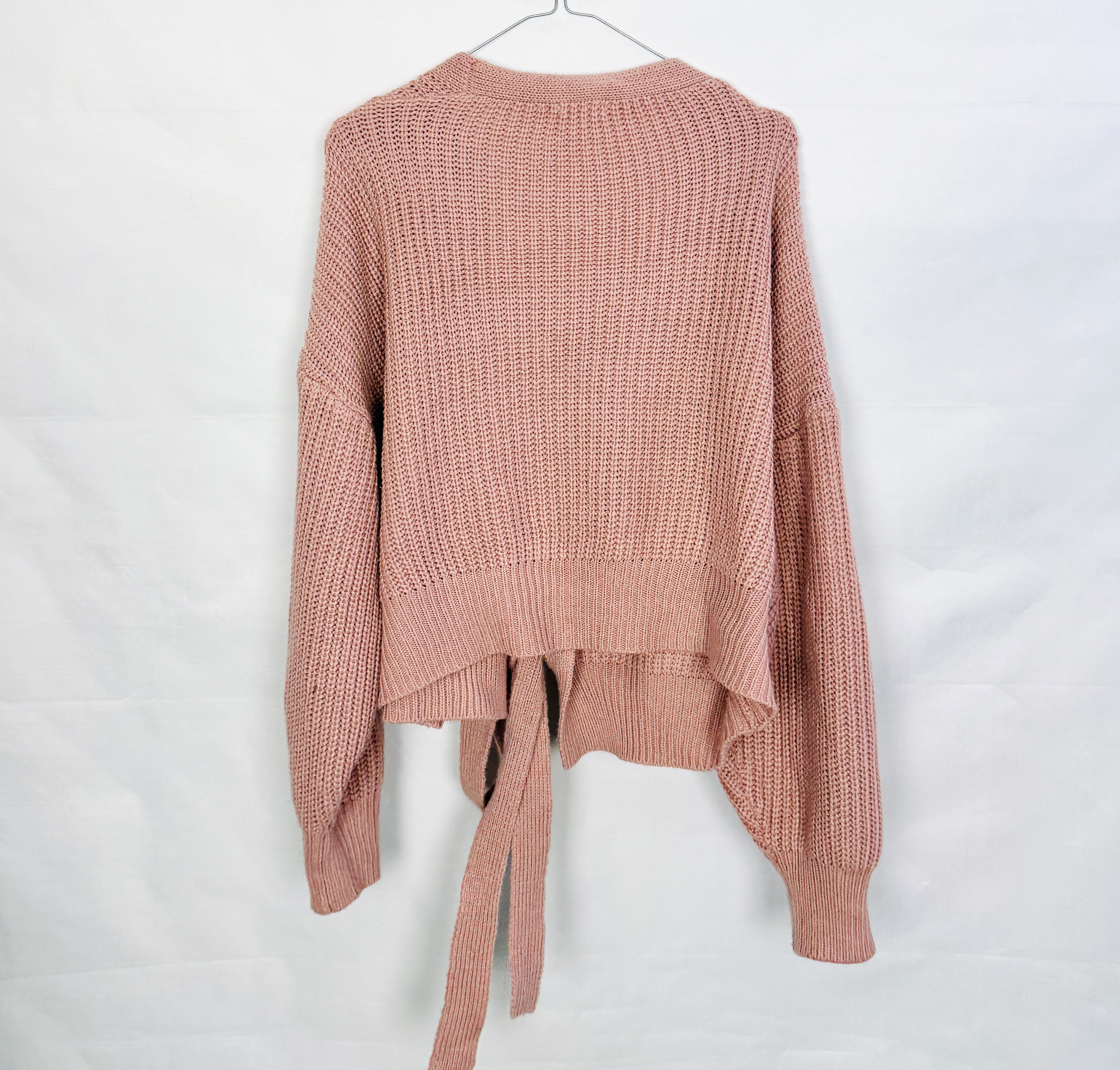Dekolt tworzy głębokie, kopertowe V, które delikatnie eksponuje linię szyi i dekoltu; miejsce przecięcia zapięte jest wiązaniem po boku, co pozwala podkreślić talię i nadać sylwetce subtelniejszą definicję. Ramiona mają lekko opuszczone cięcie, a rękawy prezentują się jako obszerne, lekko bufiaste w górnej części, zwężające się ku mankietom — takie wykończenie daje efekt miękkiego marszczenia i dodaje sylwetce kobiecej dynamiki. Dół kończy się szerokim ściągaczem, który stabilizuje proporcje i pozwala sweterowi pięknie układać się wokół bioder.