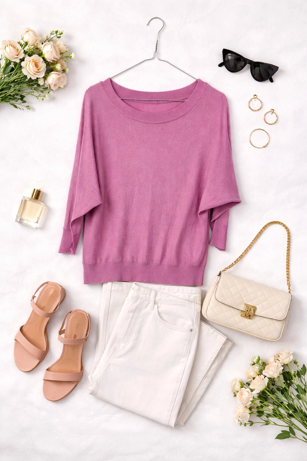 Rękawy są luźne, o lekkim charakterze motylkowym, zwężane w miejscu mankietu — to rozwiązanie dodaje całości nonszalanckiej lekkości i przyjemnej dynamiki ruchu. Długość sięga do wysokości bioder, co umożliwia noszenie sweterka zarówno do spodni z wysokim stanem, jak i do spódnic, zachowując proporcję i schludny kontur sylwetki. Materiał wygląda na miękko układający się i lekko elastyczny, z delikatnym, subtelnym połyskiem, który w ruchu daje przyjemne, dyskretne refleksy.