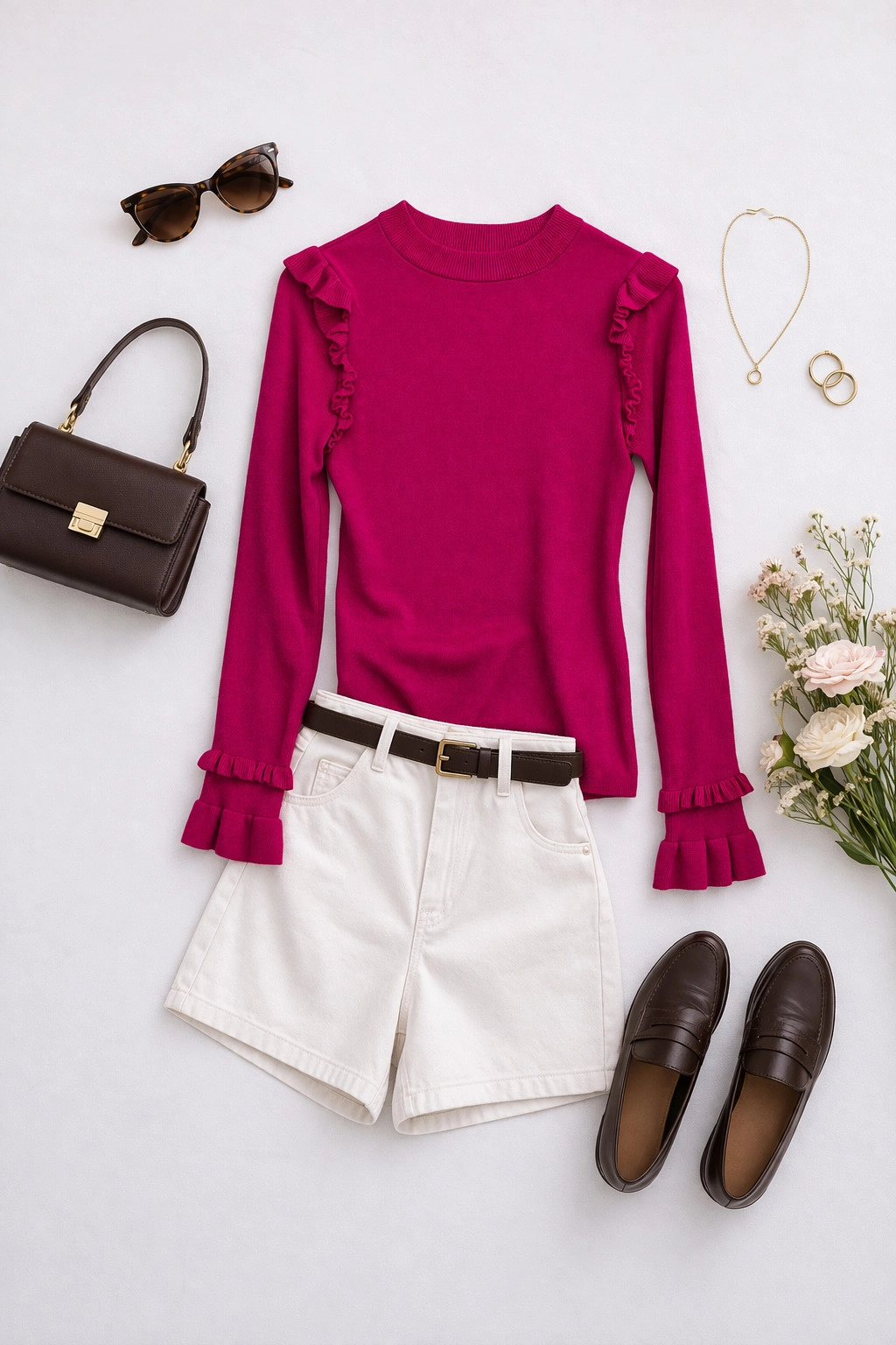 Dzięki dopasowanemu krojowi sweterek pięknie podkreśla talię, a falbanki przy ramionach pomagają zbalansować proporcje sylwetki, szczególnie u kobiet o węższych ramionach i szerszych biodrach. To fason, który może optycznie nadać sylwetce bardziej harmonijny kształt, zbliżony do klepsydry. Długość sięgająca do bioder sprawia, że model świetnie współgra zarówno z dopasowanymi spodniami, jak i spódnicami, pozwalając na tworzenie wielu różnorodnych stylizacji.