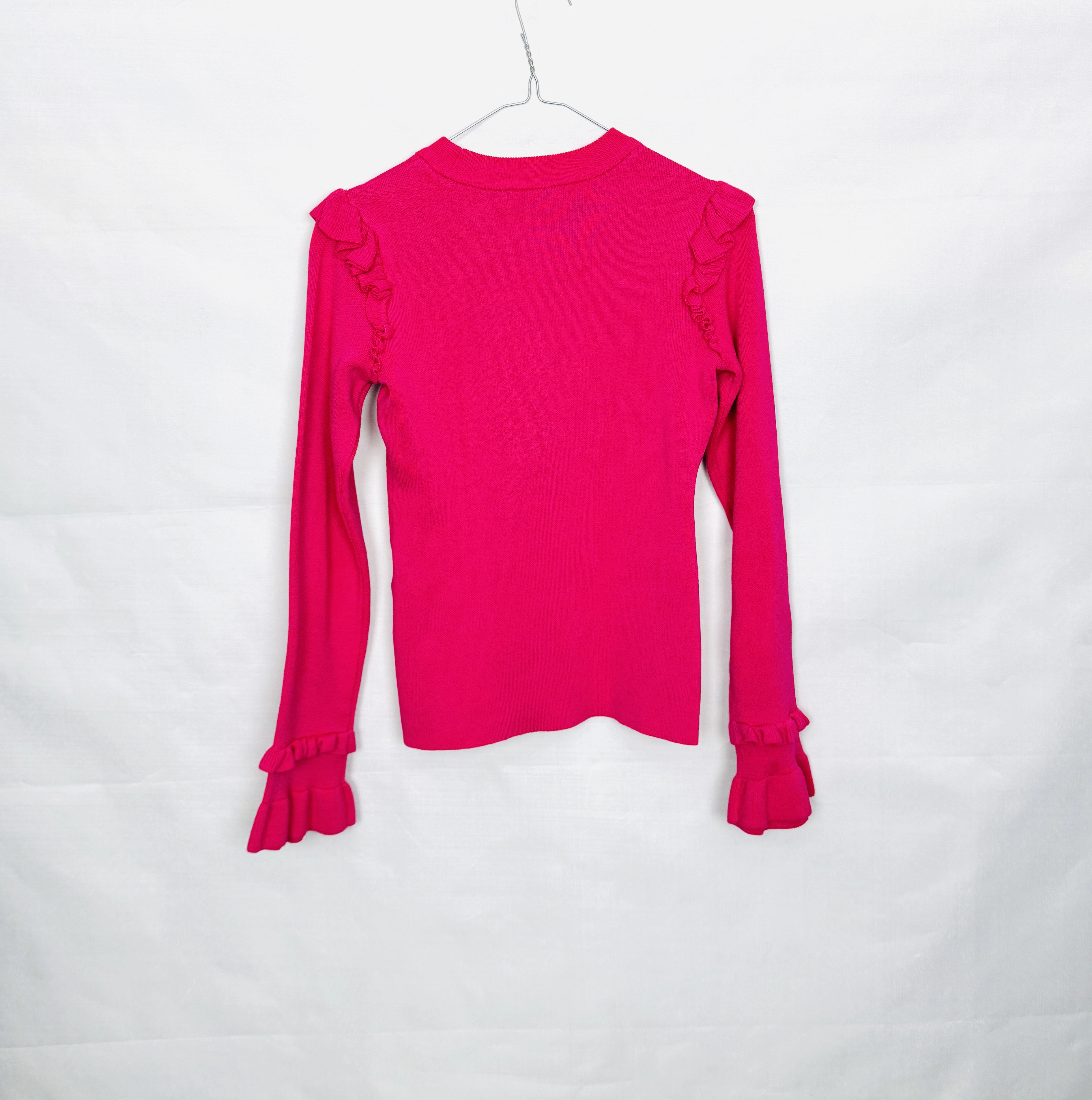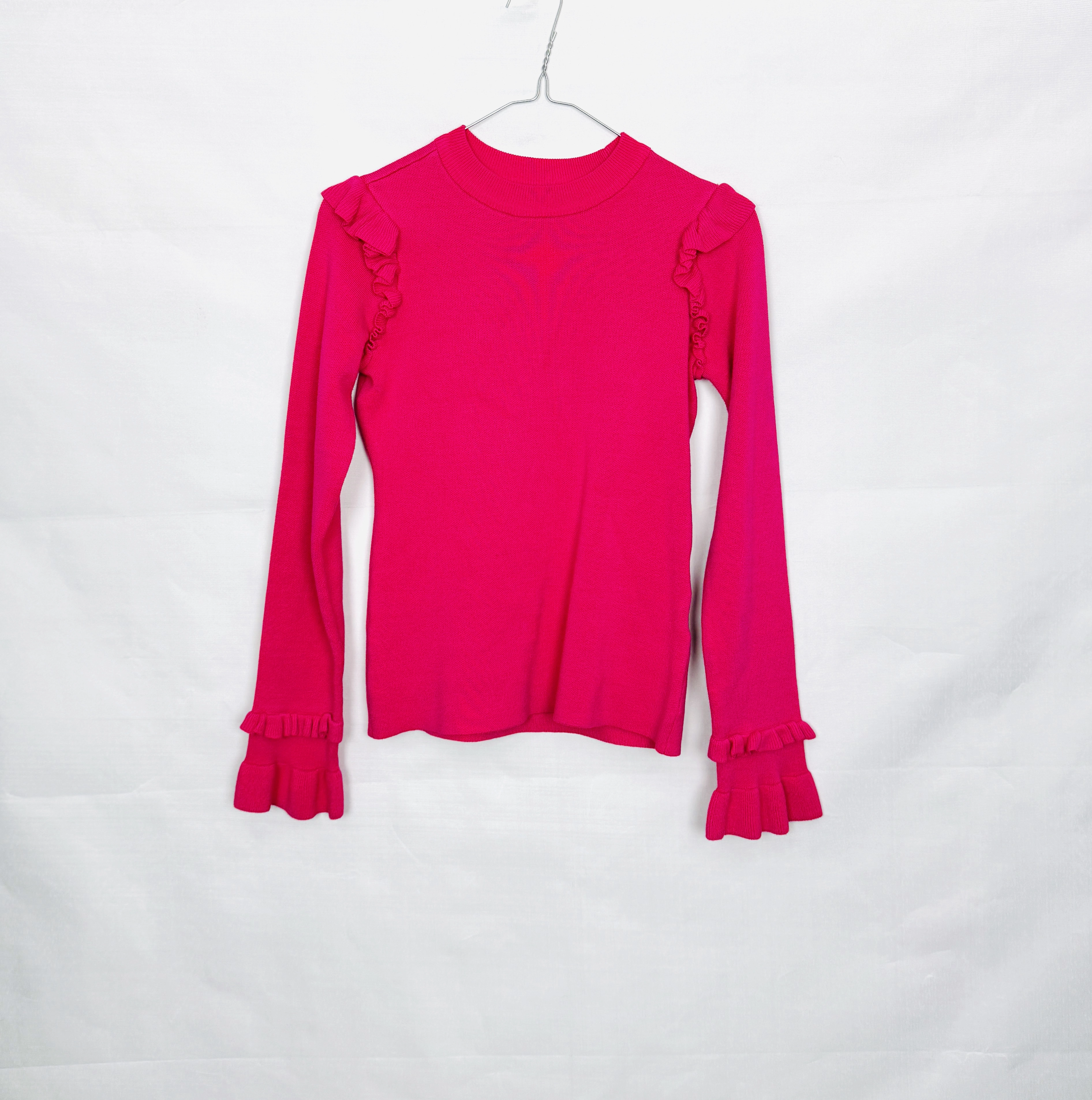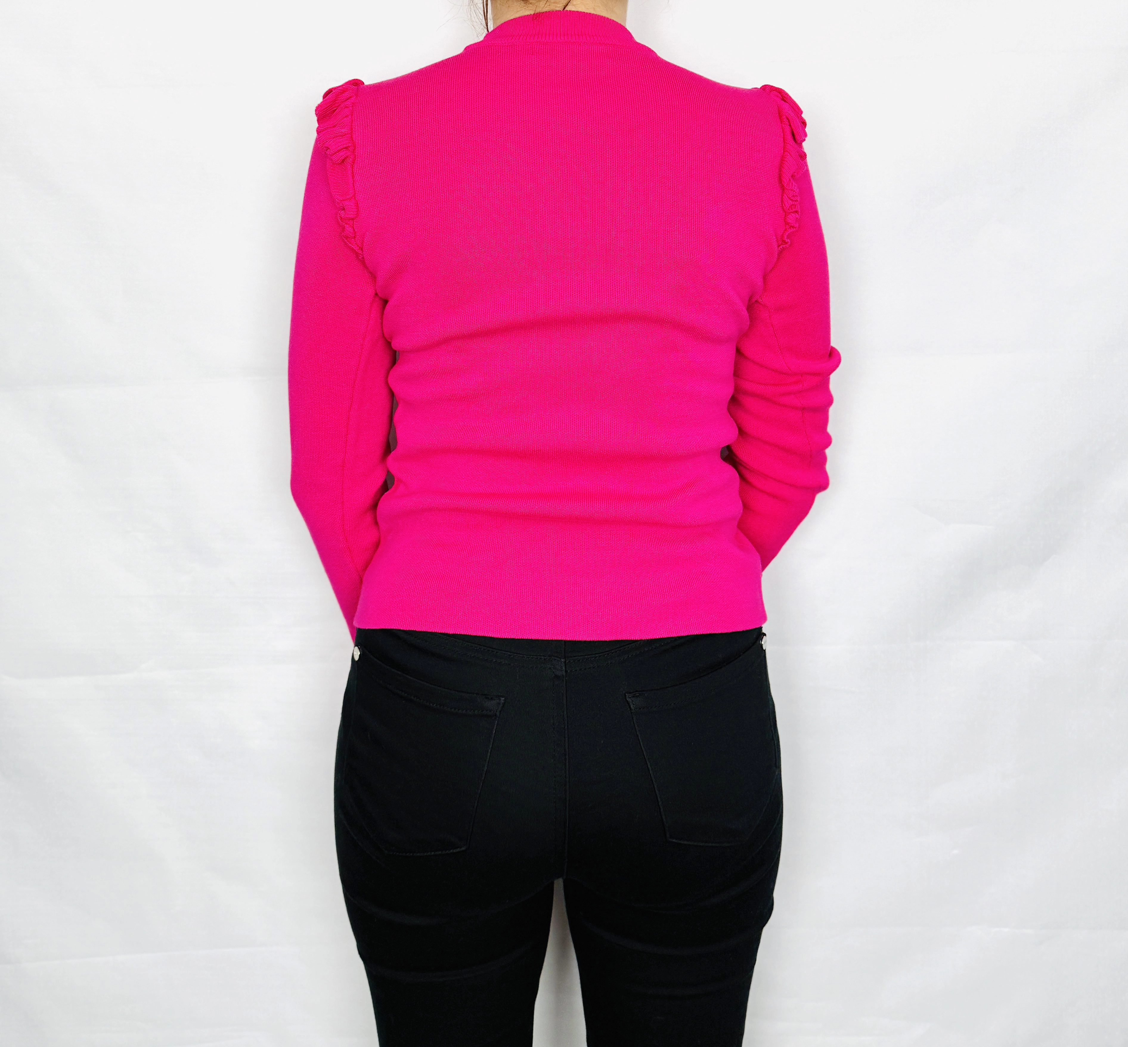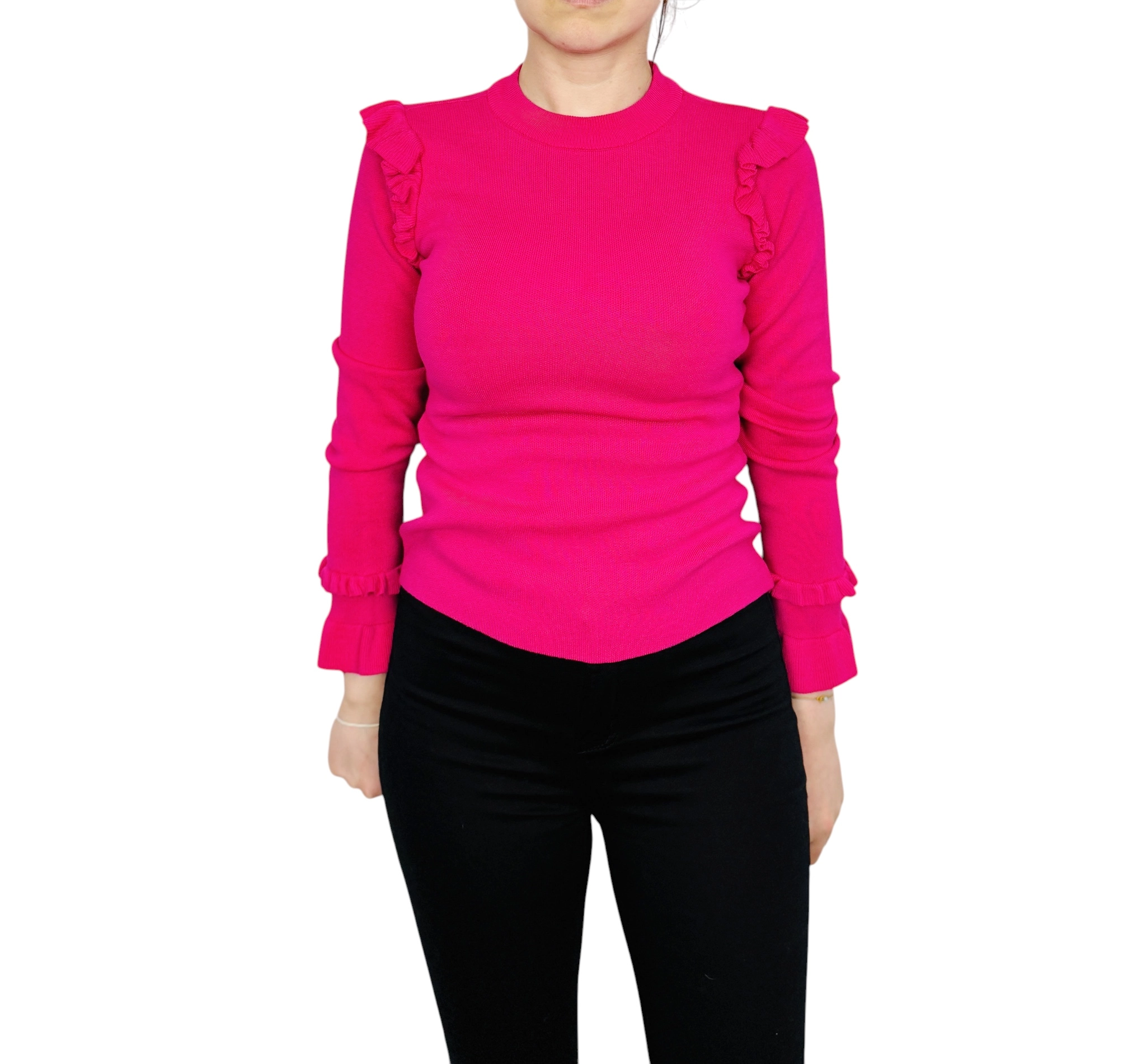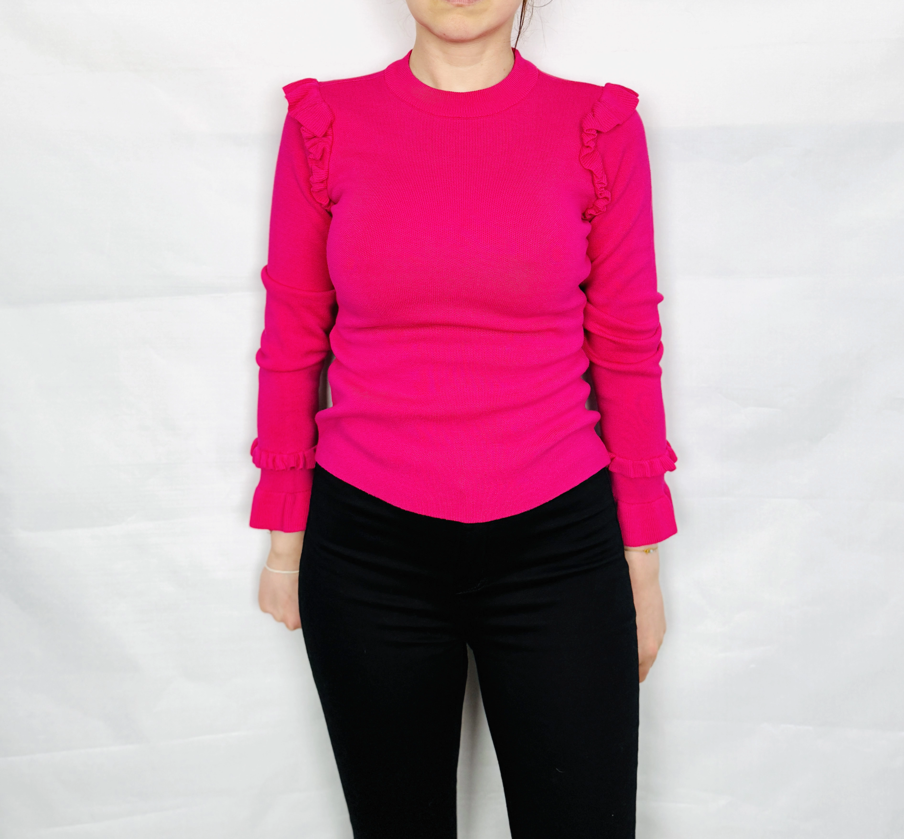Fason sweterka jest dopasowany i pięknie układa się na sylwetce, podkreślając jej naturalne kształty. Klasyczny, lekko zabudowany dekolt nadaje całości eleganckiego wykończenia, równoważąc intensywność koloru. Najbardziej charakterystycznym elementem są falbanki umieszczone przy ramionach, które subtelnie unoszą linię barków i dodają objętości górnej części sylwetki. Długie rękawy zakończone są efektownymi, rozkloszowanymi mankietami z delikatnym marszczeniem, co wprowadza do projektu lekkość i dynamiczny, kobiecy akcent. Materiał jest miękki, przyjemny i lekko elastyczny, dzięki czemu sweterek dopasowuje się do ciała, zapewniając komfort noszenia.