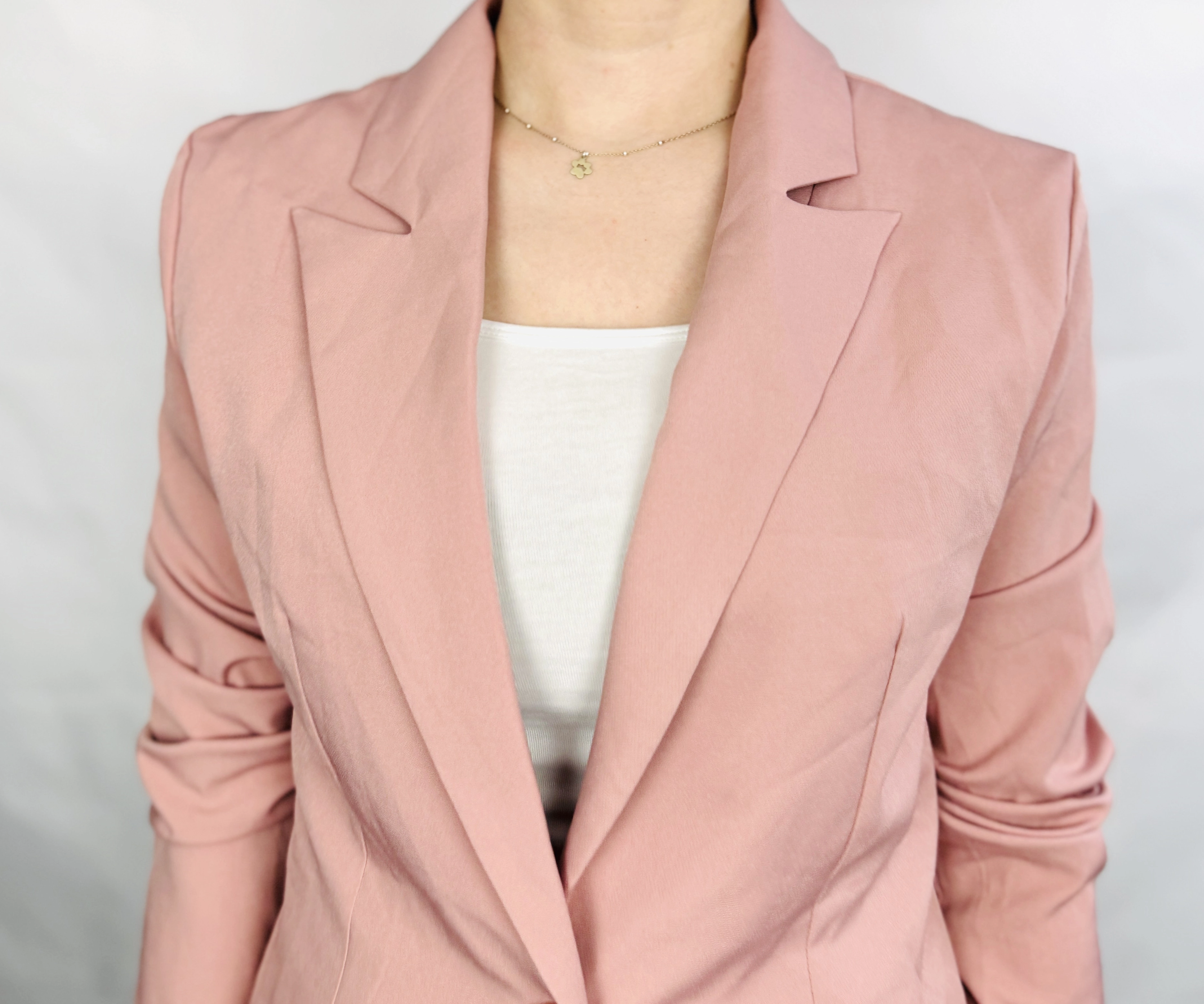 To żakiet o delikatnie kobiecym i świeżym charakterze, który łączy klasyczną elegancję z subtelną, nowoczesną lekkością. Różowy odcień nadaje mu łagodnego wyrazu, który rozświetla stylizację, a jednocześnie pozostaje wyrafinowany i kobiecy. To propozycja dla osób poszukujących marynarki, która dodaje szyku, nie tracąc przy tym subtelności i uniwersalności — idealna zarówno na cieplejsze dni, jak i do warstwowych zestawów.