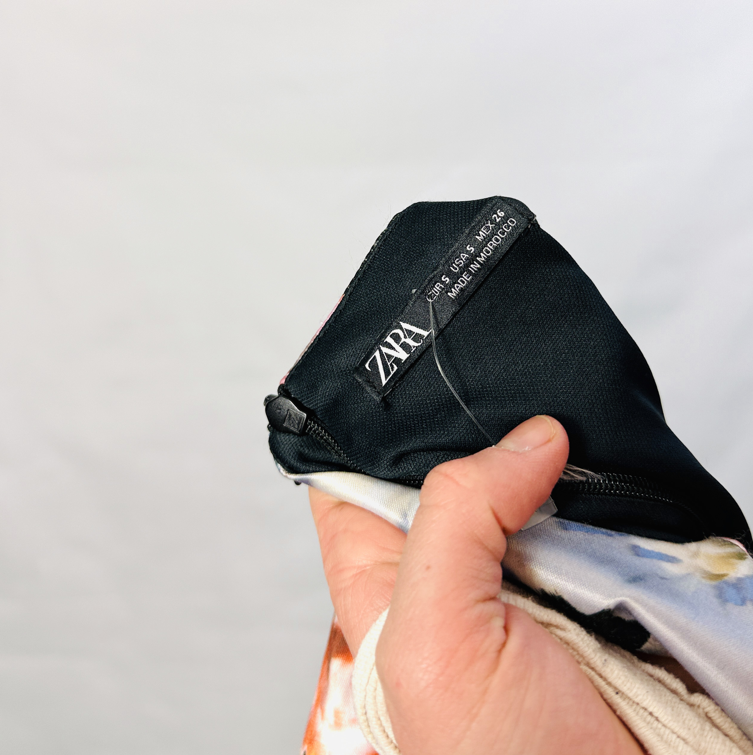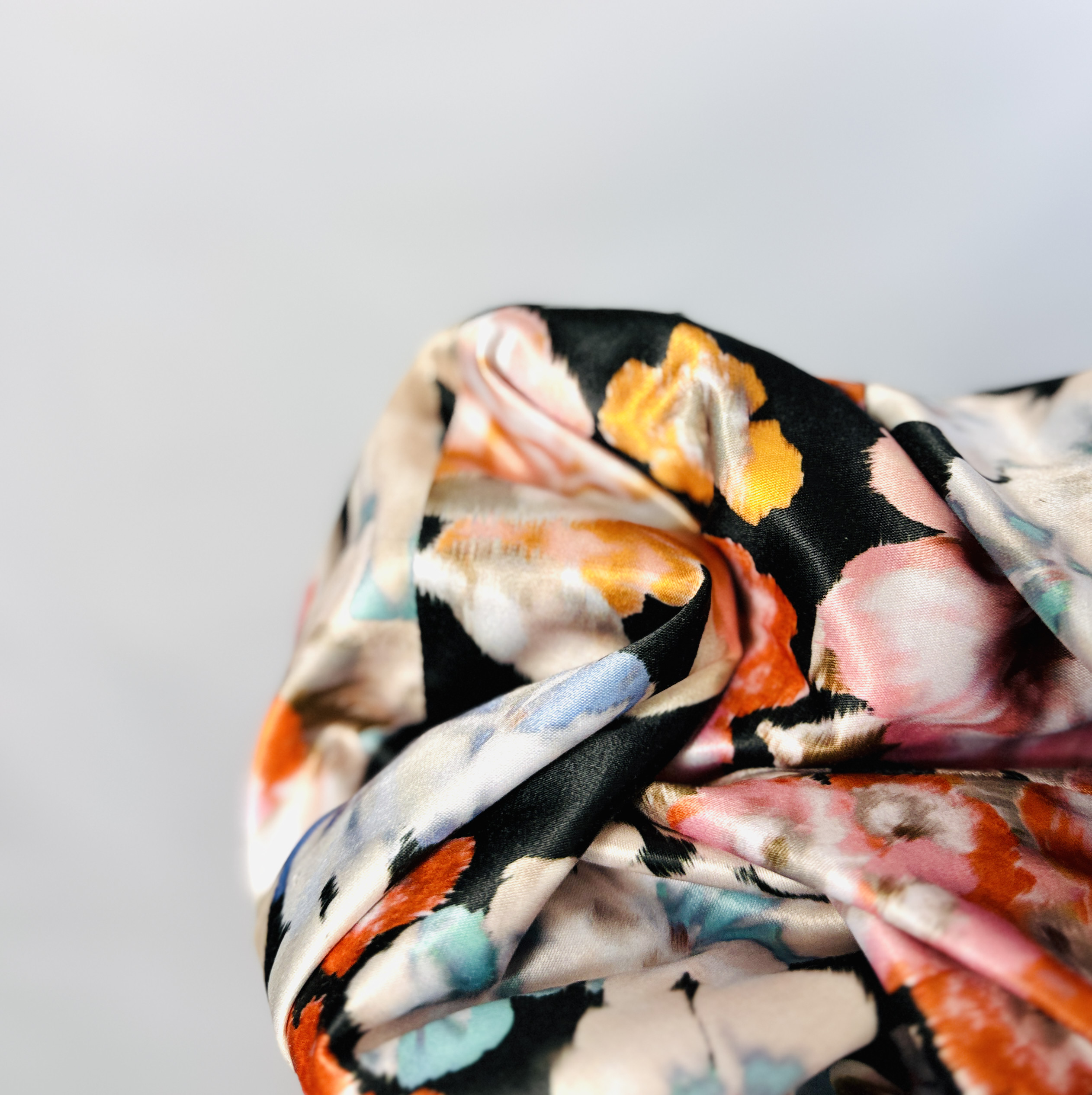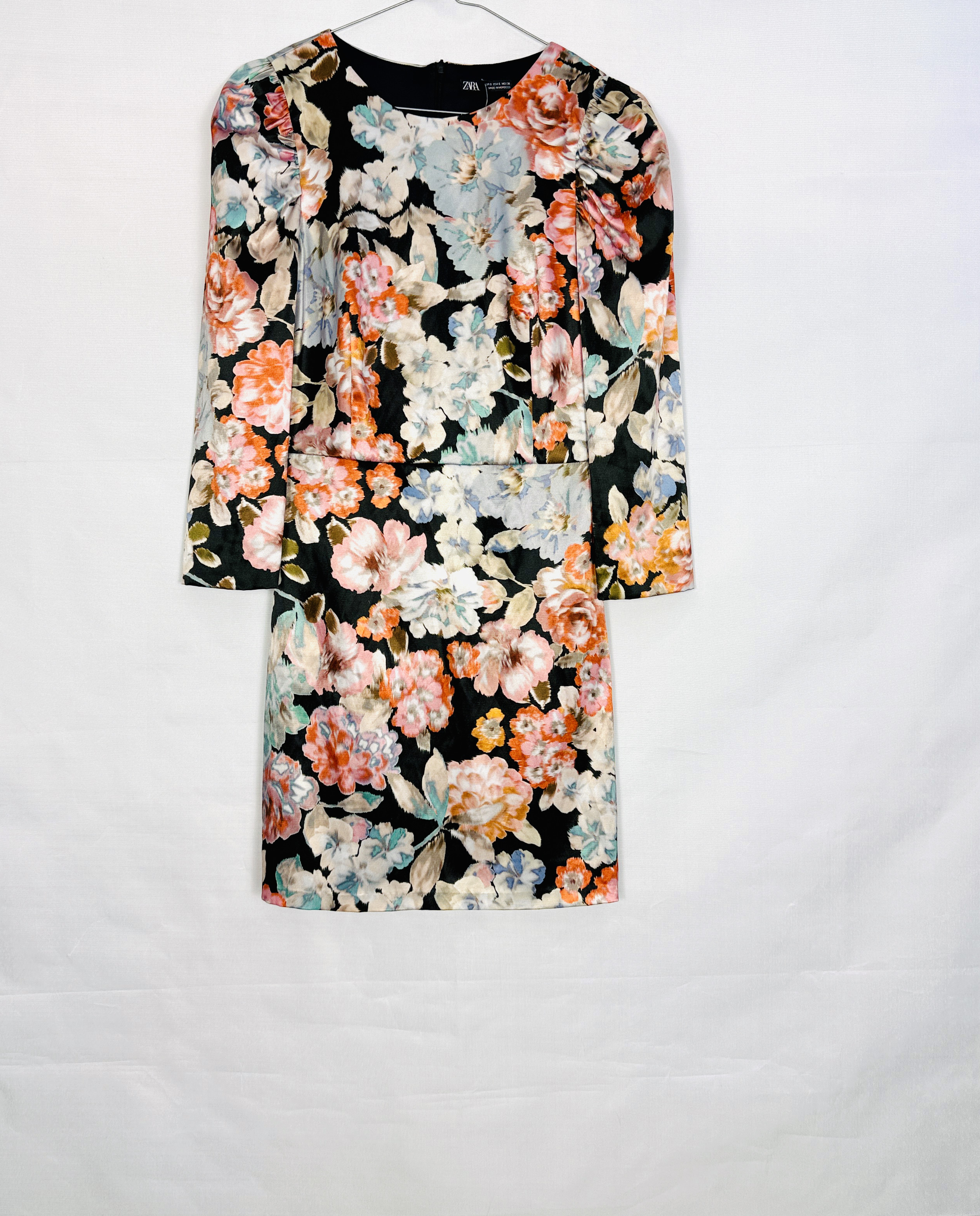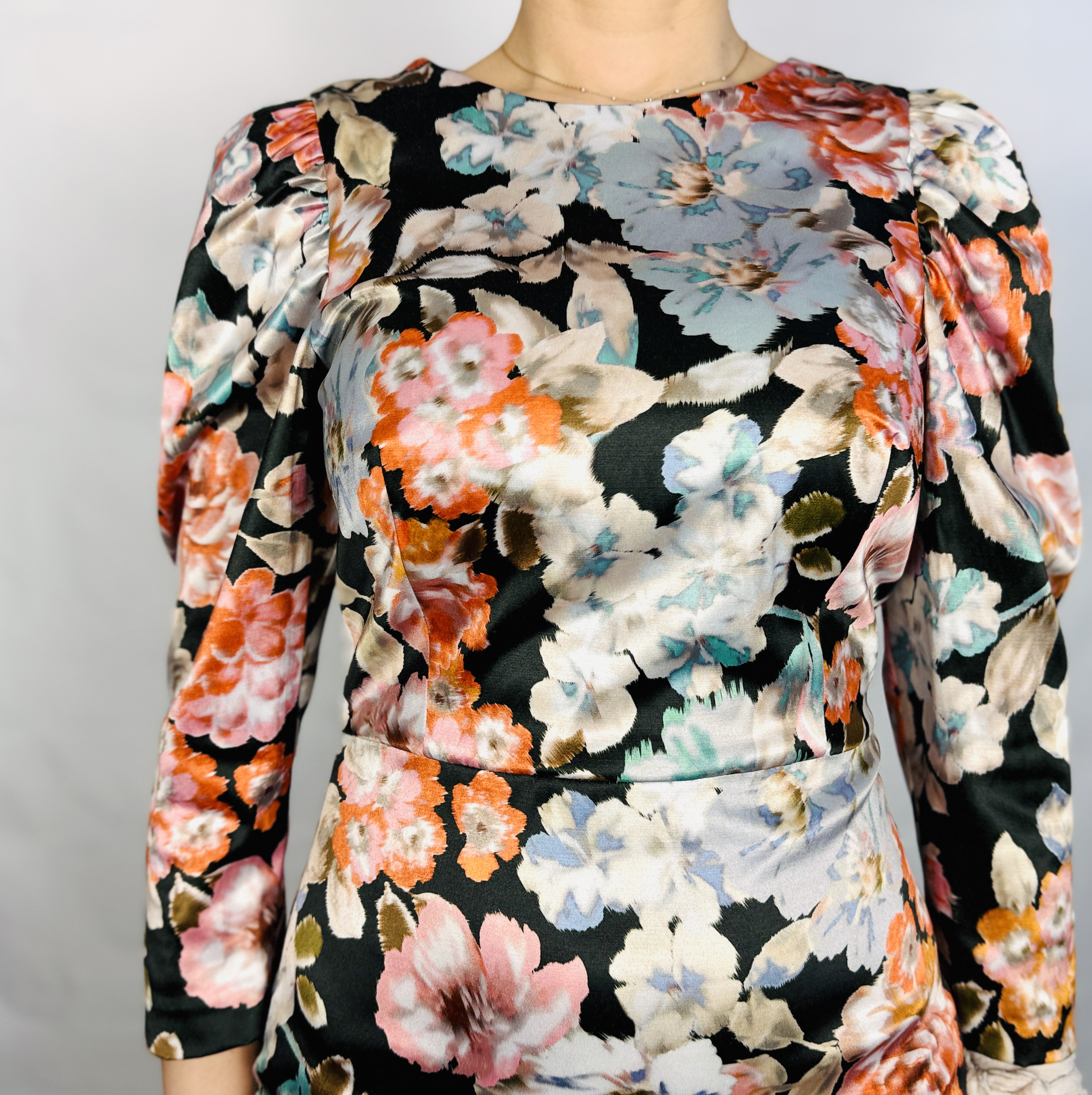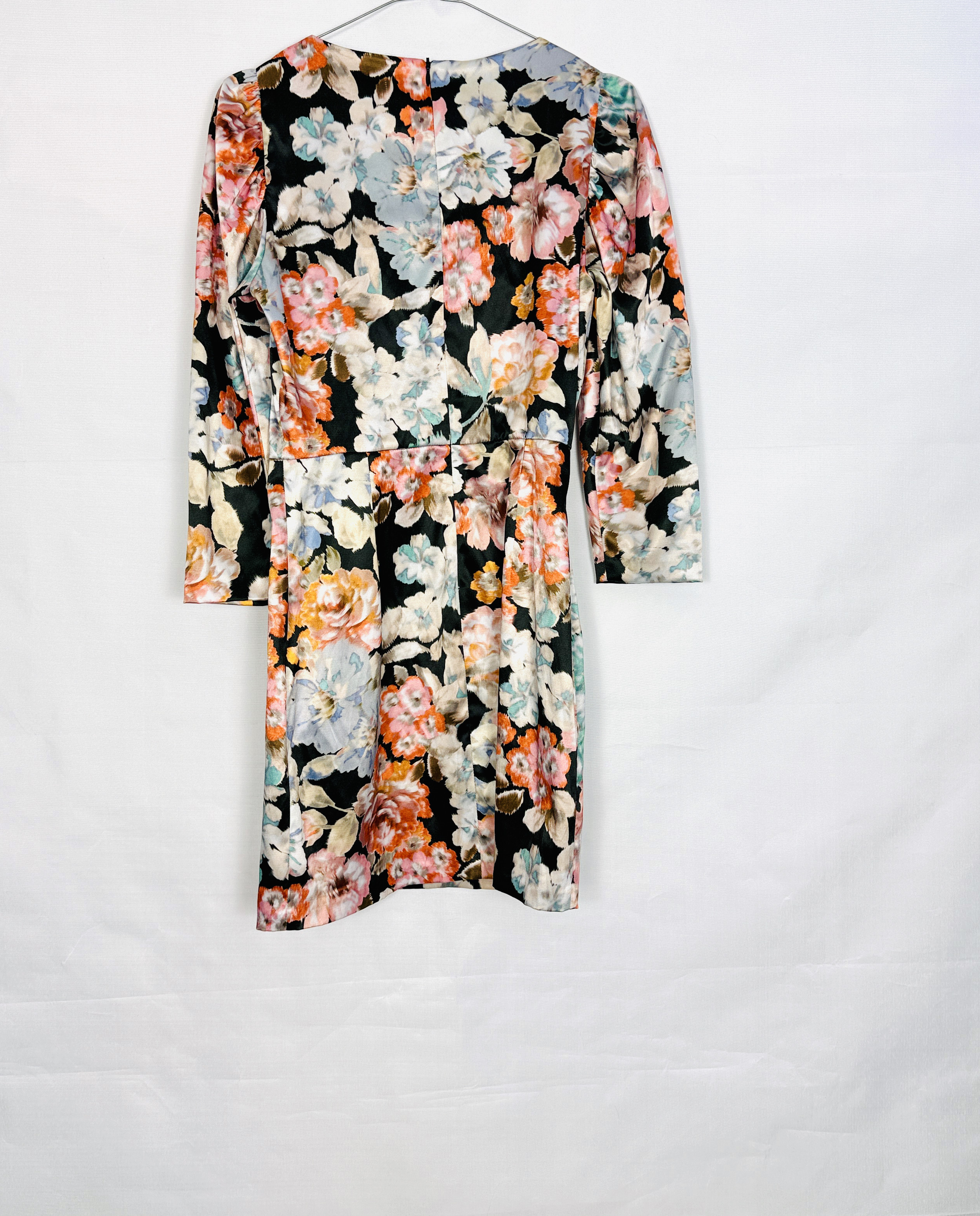 Ta sukienka to połączenie romantycznej lekkości i wieczorowego blasku; bogaty, kwiatowy wzór na głębokiej, czarnej bazie nadaje projektowi wyrazistej, kobiecej osobowości, a jednocześnie zachowuje świeżość i delikatność. Całość emanuje subtelną elegancją — to propozycja dla tych, które chcą wyglądać zmysłowo, ale z klasą. Kwiaty w odcieniach brzoskwini, pudrowego różu i chłodnego niebieskiego otoczone są liśćmi w stonowanej zieleni, co tworzy harmonijną paletę kolorystyczną i sprawia, że sukienka przyciąga spojrzenia bez efektu przesady.
